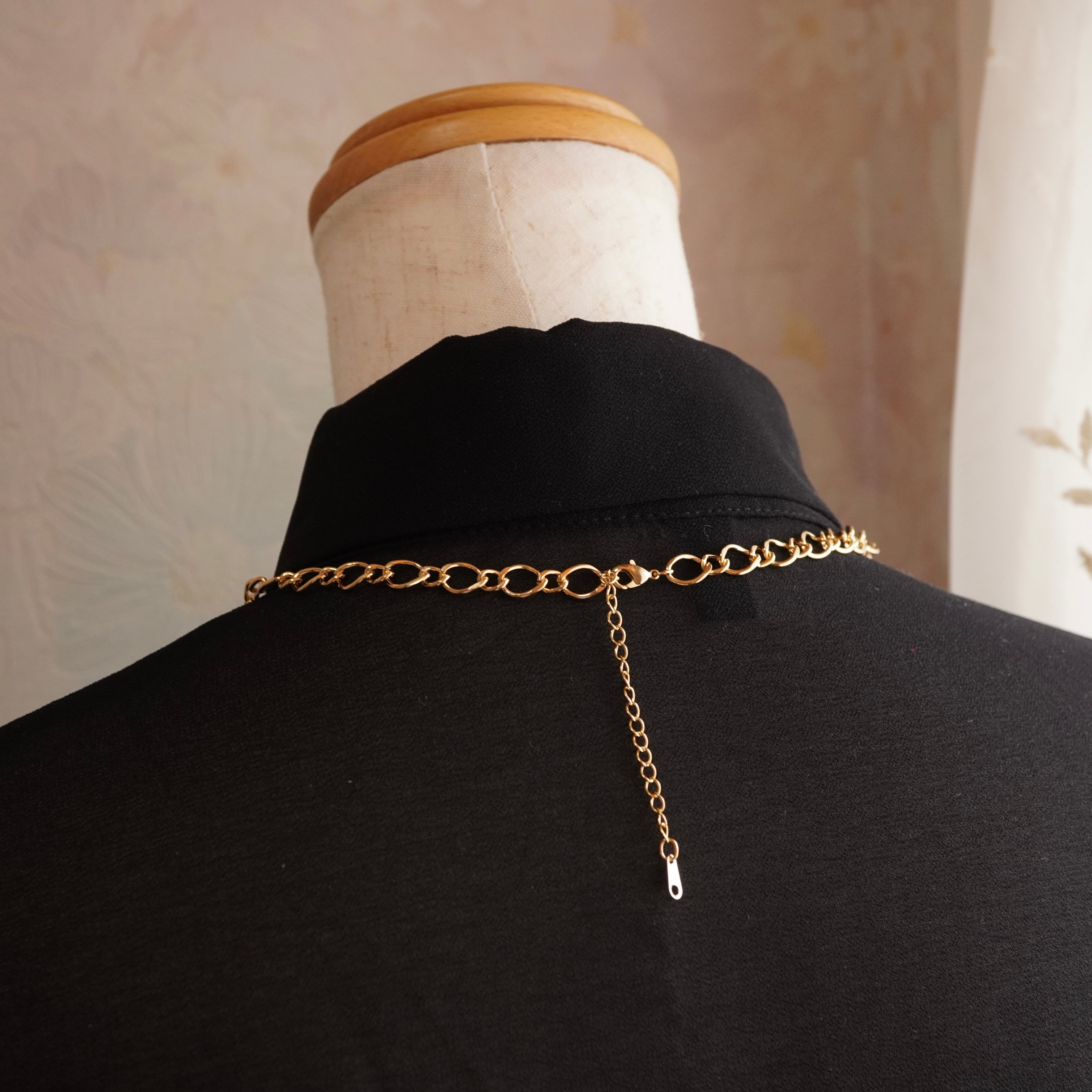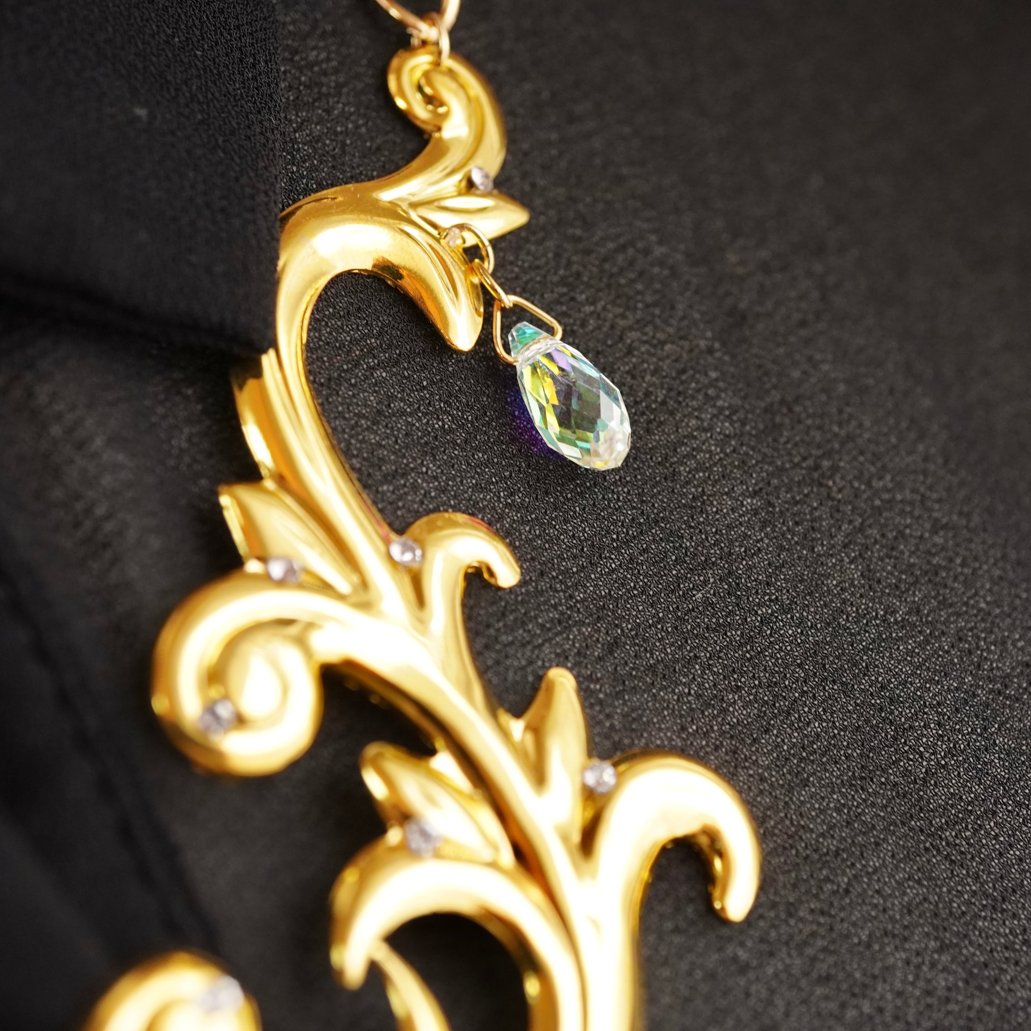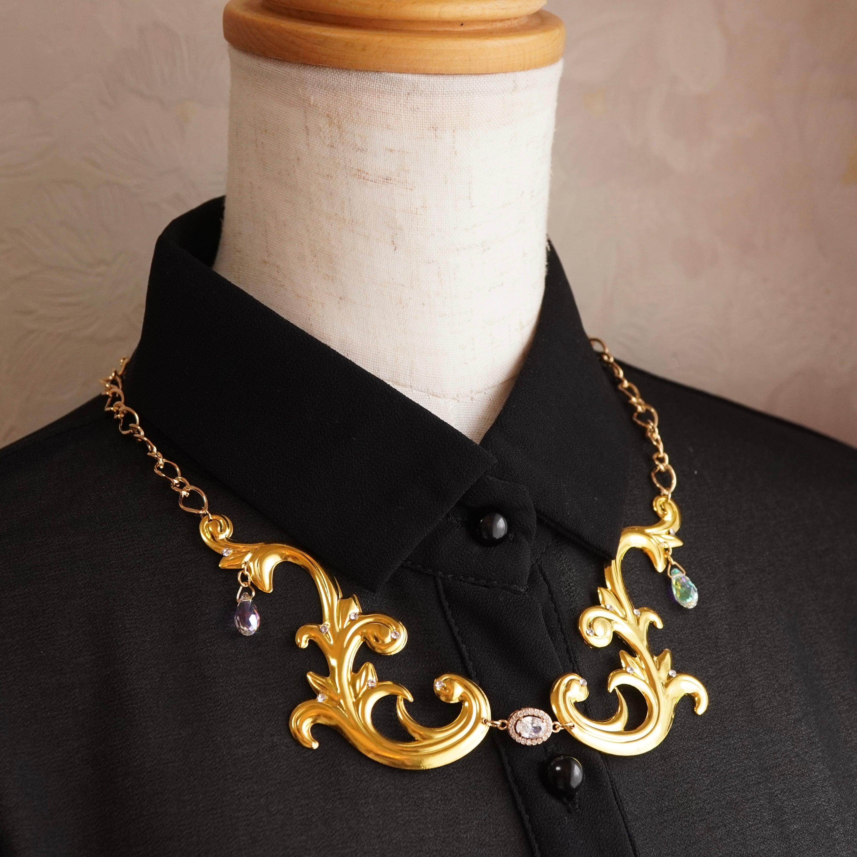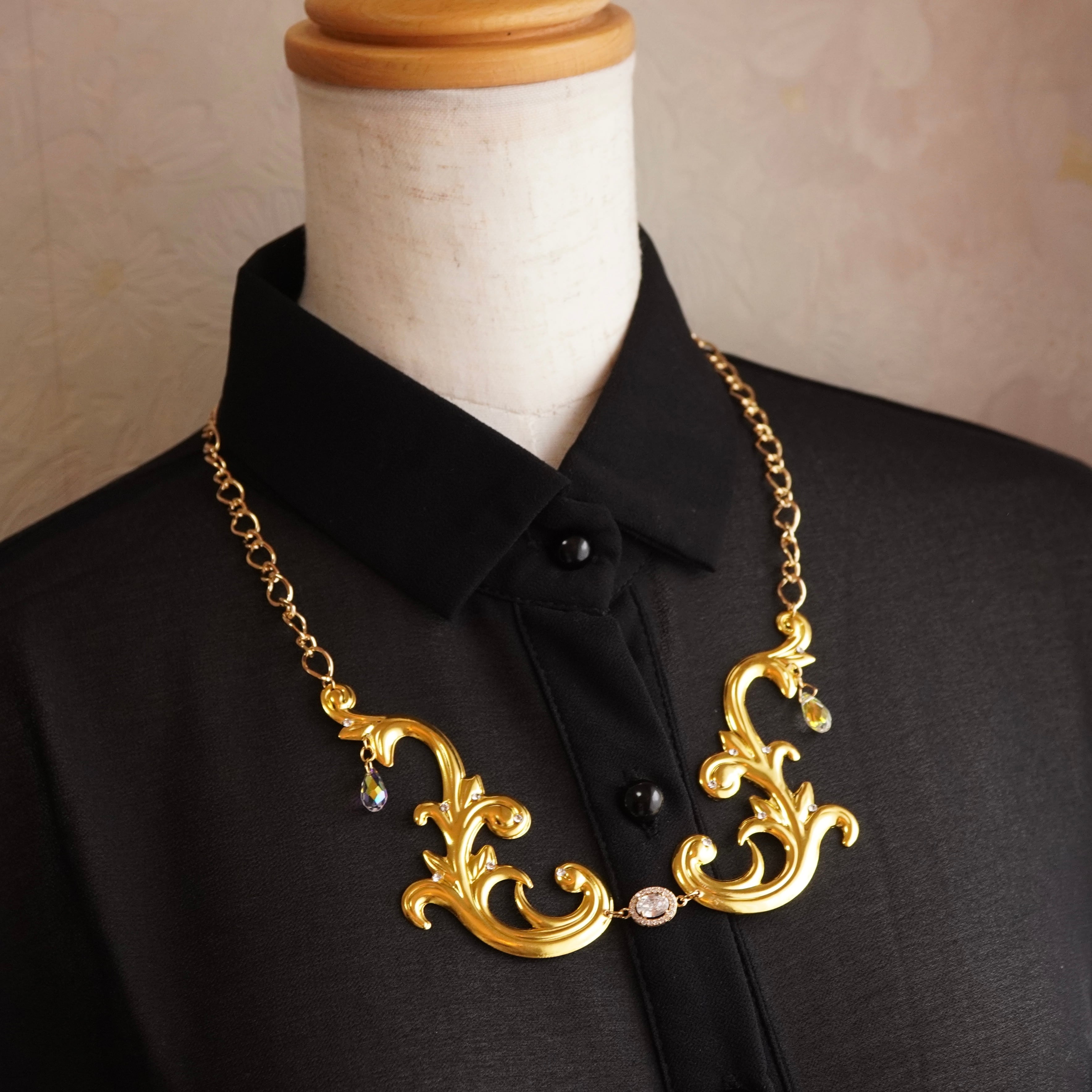 家具の装飾用のレリーフパーツをネックレスにアレンジしました。釘用の穴はキラキラのストーンで埋めてより華やかに仕上げました。