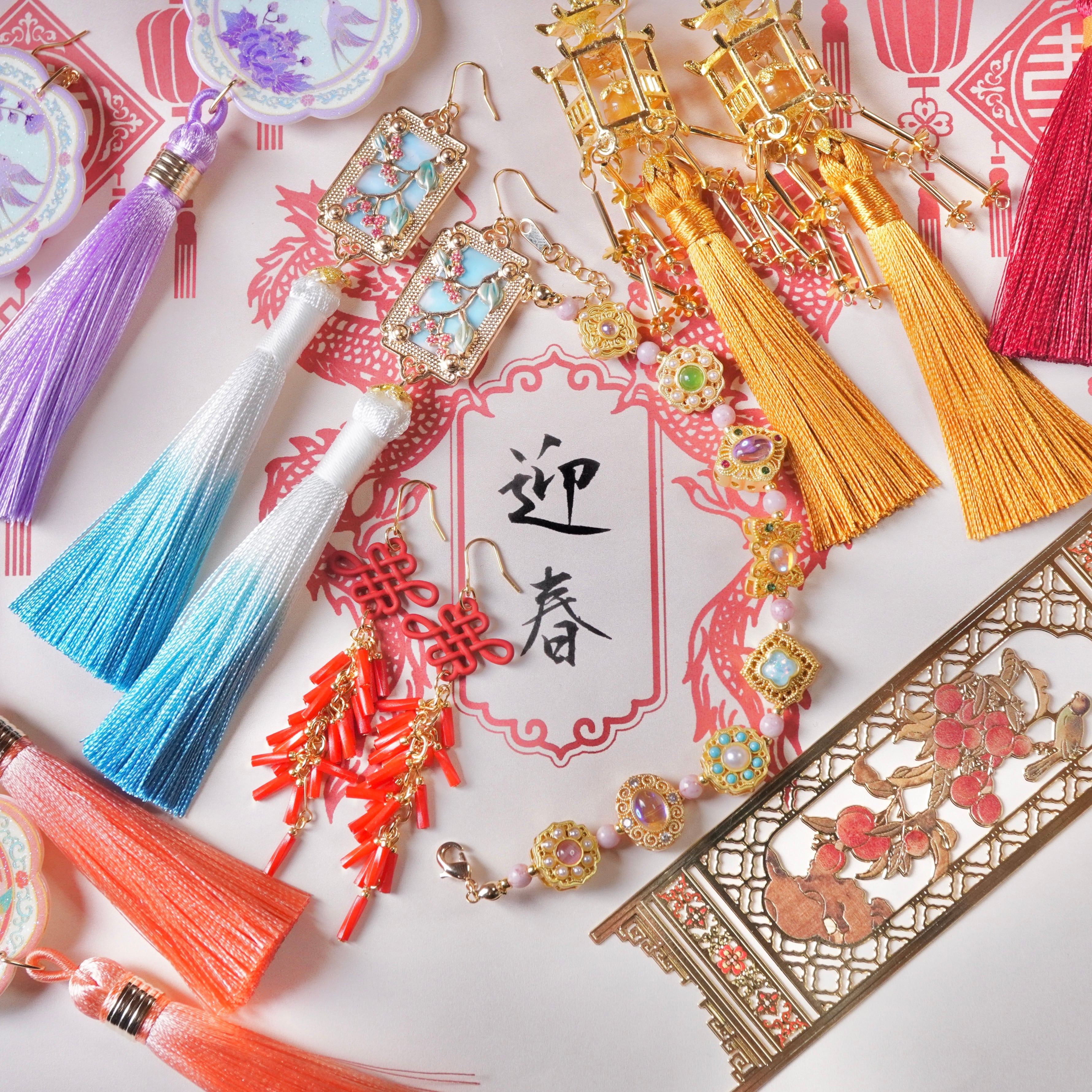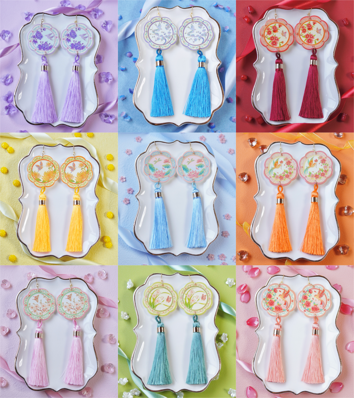 ミニチュアの絵皿にタッセルを合わせてピアス/イヤリングに仕上げました