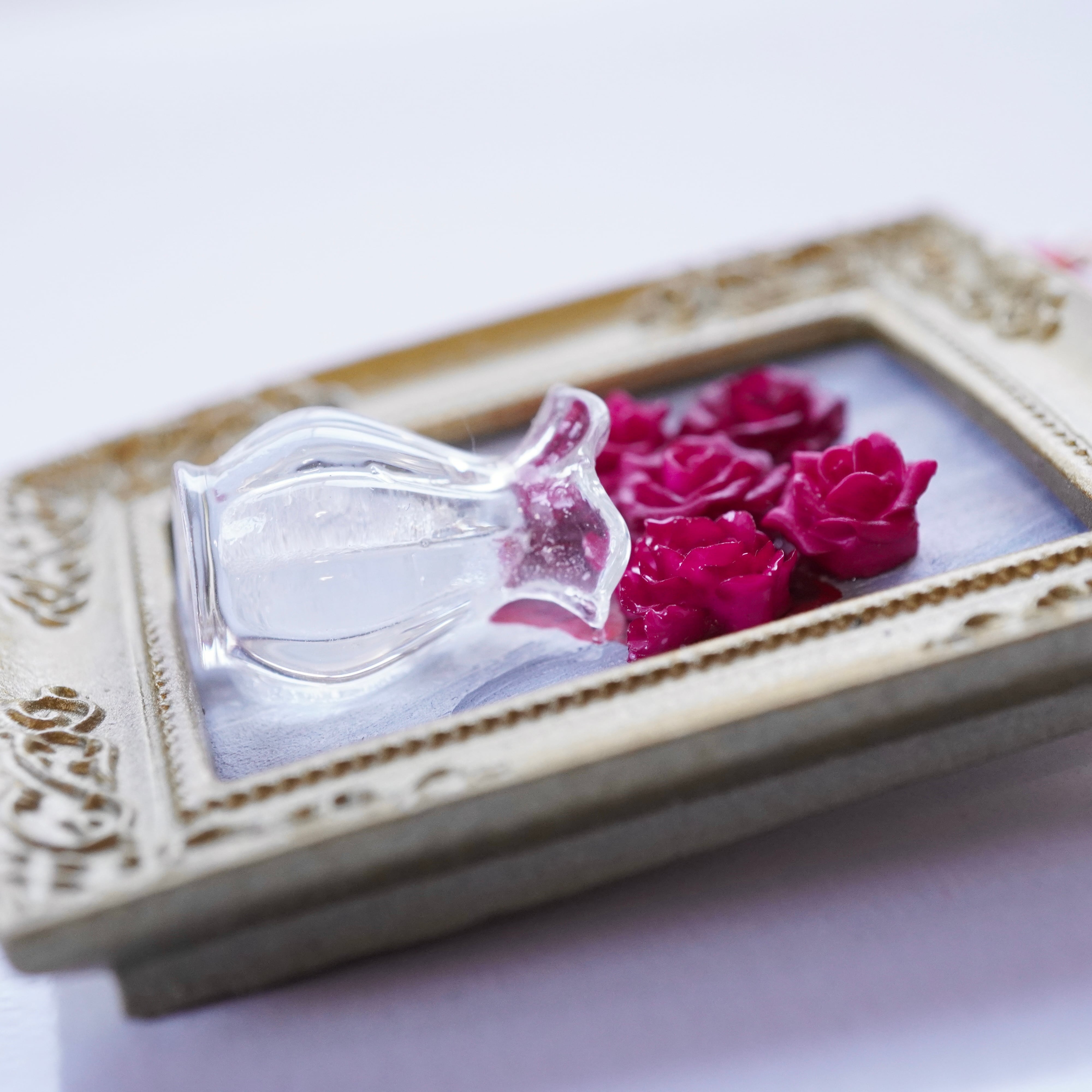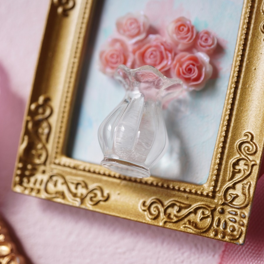 透明の花瓶は額縁から飛び出て見えるように配置し、ゴールドの額縁は装飾が細かいものを選びました