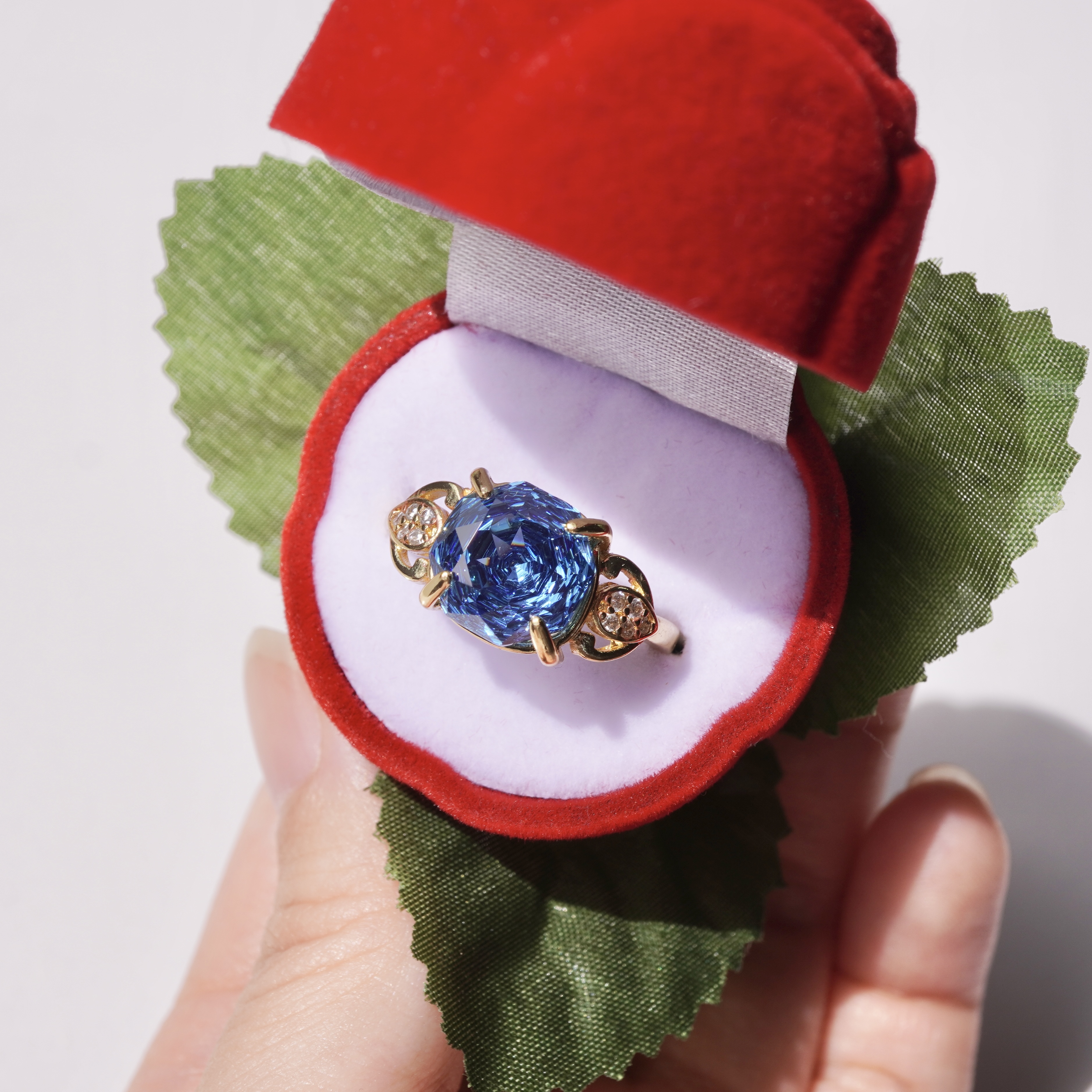 葉っぱをイメージした台座も、細かいジルコニアでキラキラ輝きます