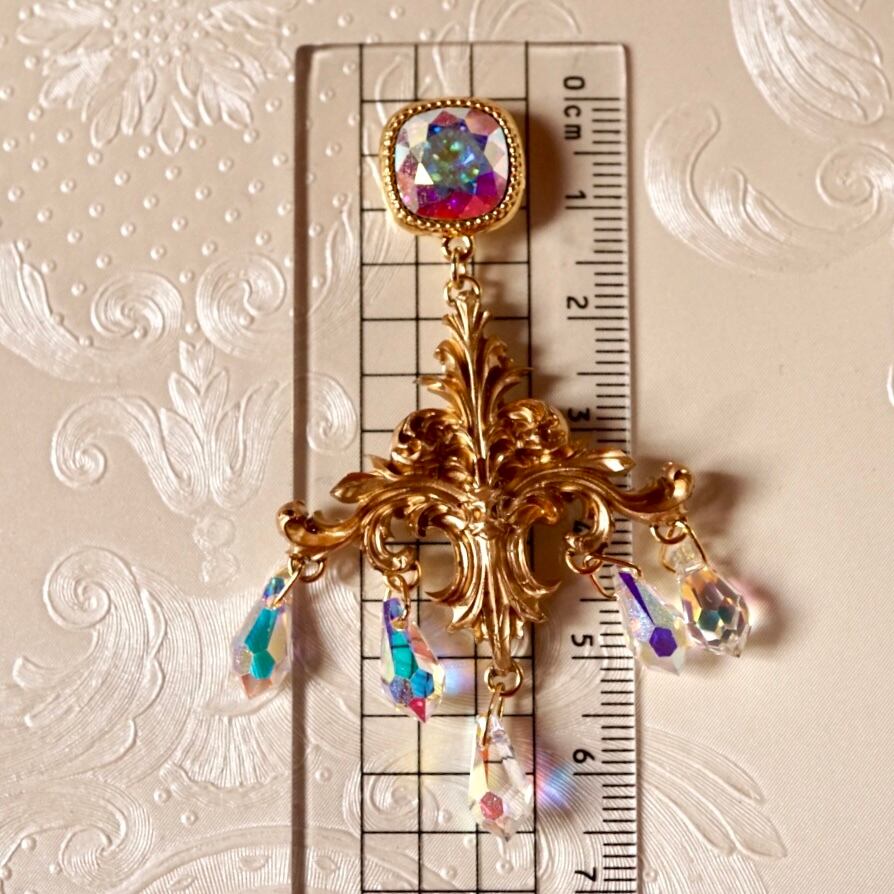 シャンデリアをイメージして作ったピアス/イヤリングです。繊細で緻密に作ったゴールドのパーツに、七色に輝くクリスタルを合わせました。舞踏会のようなとびきりゴージャスな耳元を!