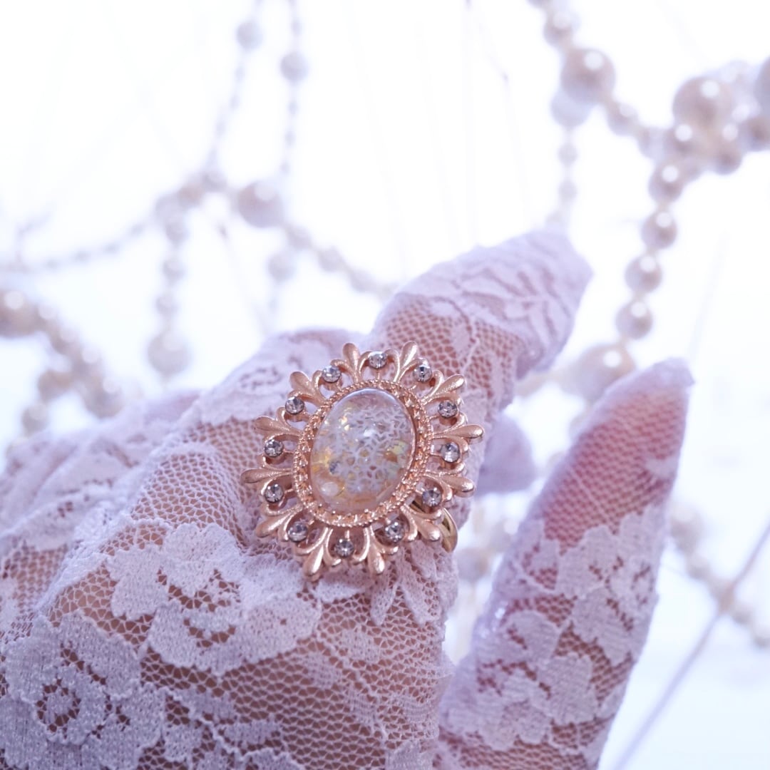 氷の魔法を閉じ込めたリングです。繊細な雪の結晶と細かい粉雪をスノードームのように仕立てました。