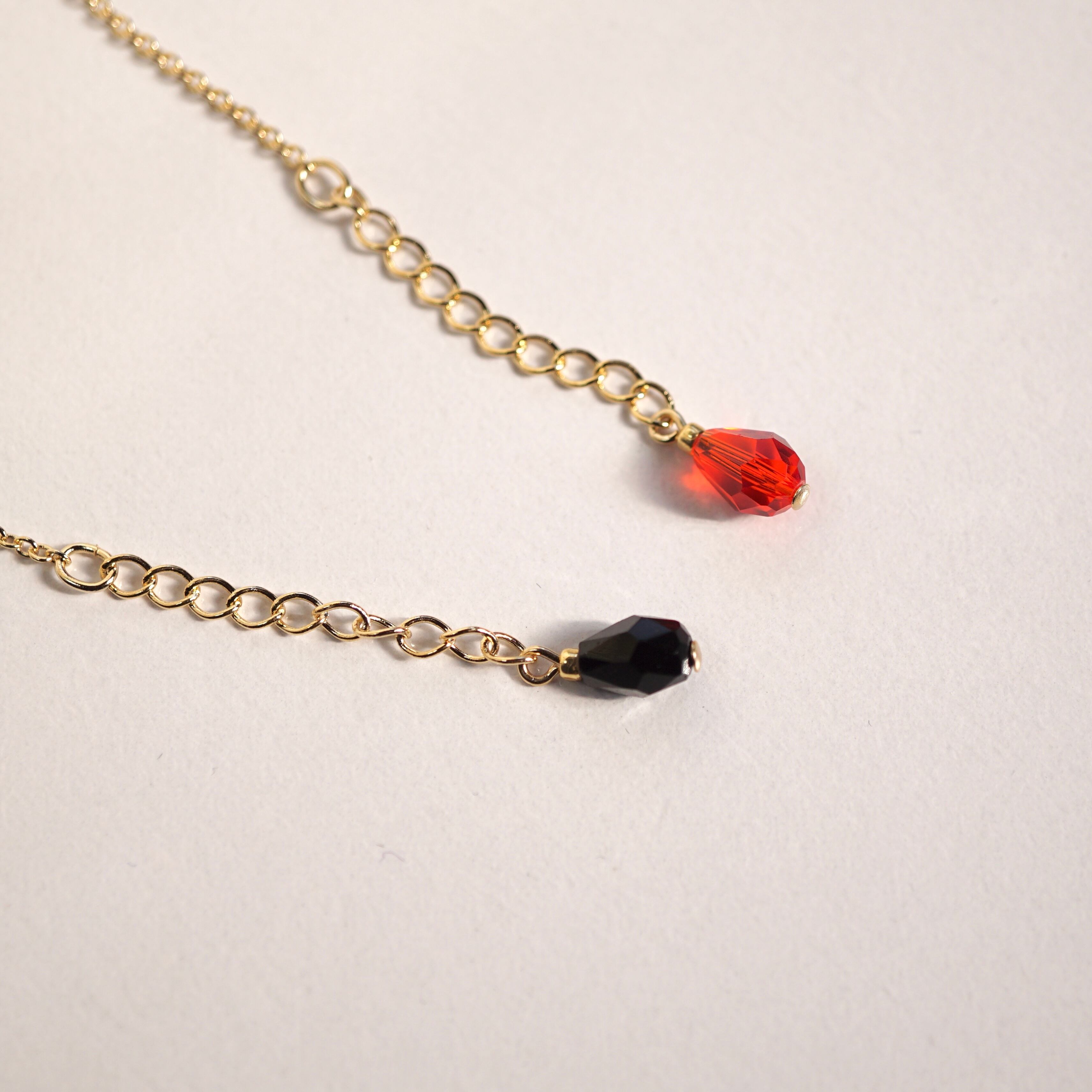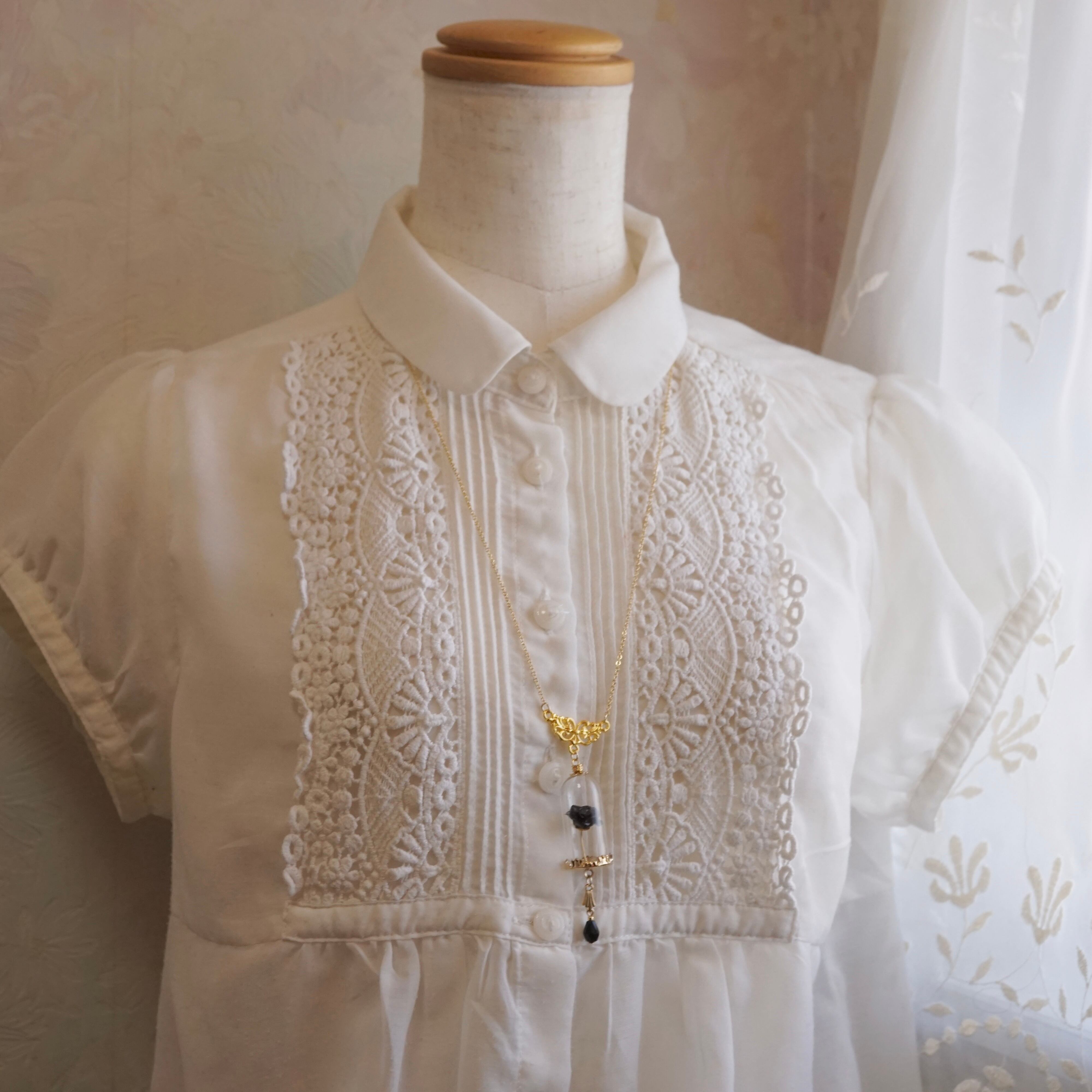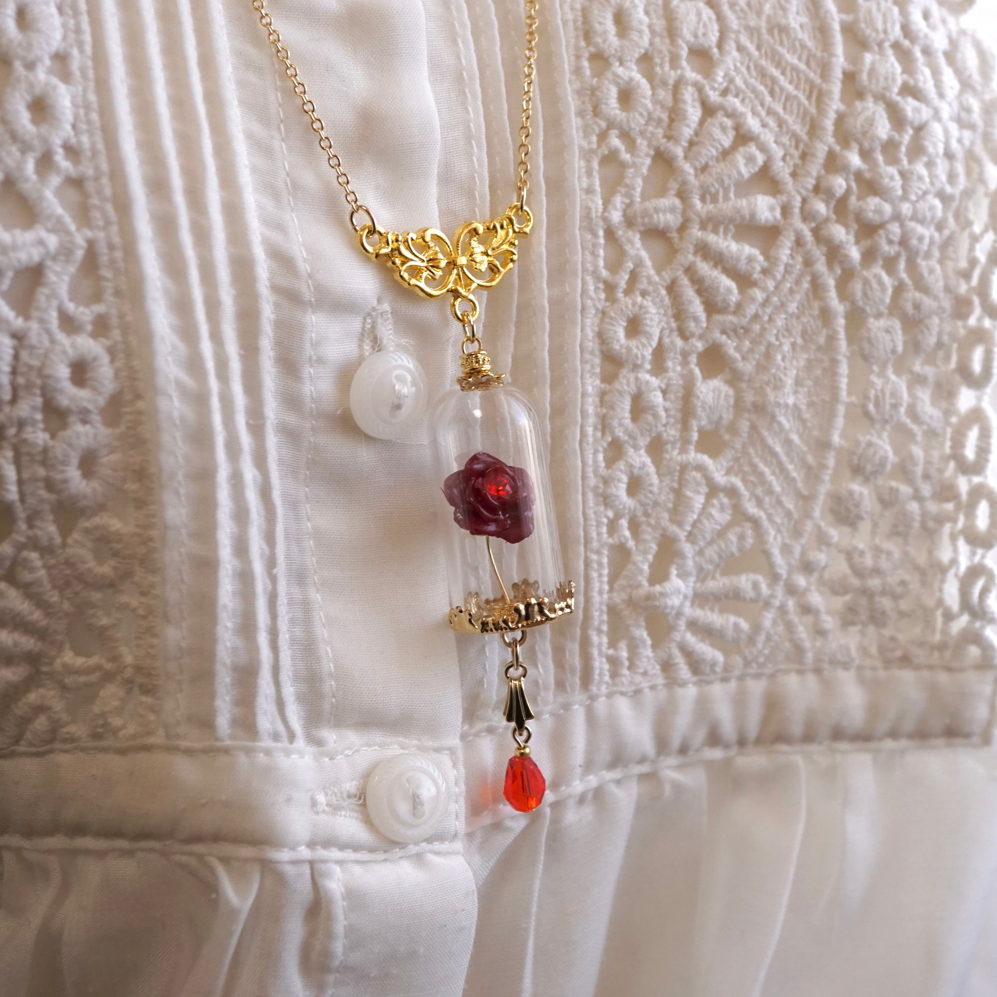 宝石を宿した薔薇を標本にし、ネックレスに仕立てました。同じ色のクリスタルを合わせて、アジャスターの先にもクリスタルを一粒つけました。美しい薔薇たちを鑑賞できるように360°見えるガラス管を使っています、儚くも美しい薔薇と宝石をぜひ堪能してください♡