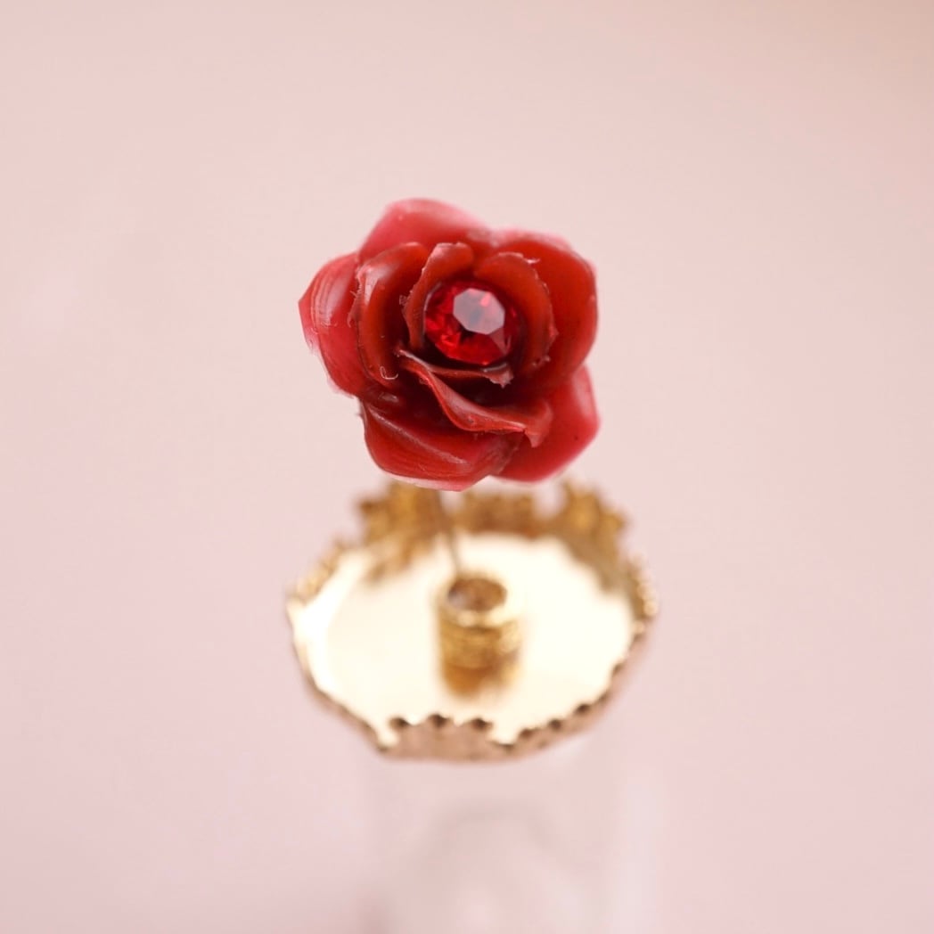 ルビー色の宝石を宿した薔薇です。宝石に合わせて花びらもボルドー色で仕上げました。