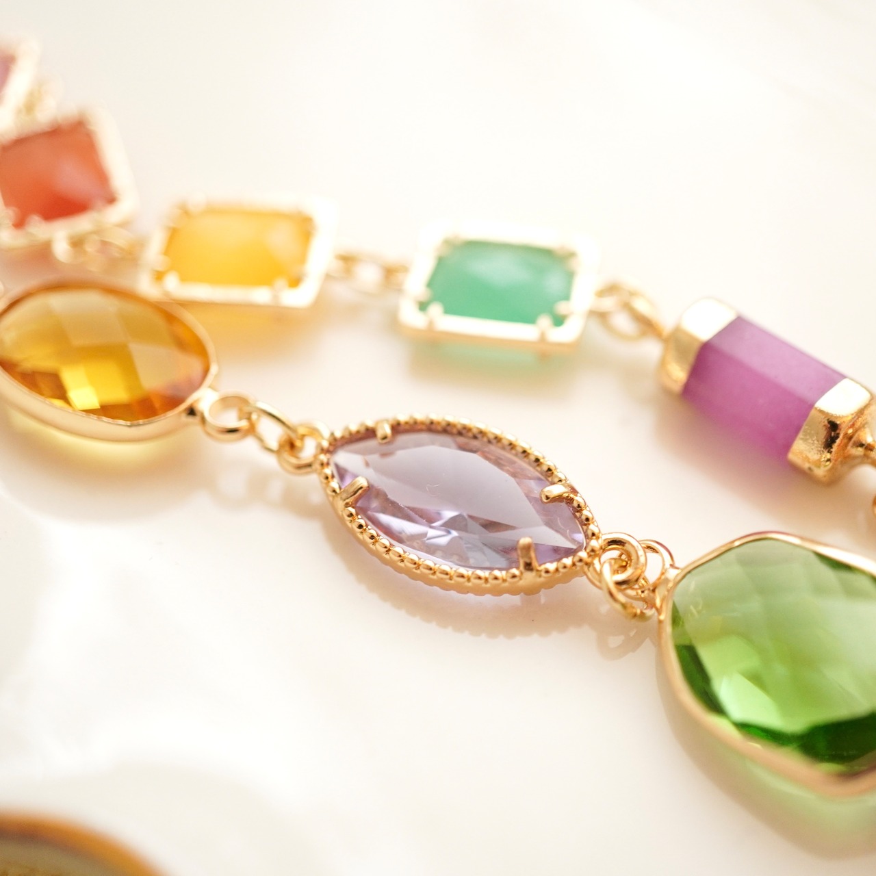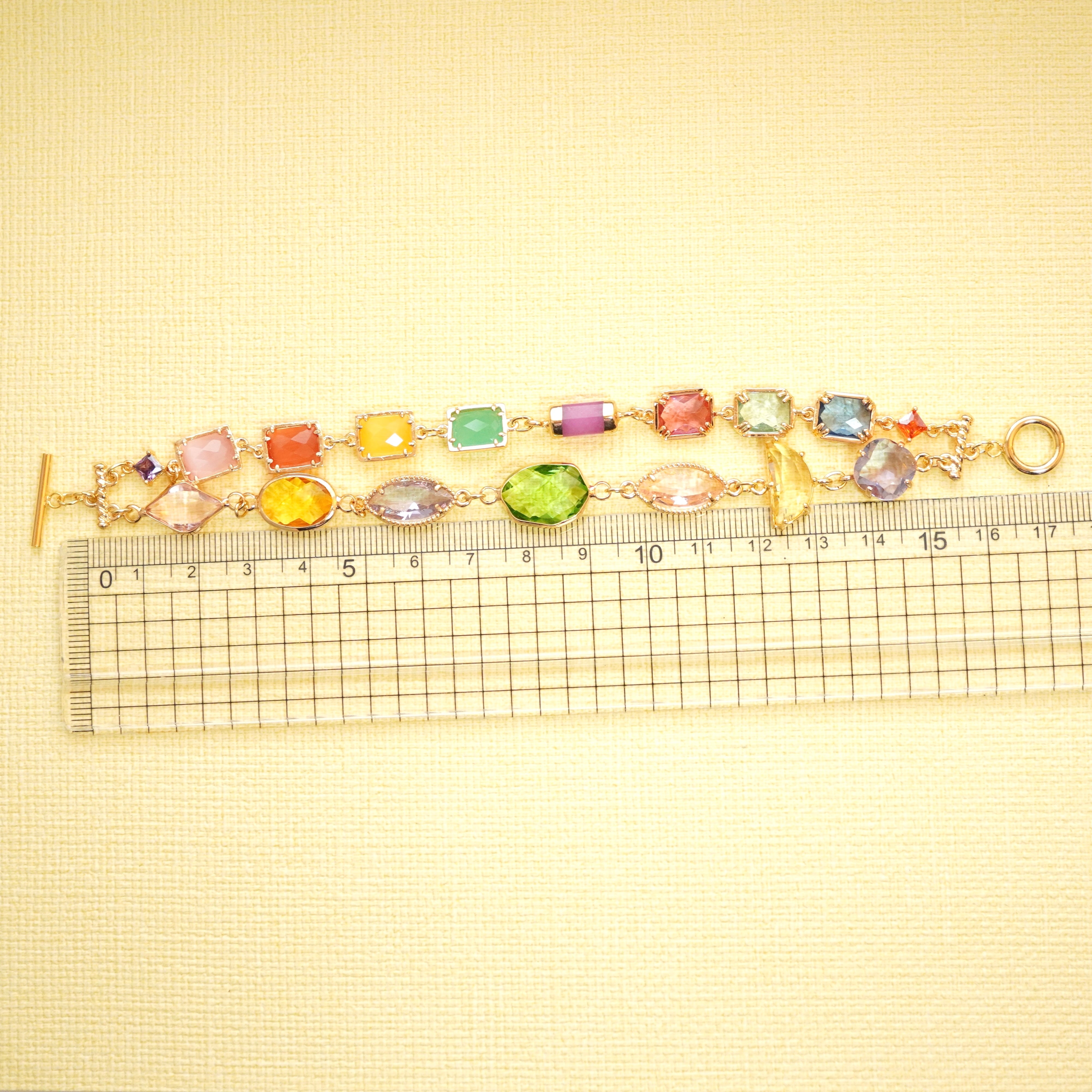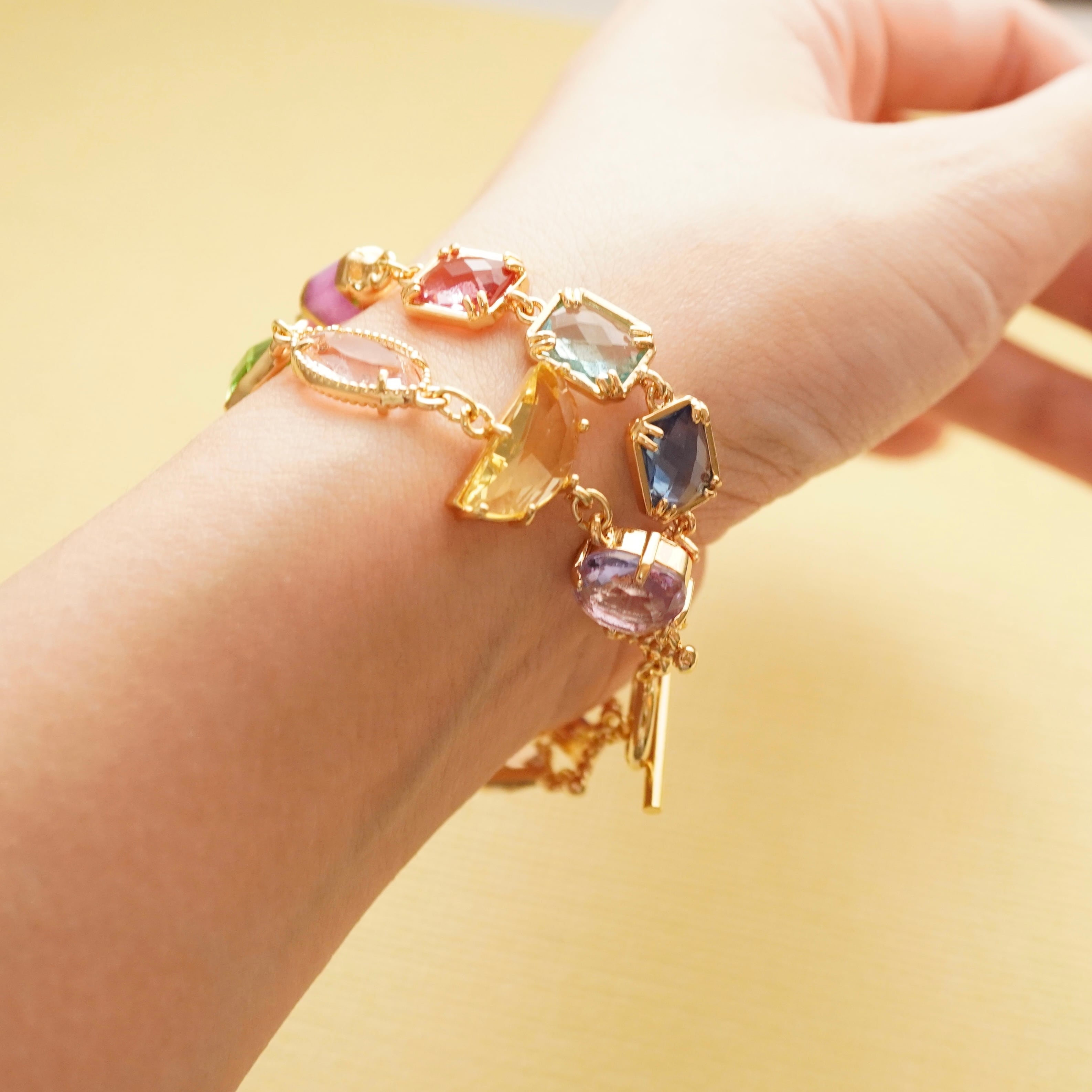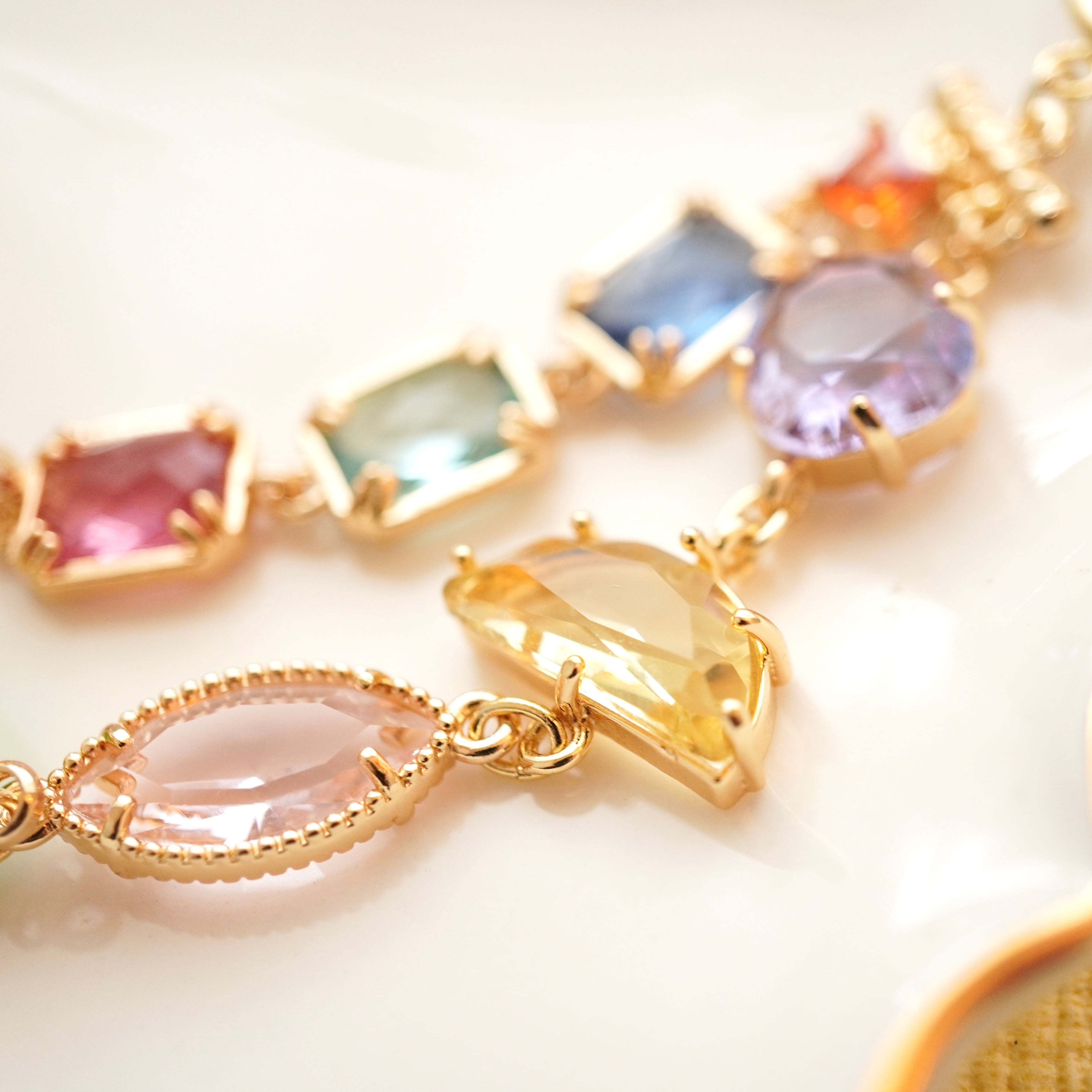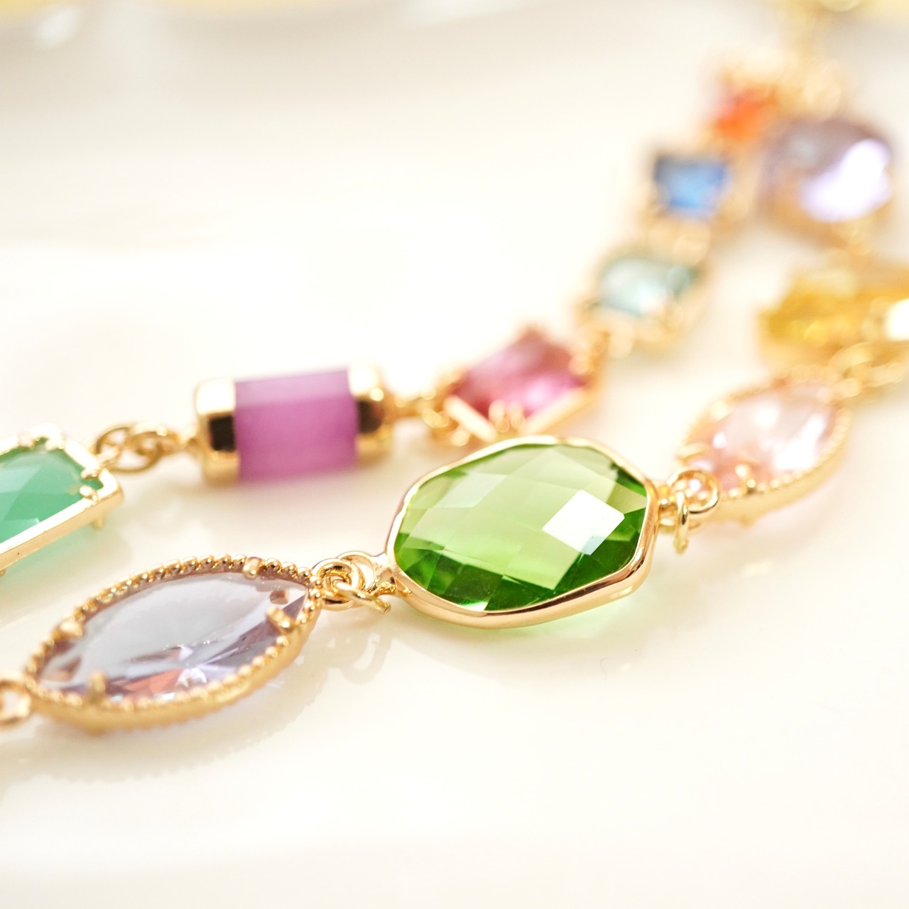 金具はゴールドで上品に仕上げました。いろんな色、形のガラスビジューで見る度に楽しいブレスレットに仕上げました。