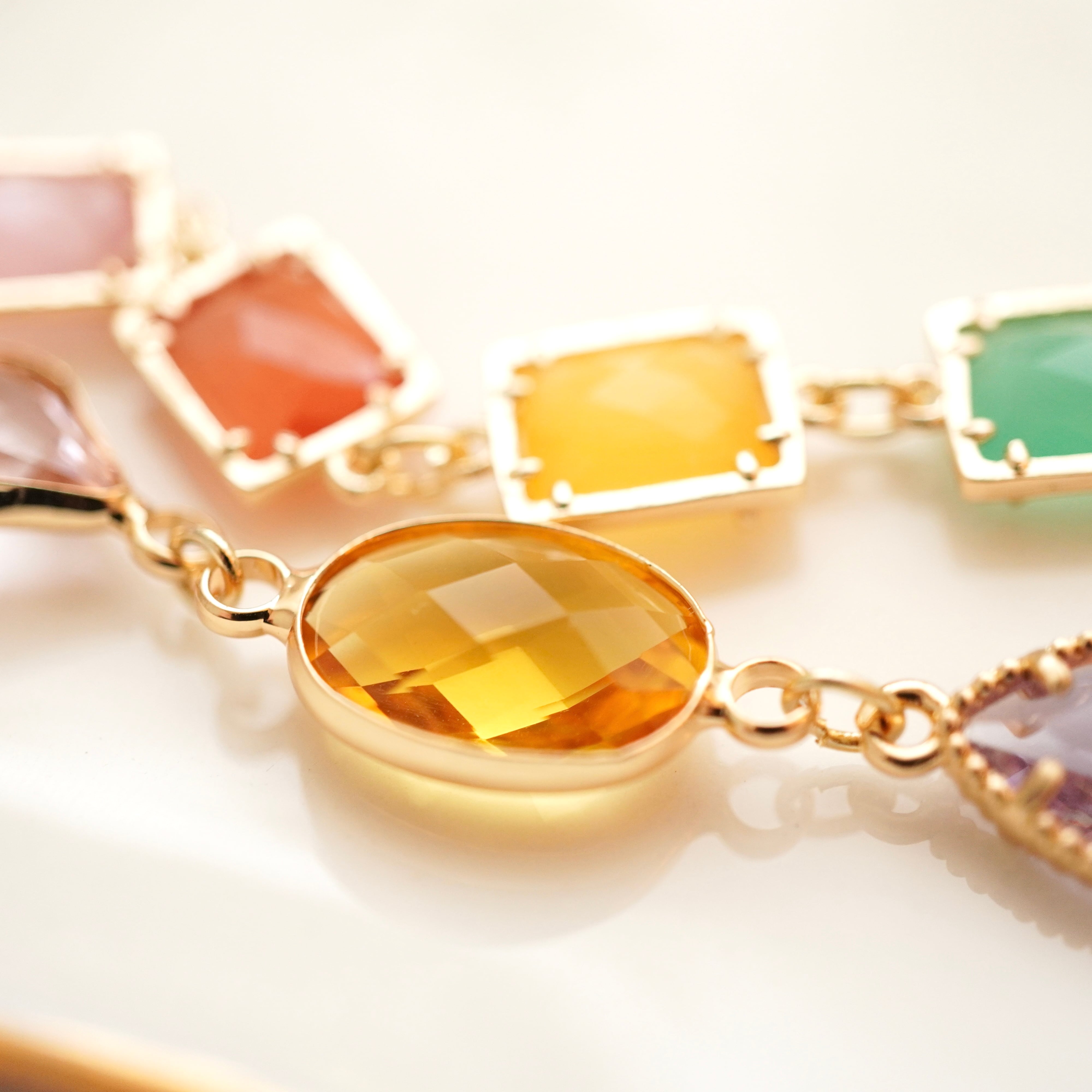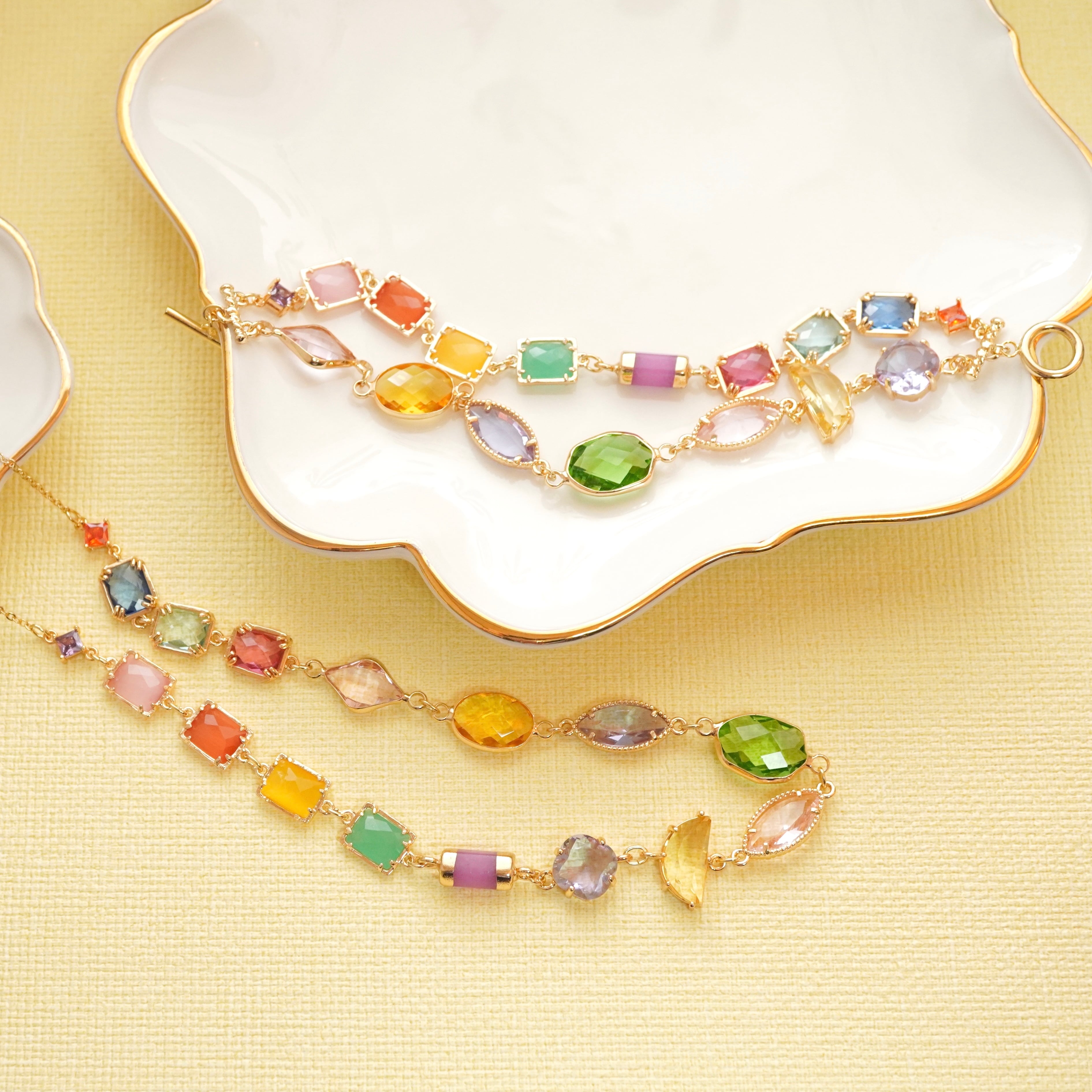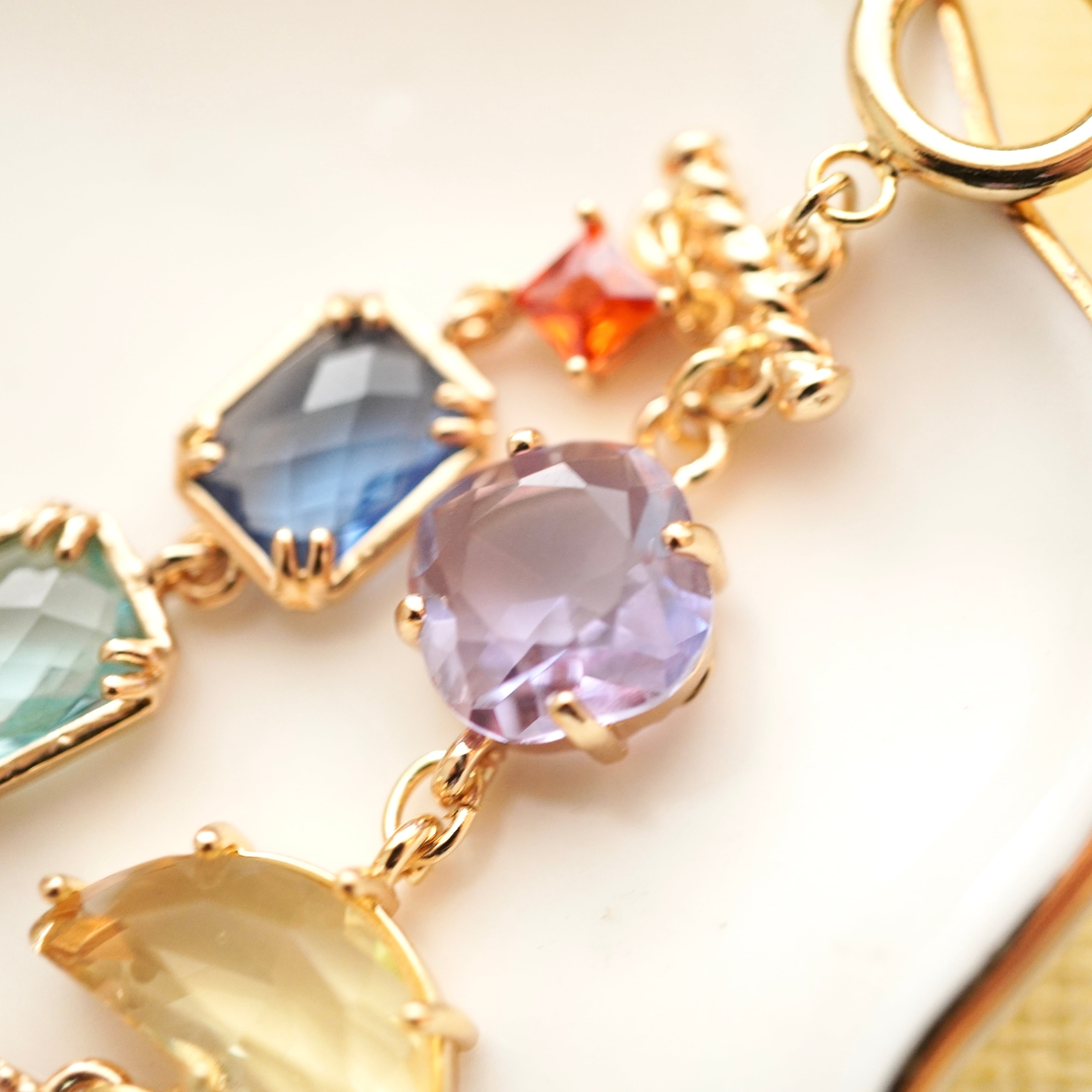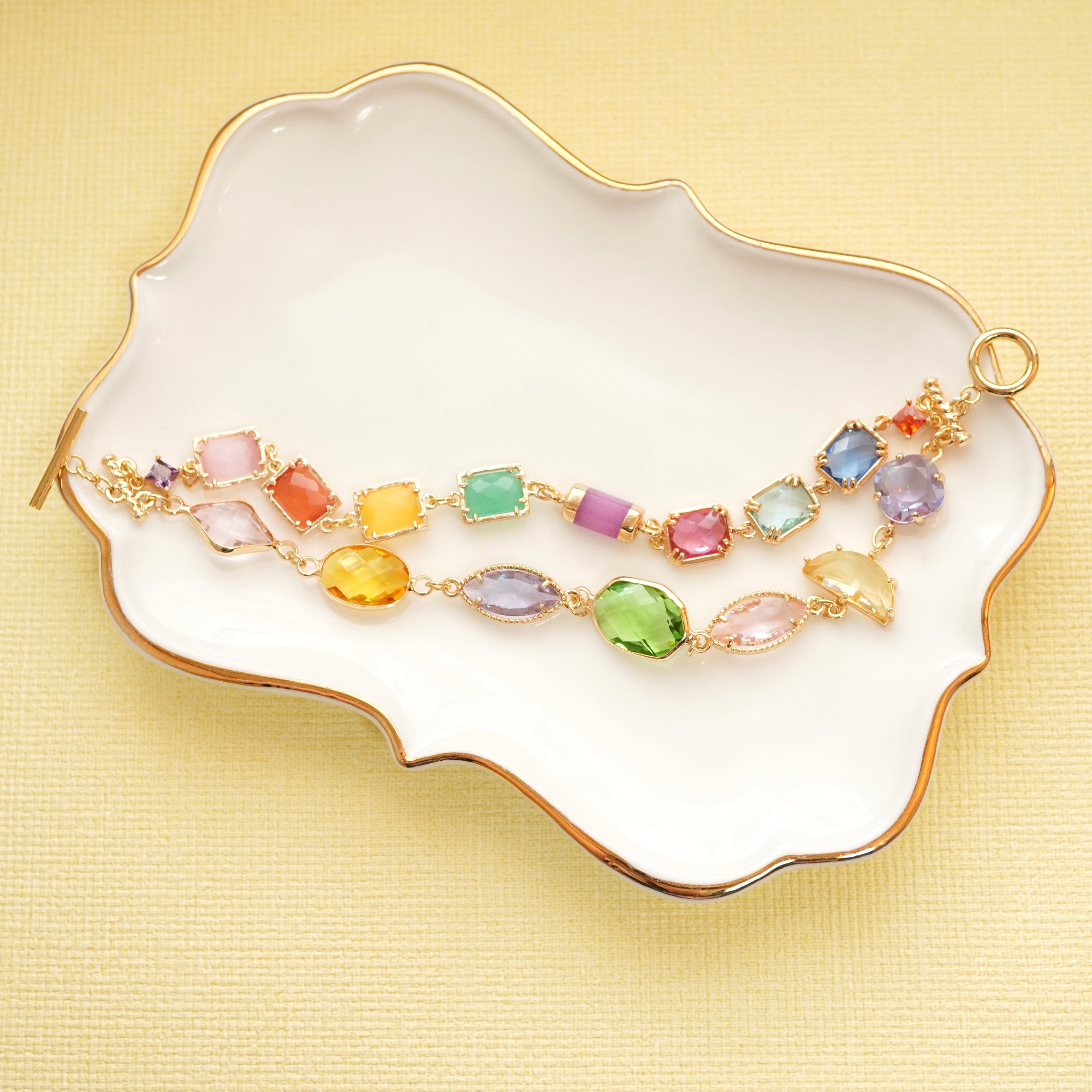 金具はゴールドで上品に仕上げました。いろんな色、形のガラスビジューで見る度に楽しいブレスレットに仕上げました。