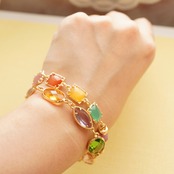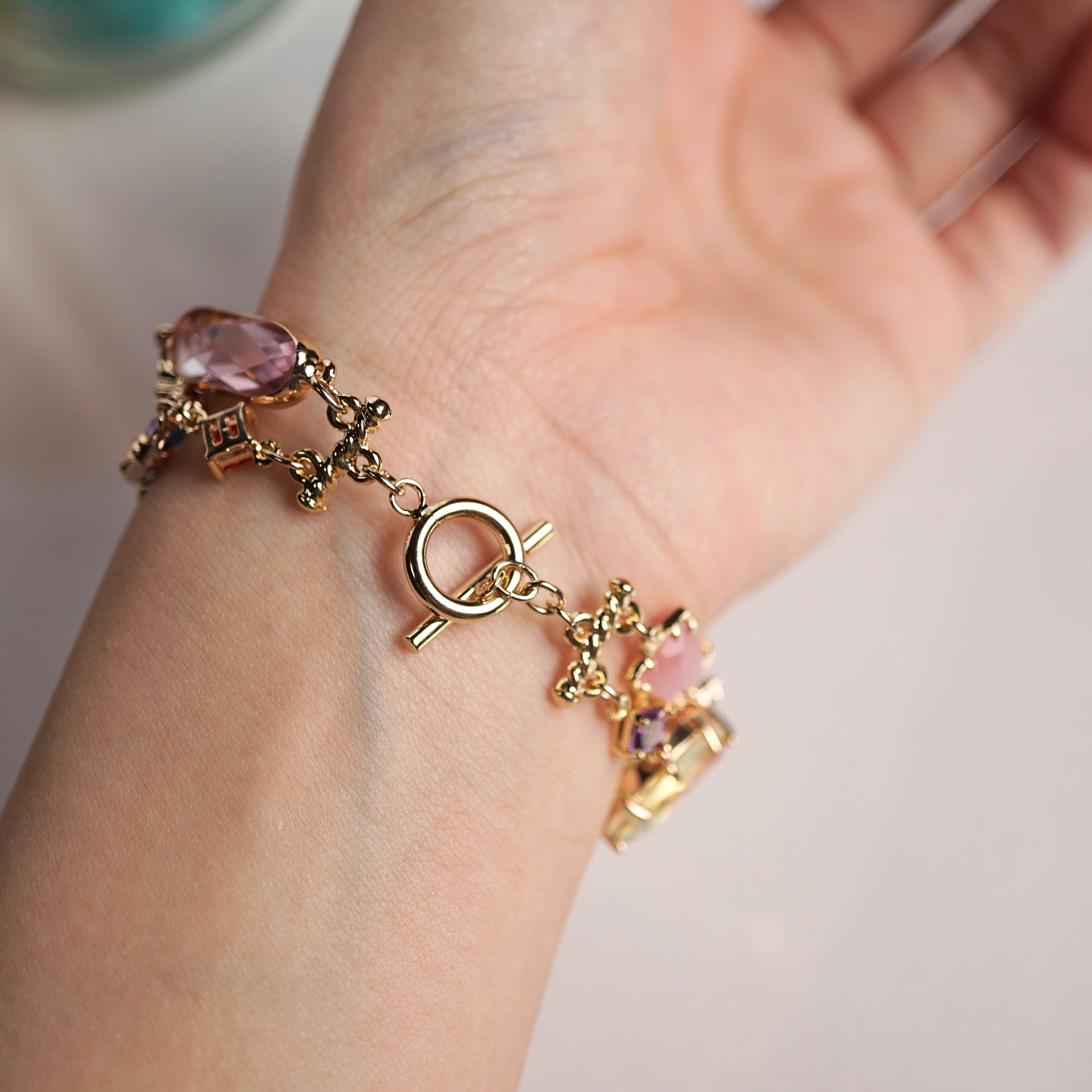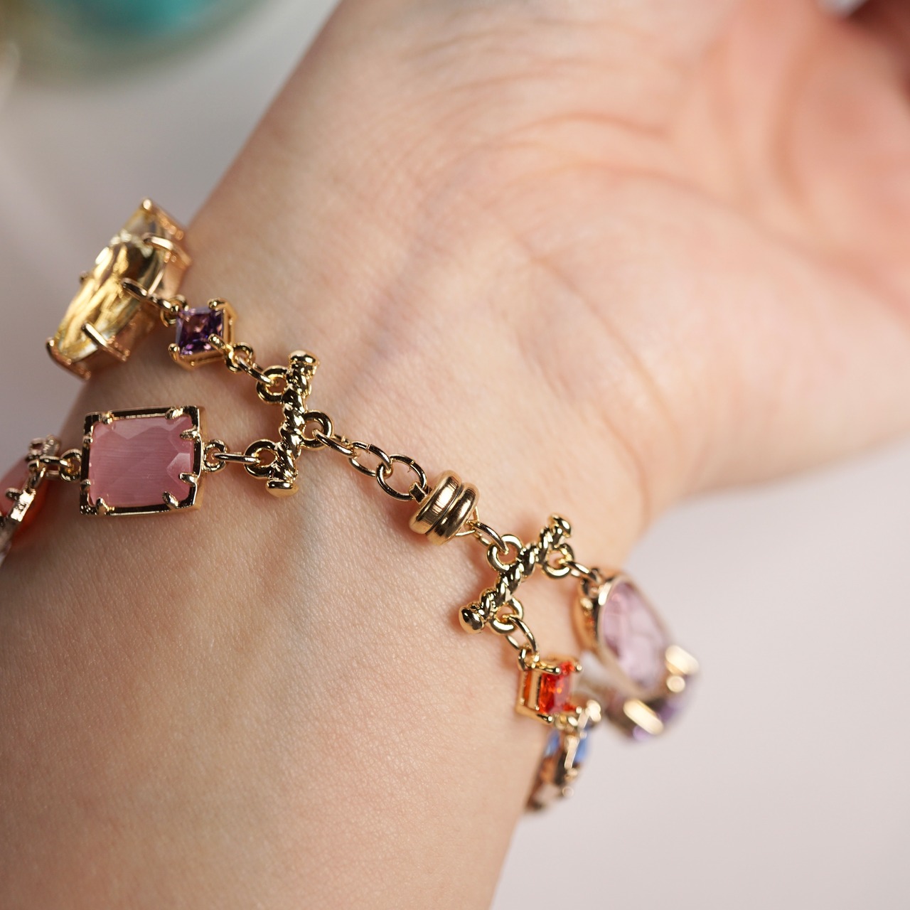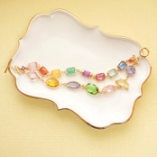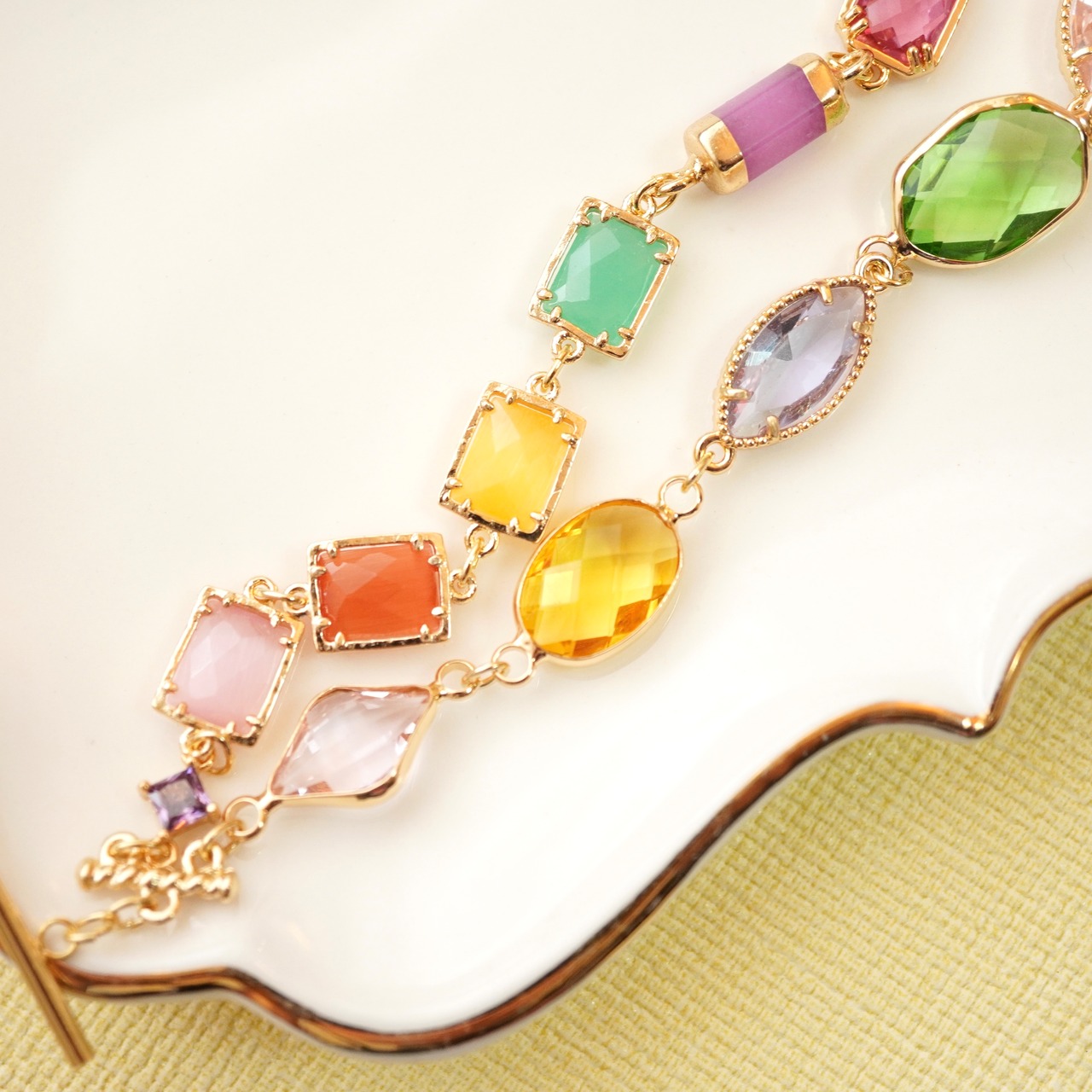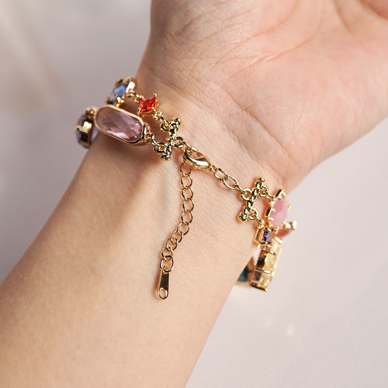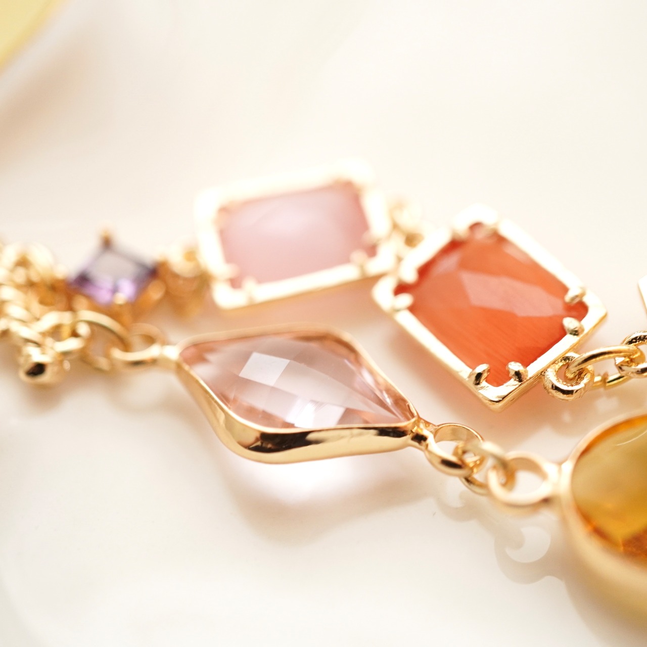 金具はゴールドで上品に仕上げました。いろんな色、形のガラスビジューで見る度に楽しいブレスレットに仕上げました。