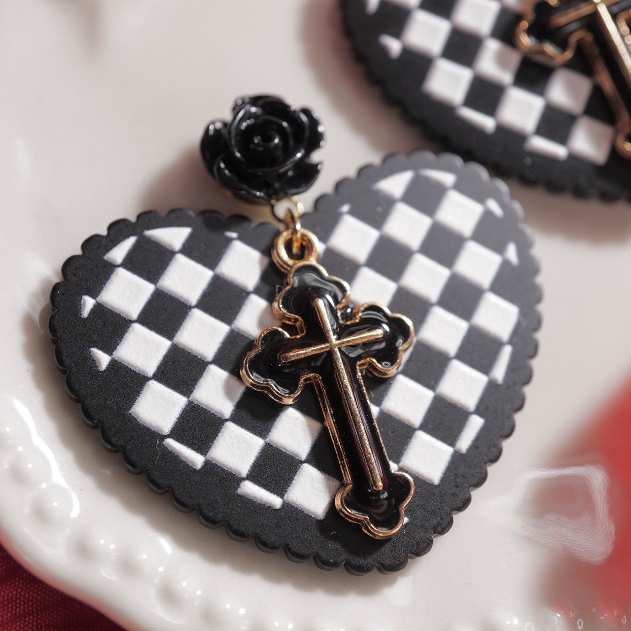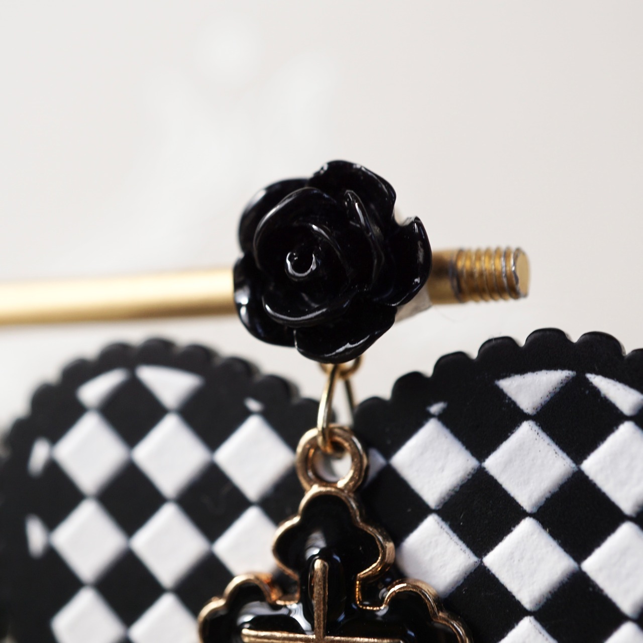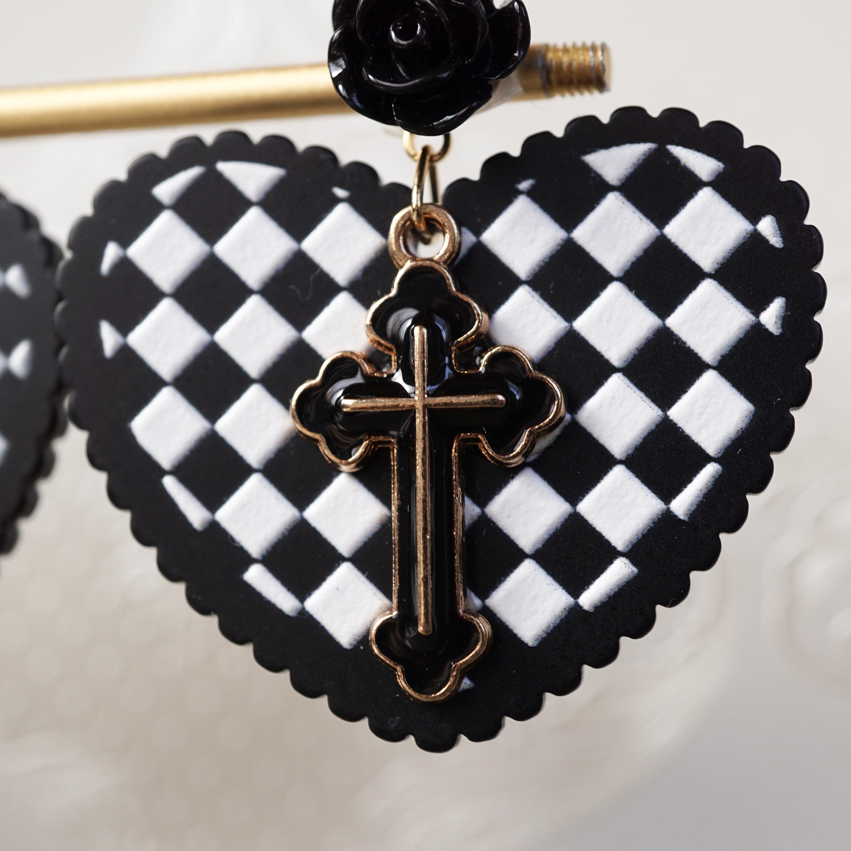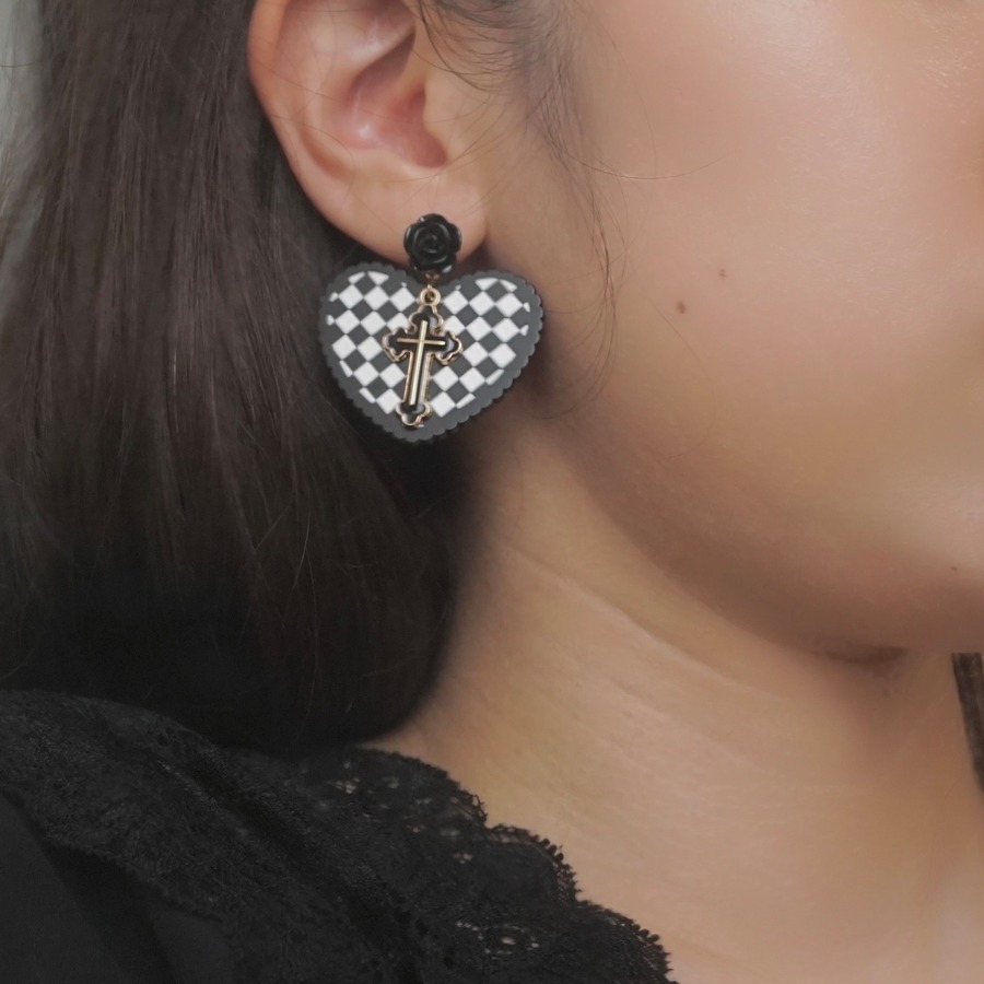 白黒のハート、十字架に黒バラ、これぞゴシックというモチーフでまとめたピアス/イヤリングです。