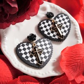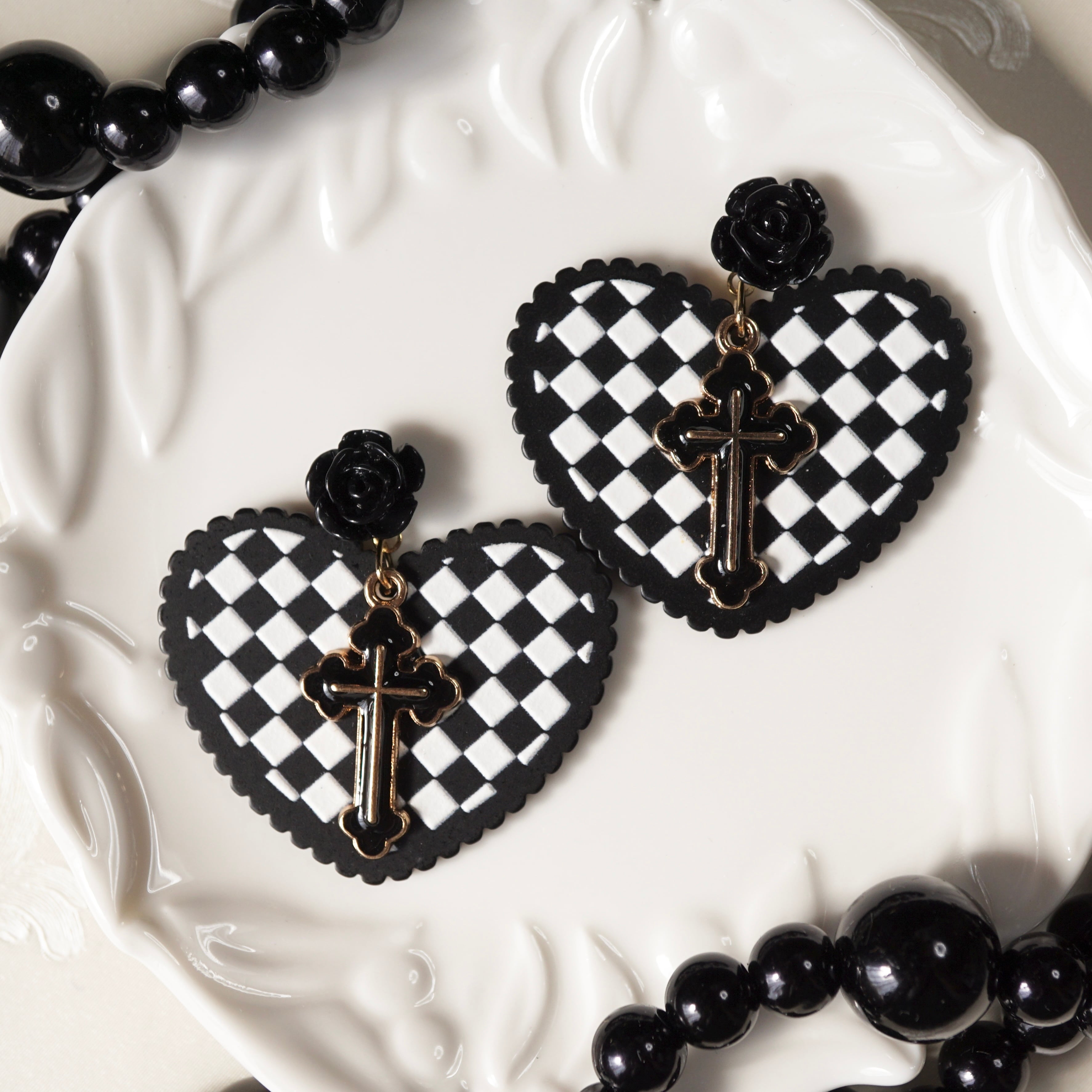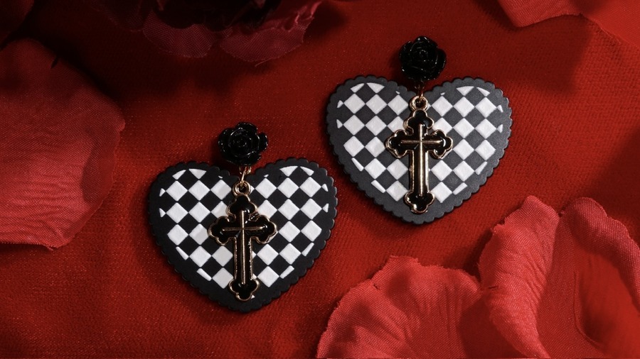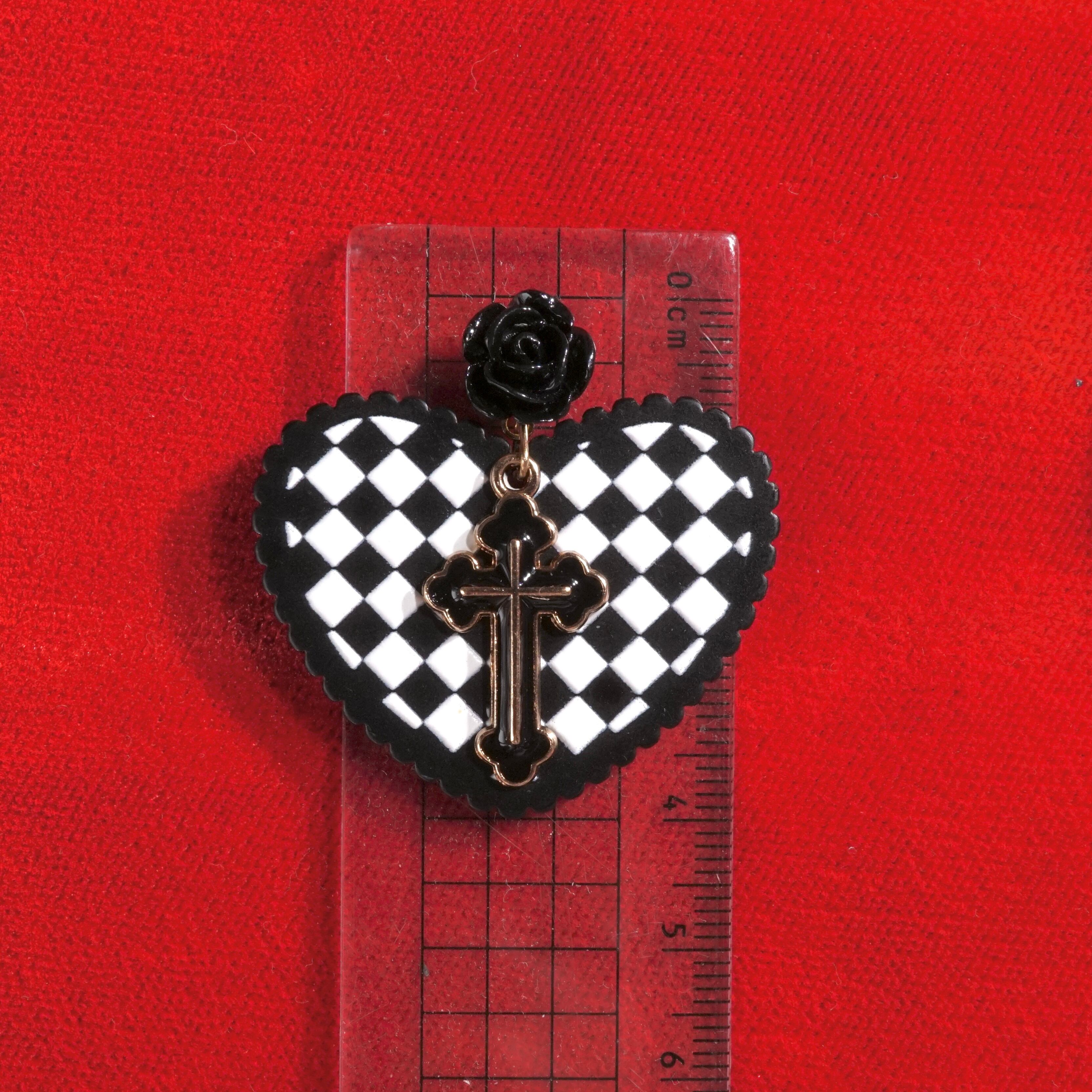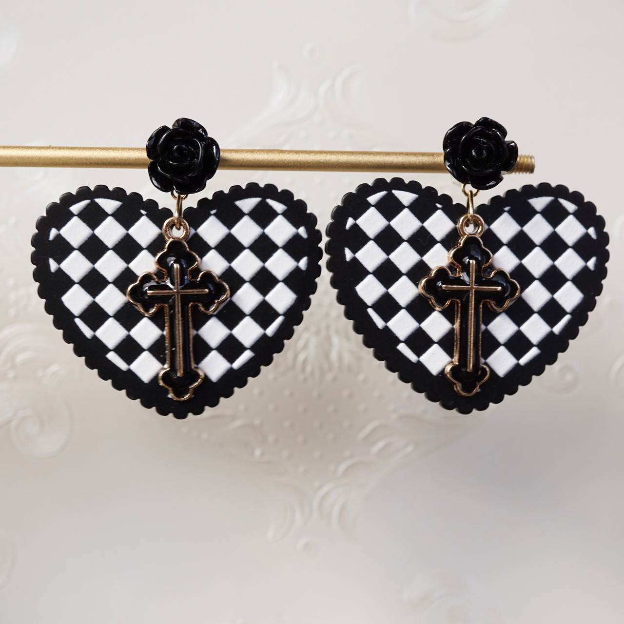 白黒のハート、十字架に黒バラ、これぞゴシックというモチーフでまとめたピアス/イヤリングです。