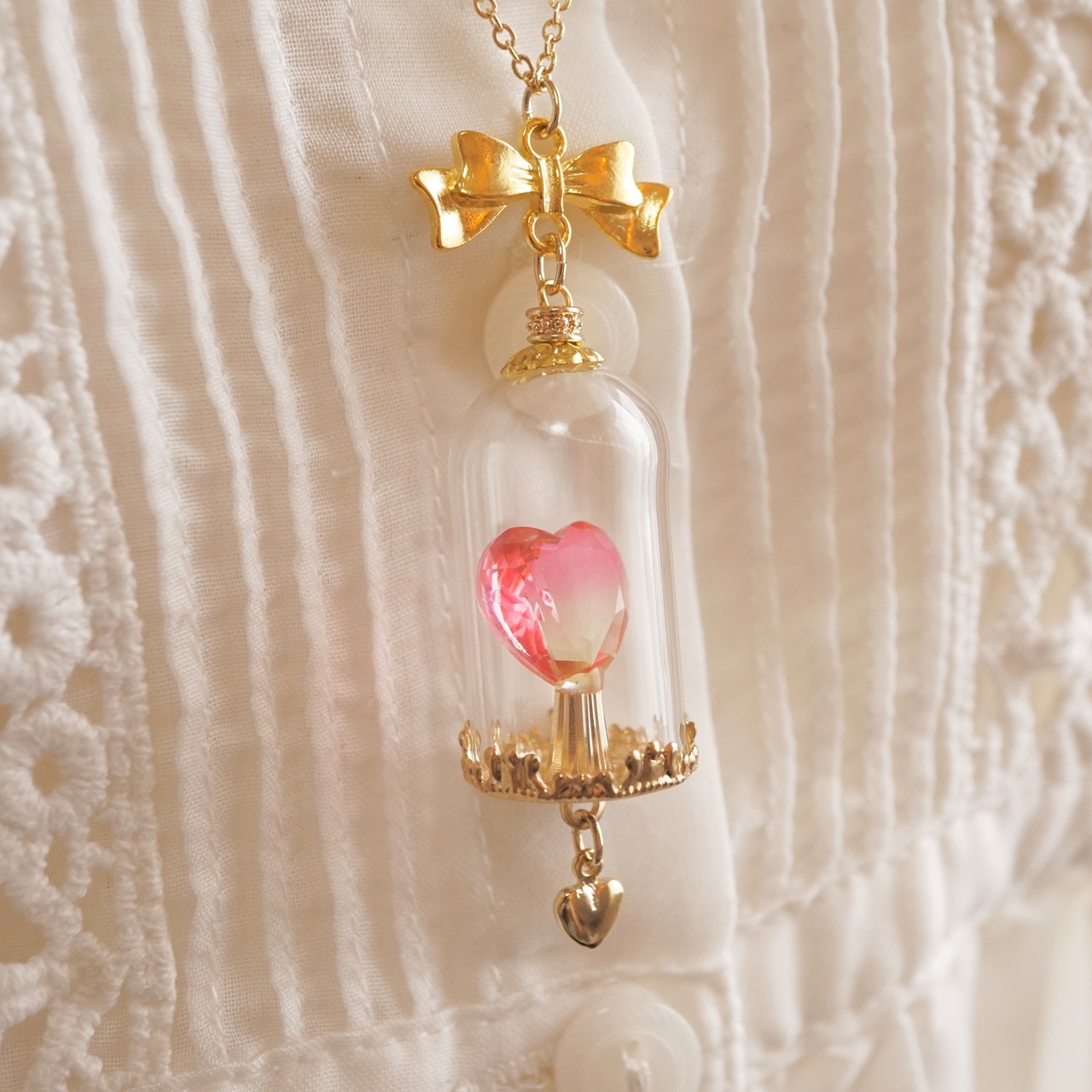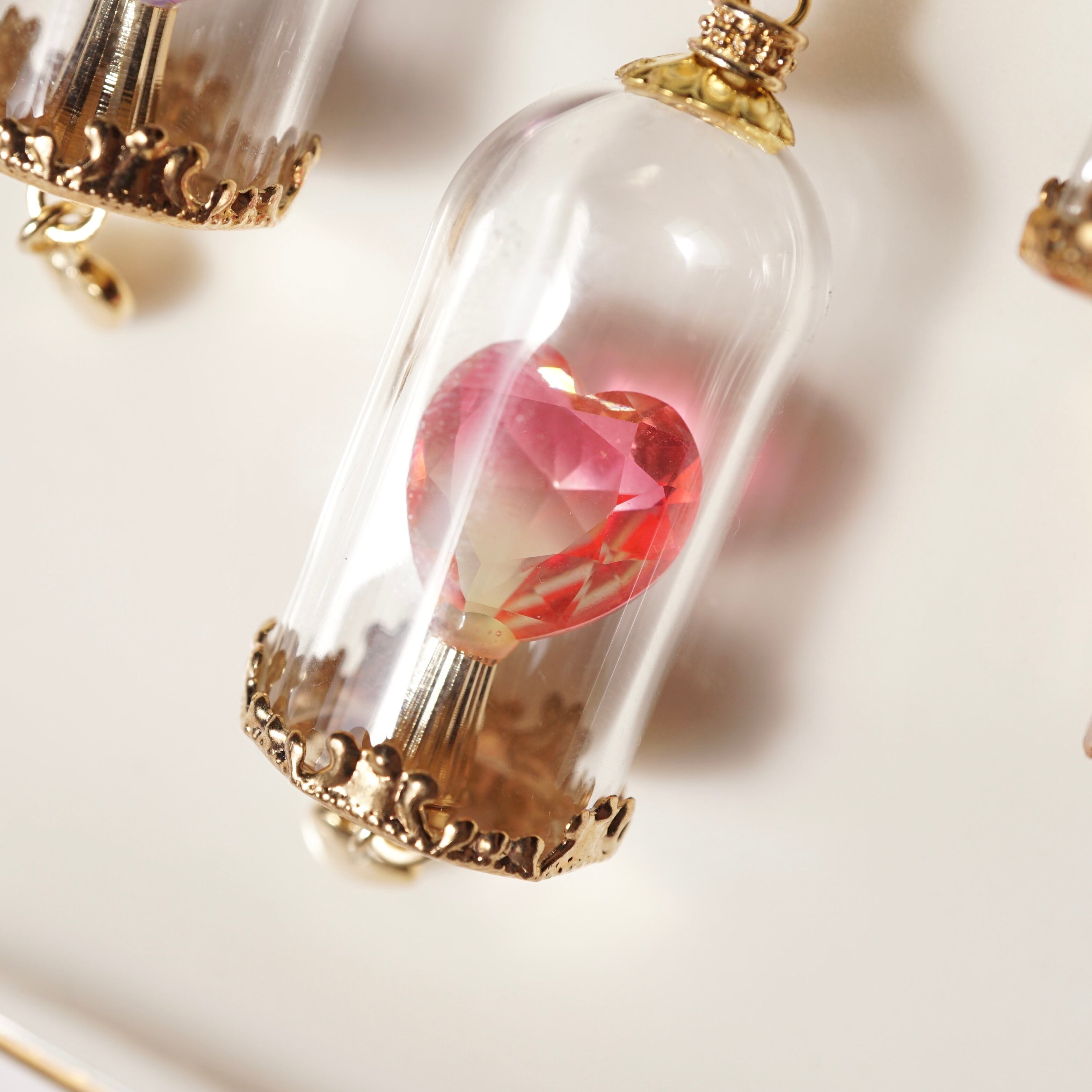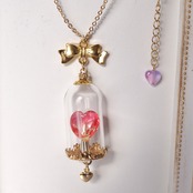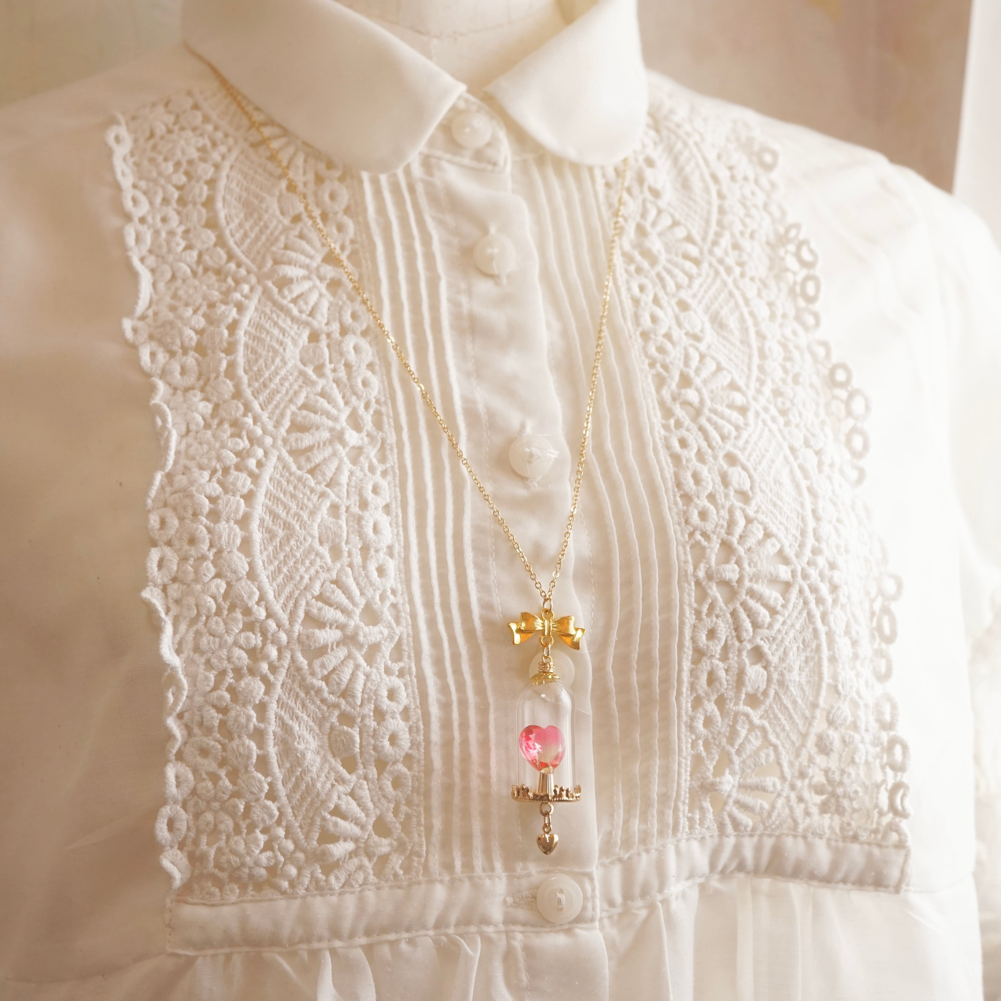 キラキラ輝く恋心を標本にしたネックレスです。ハートの美しさを楽しんでいただくため、360°綺麗に見えるガラス管を使いました。