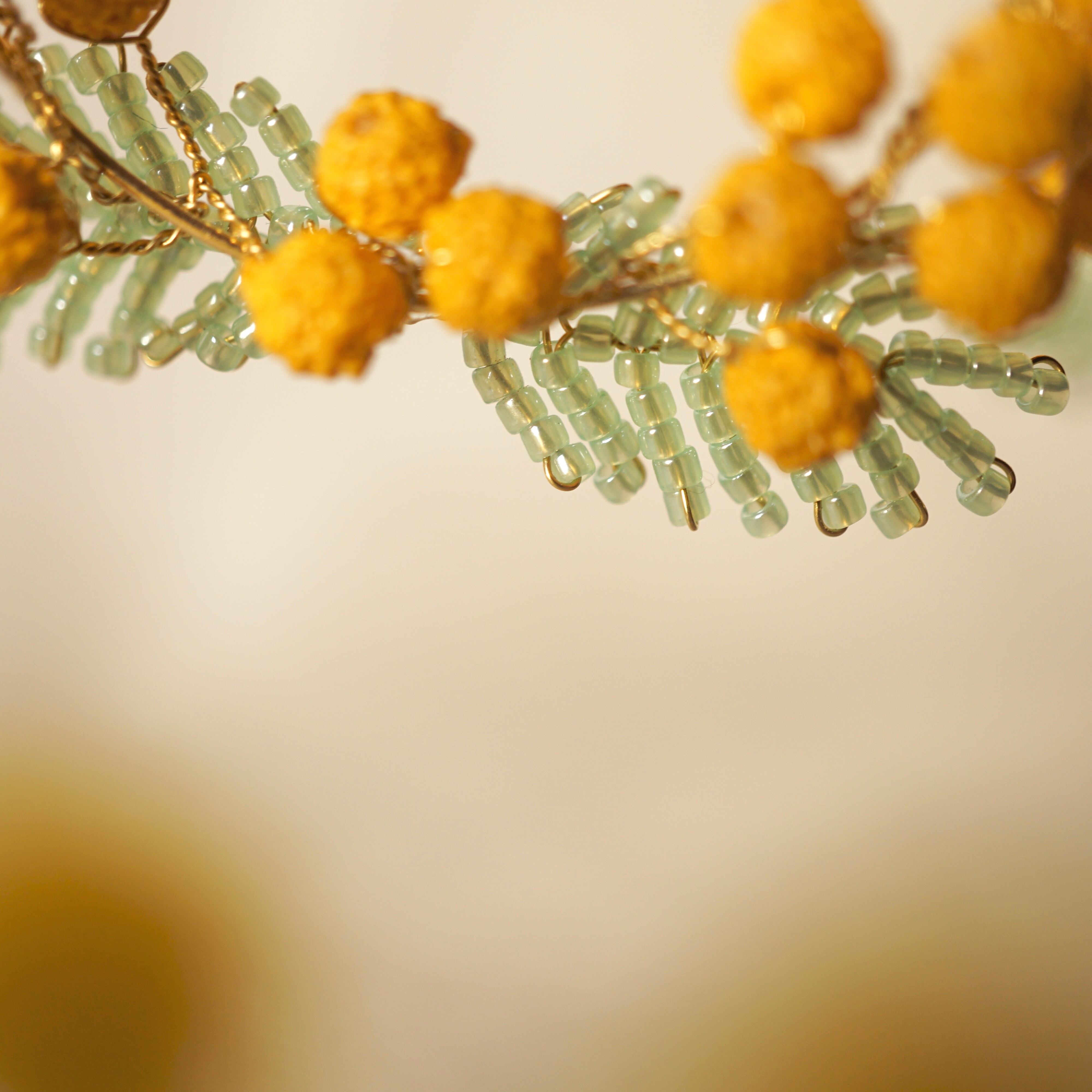 ふわふわのミモザの花をどう表現するか考え、オリジナルで制作した黄色のビーズを使用しております。ぎゅっと集まって咲く姿を再現できるよう、ワイヤーで枝を編みました。葉っぱも形を研究して一つずつビーズを編んで制作しております。