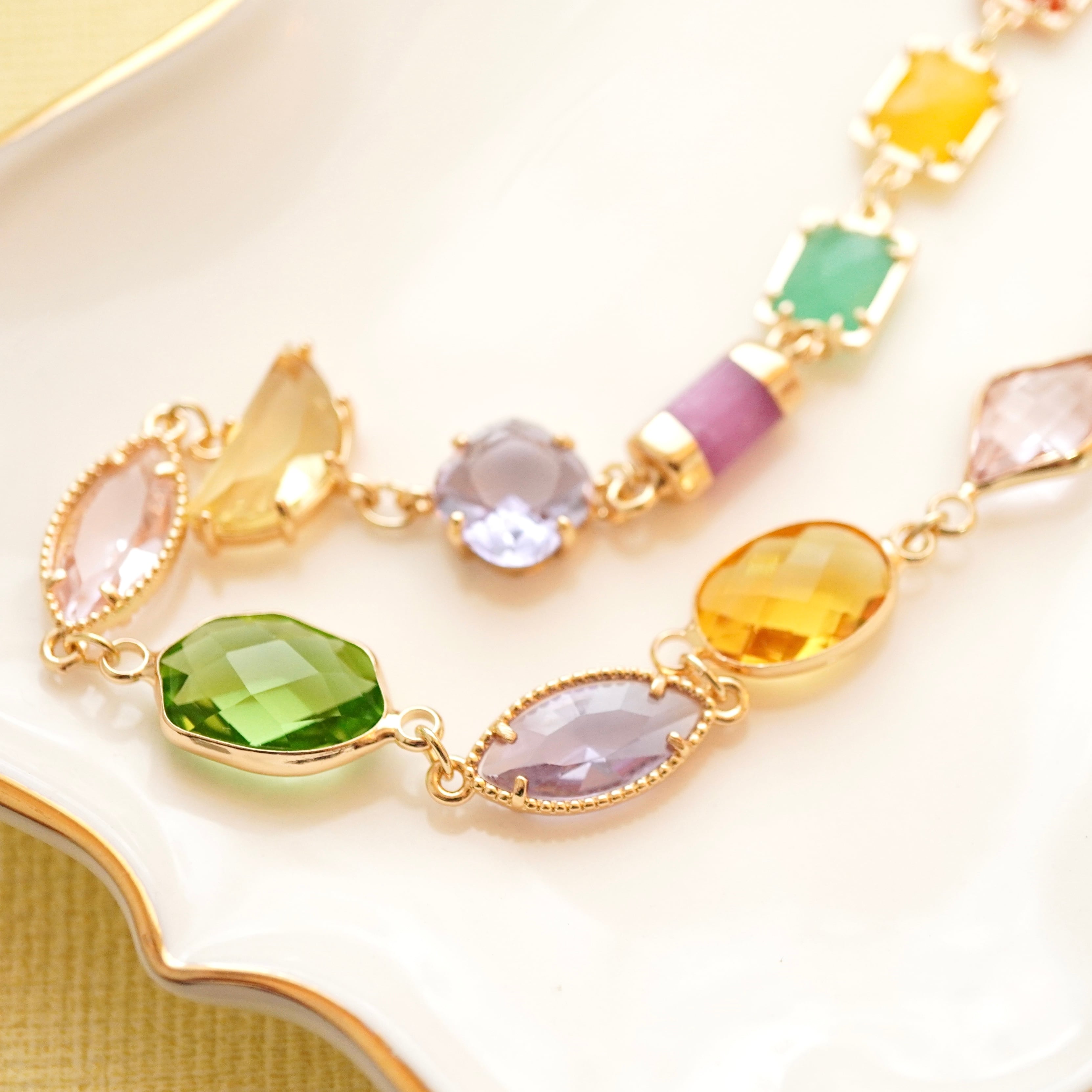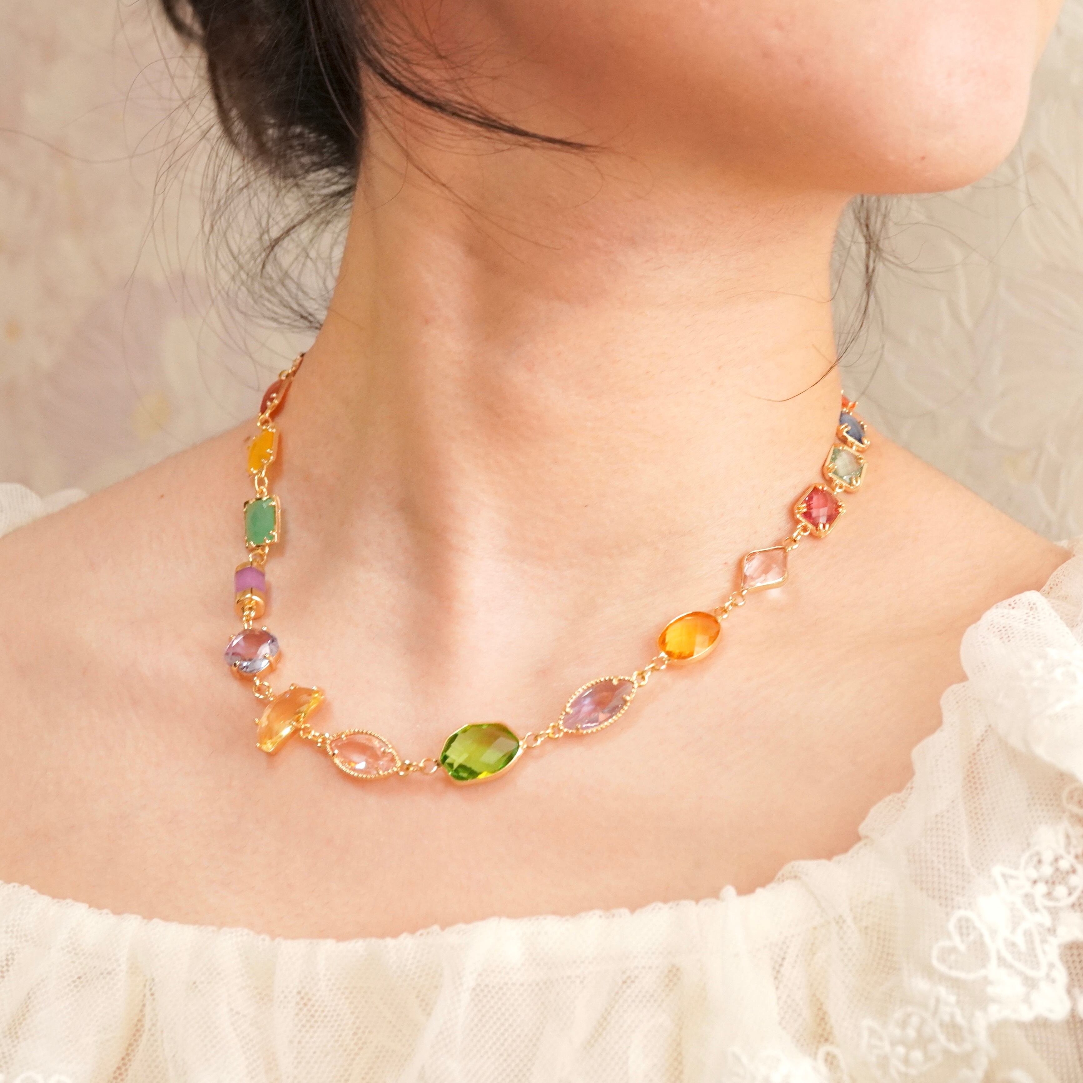 金具はゴールドで上品に仕上げました。いろんな色、形のガラスビジューで見る度に楽しいネックレスに仕上げました。