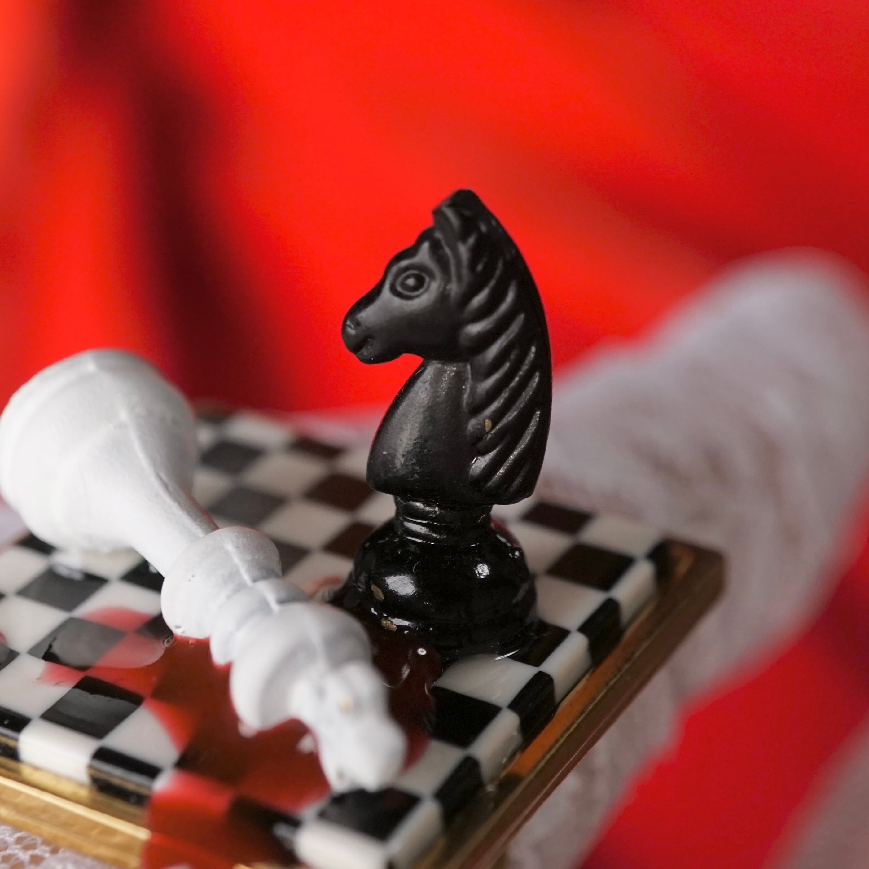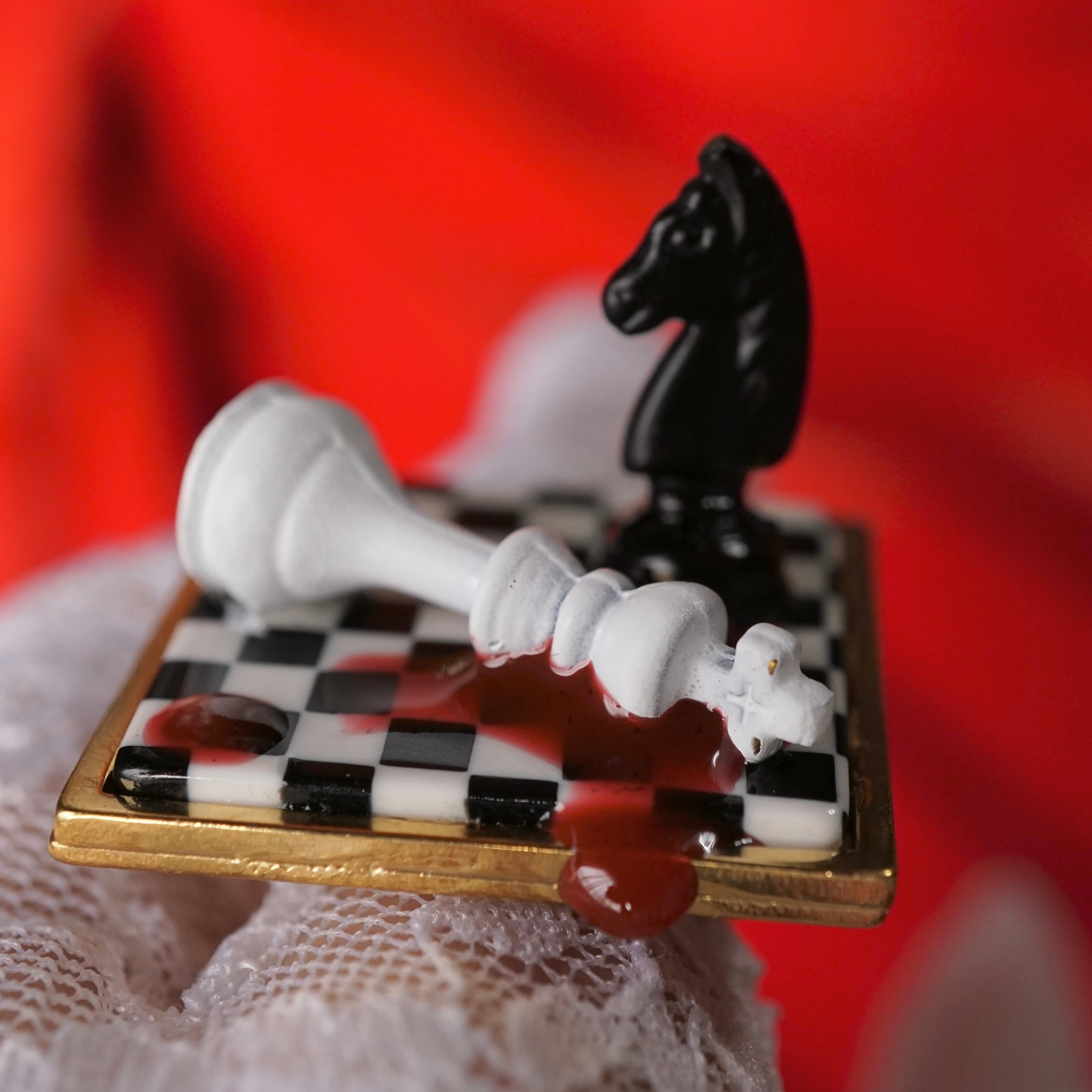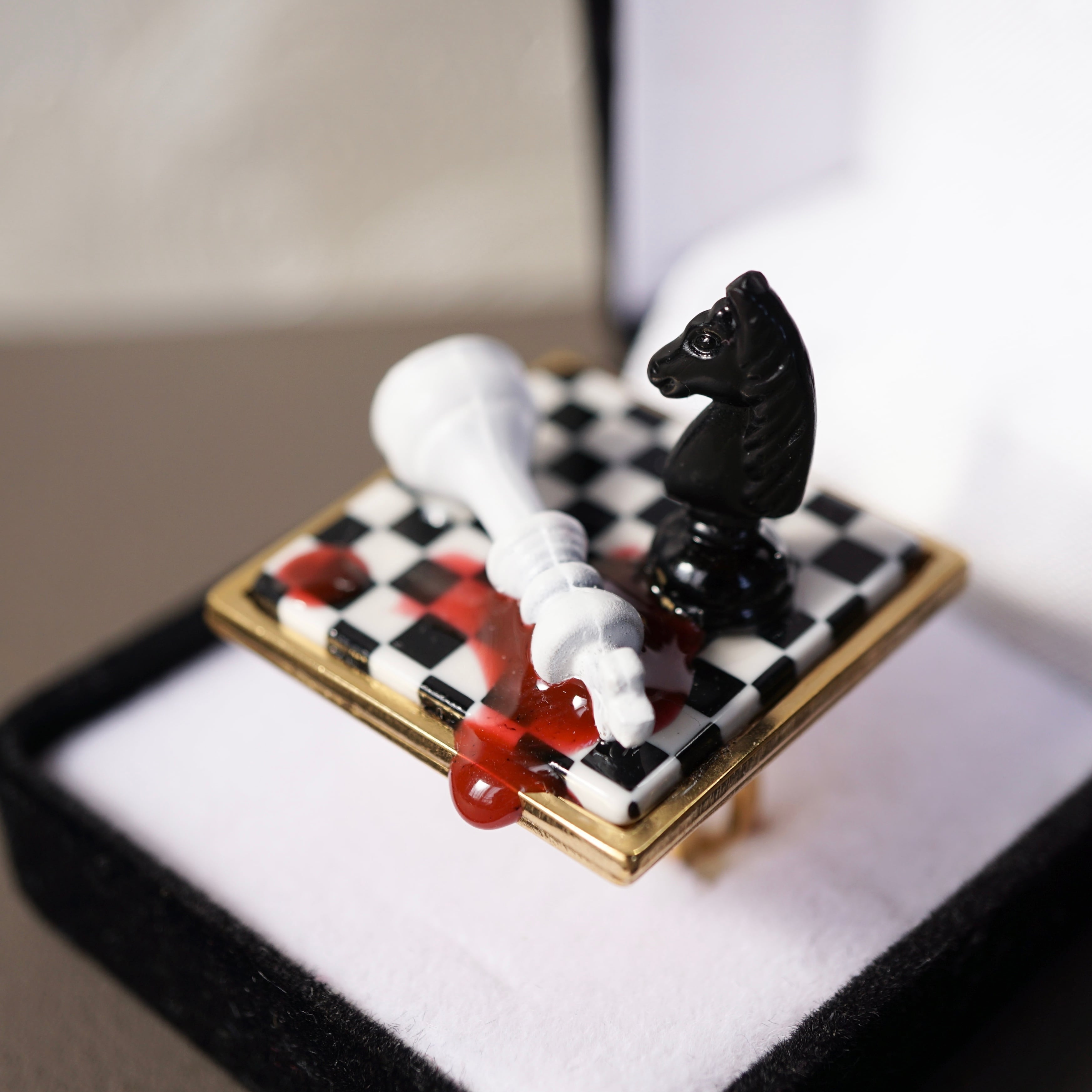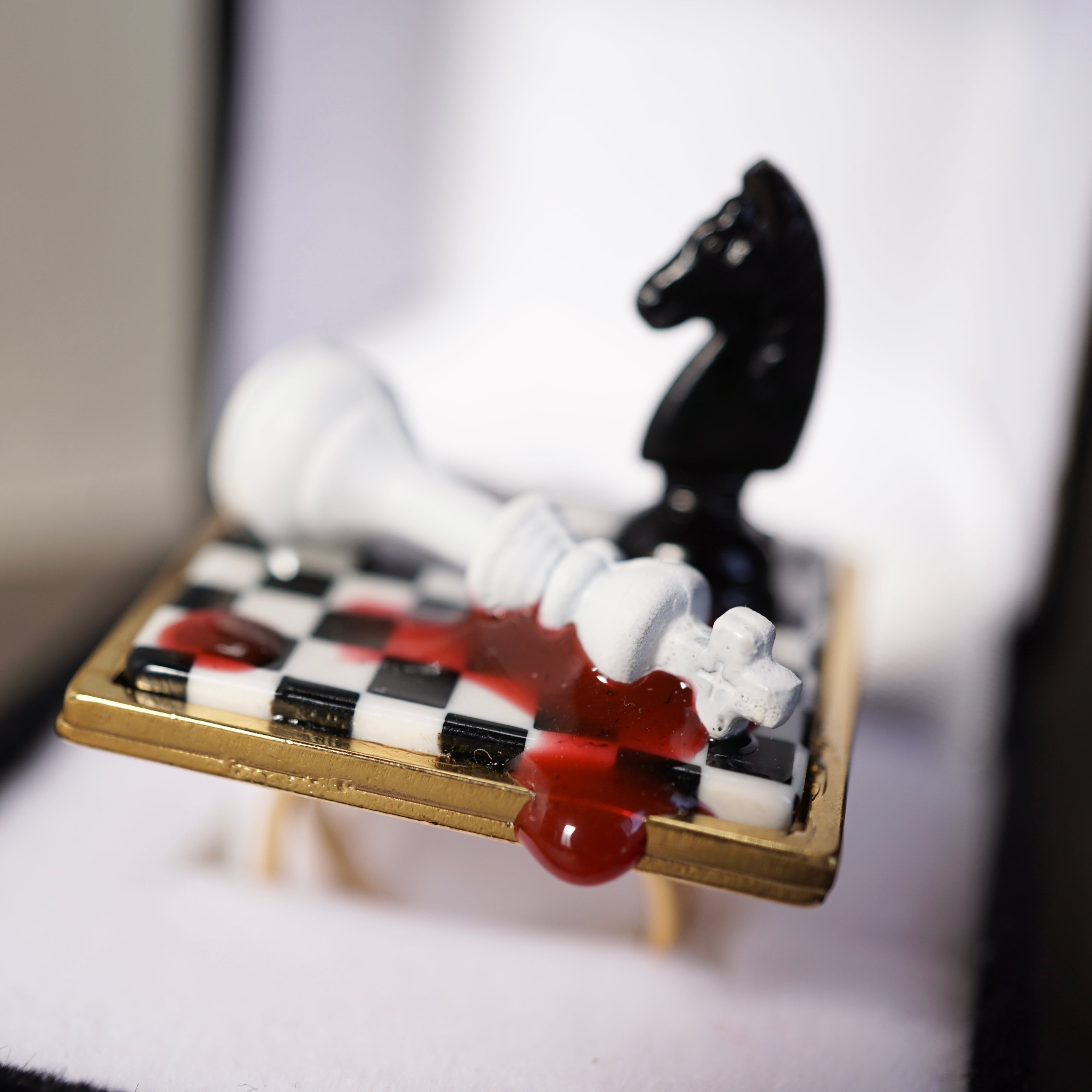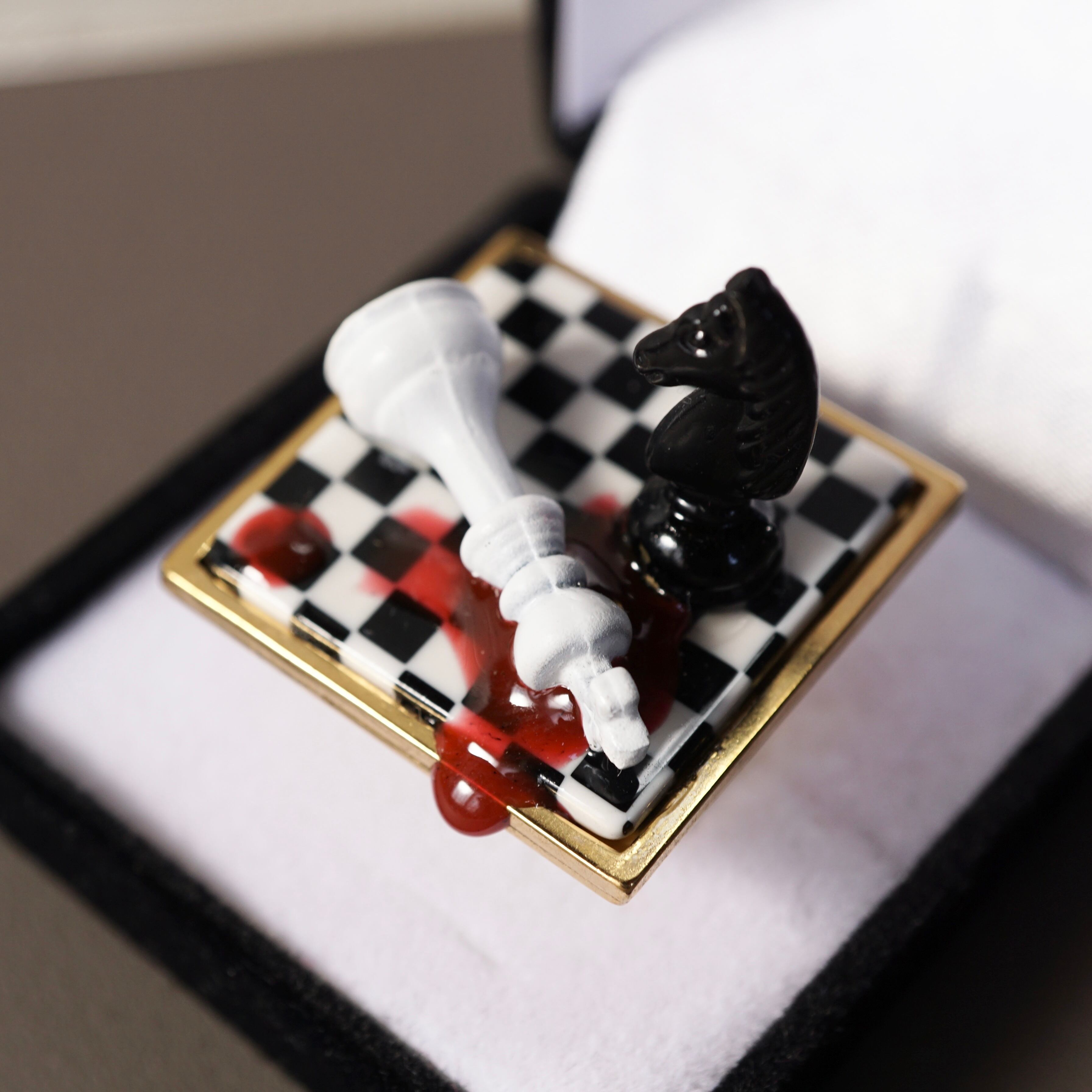 黒のナイトが白のキングを倒す、チェックメイトの瞬間をイメージしたリングです。血をあしらってダークな物語に仕上げました。