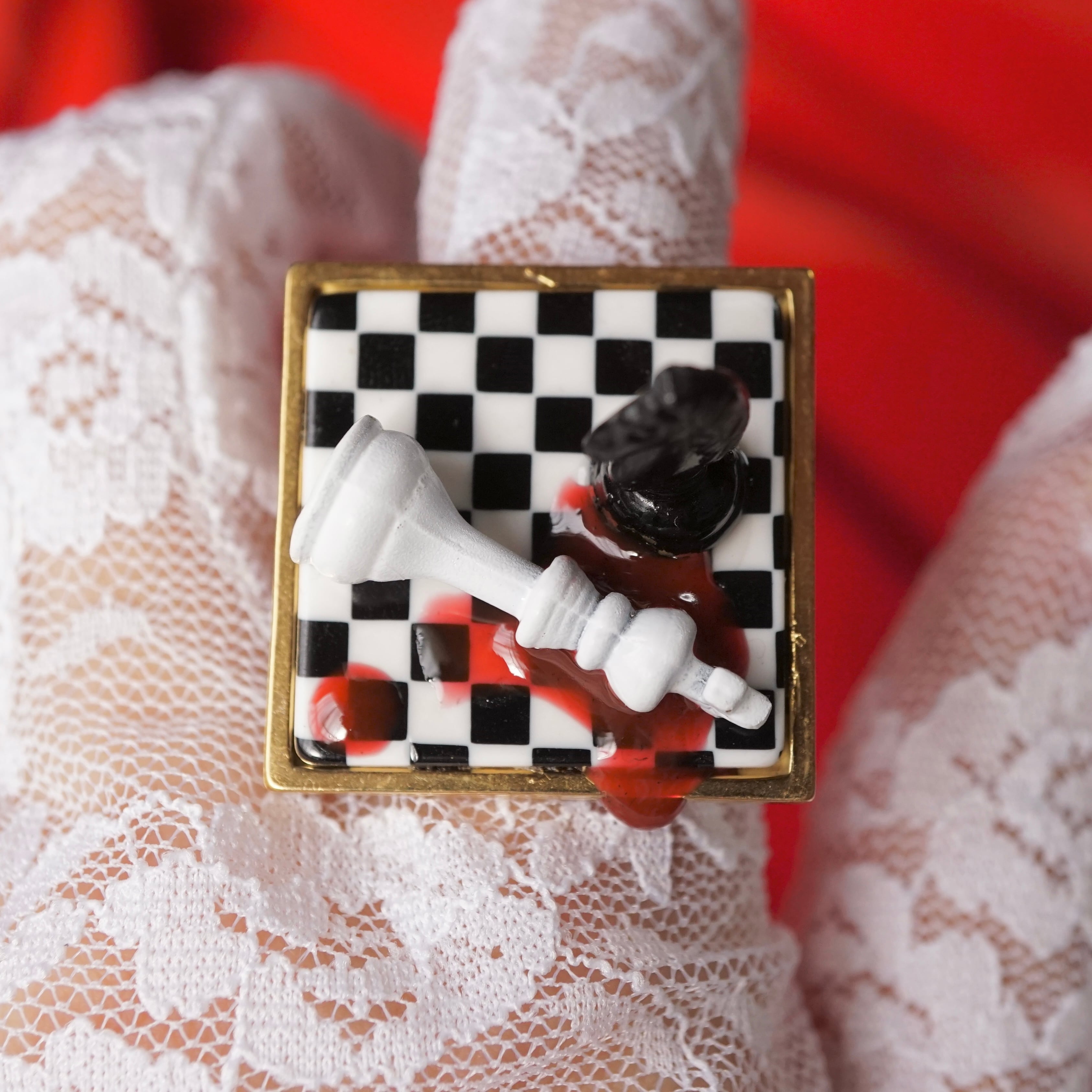 チェックメイトの瞬間を指の上に表現した、ゴシックでダークなリングです。