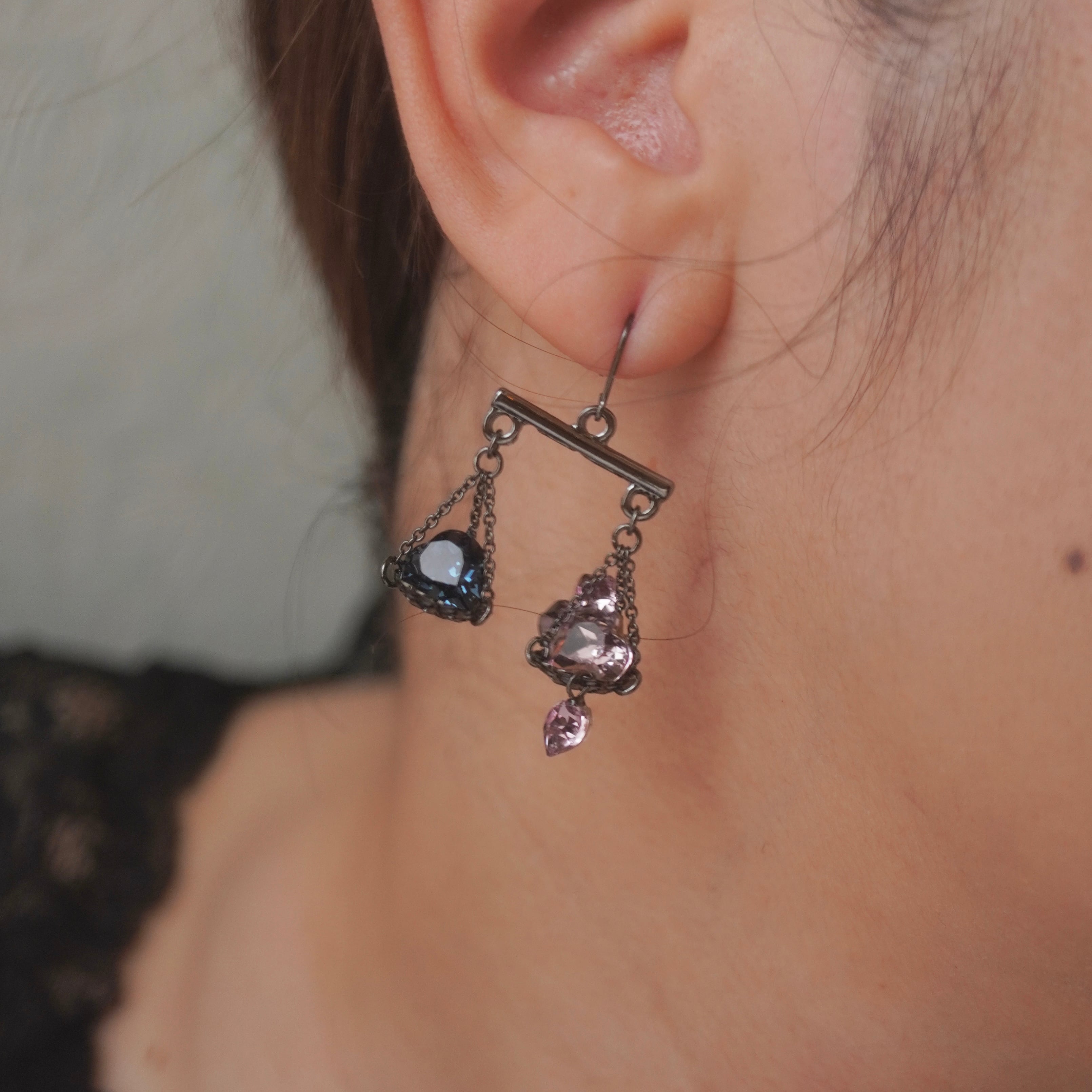 耳元で小さな天秤がゆらゆら揺れるピアス/イヤリングです。ハロウィン限定のゴシックカラーでご用意いたしました!