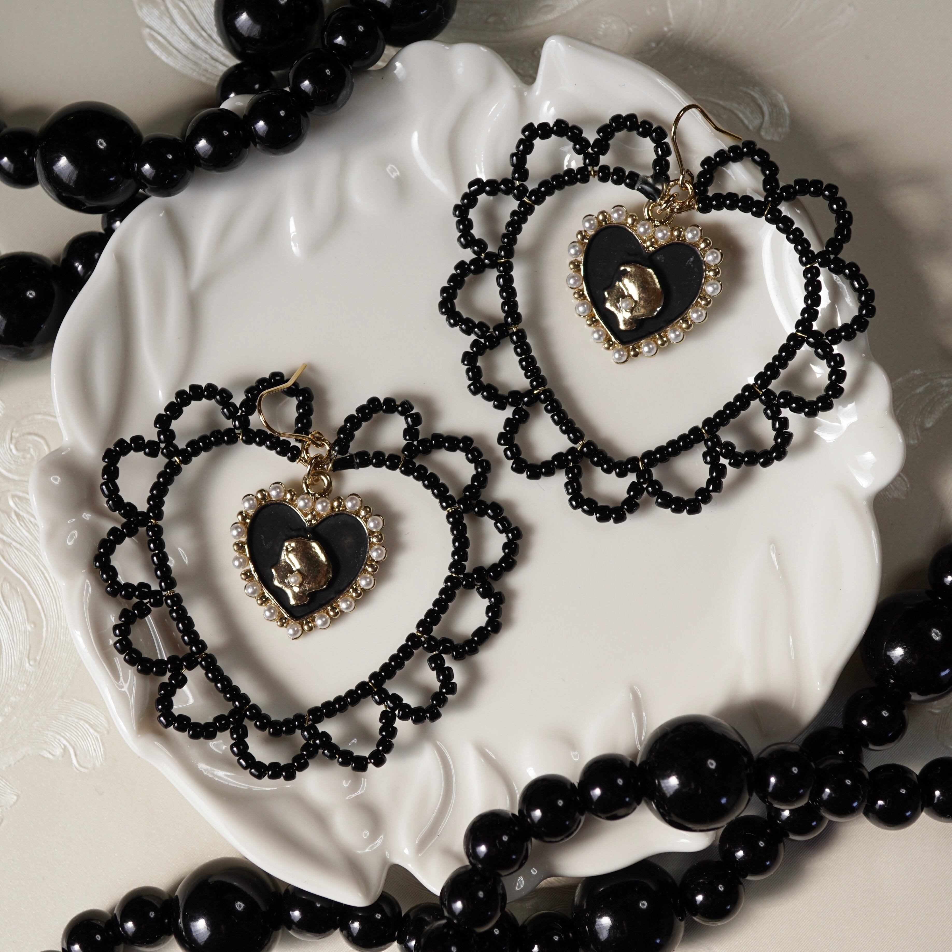 女性の横顔のシックなチャームにブラックのレースを合わせたピアス/イヤリングです。