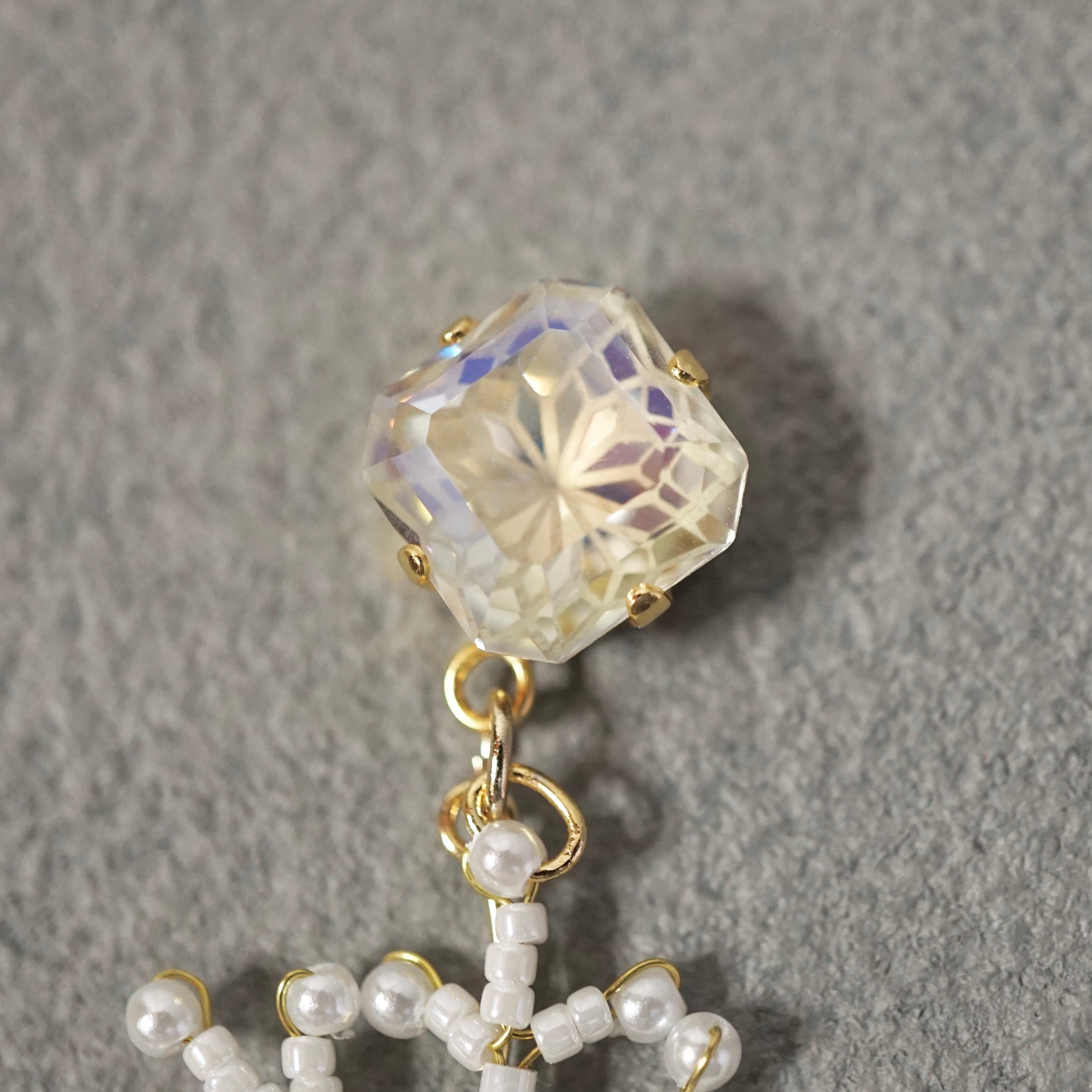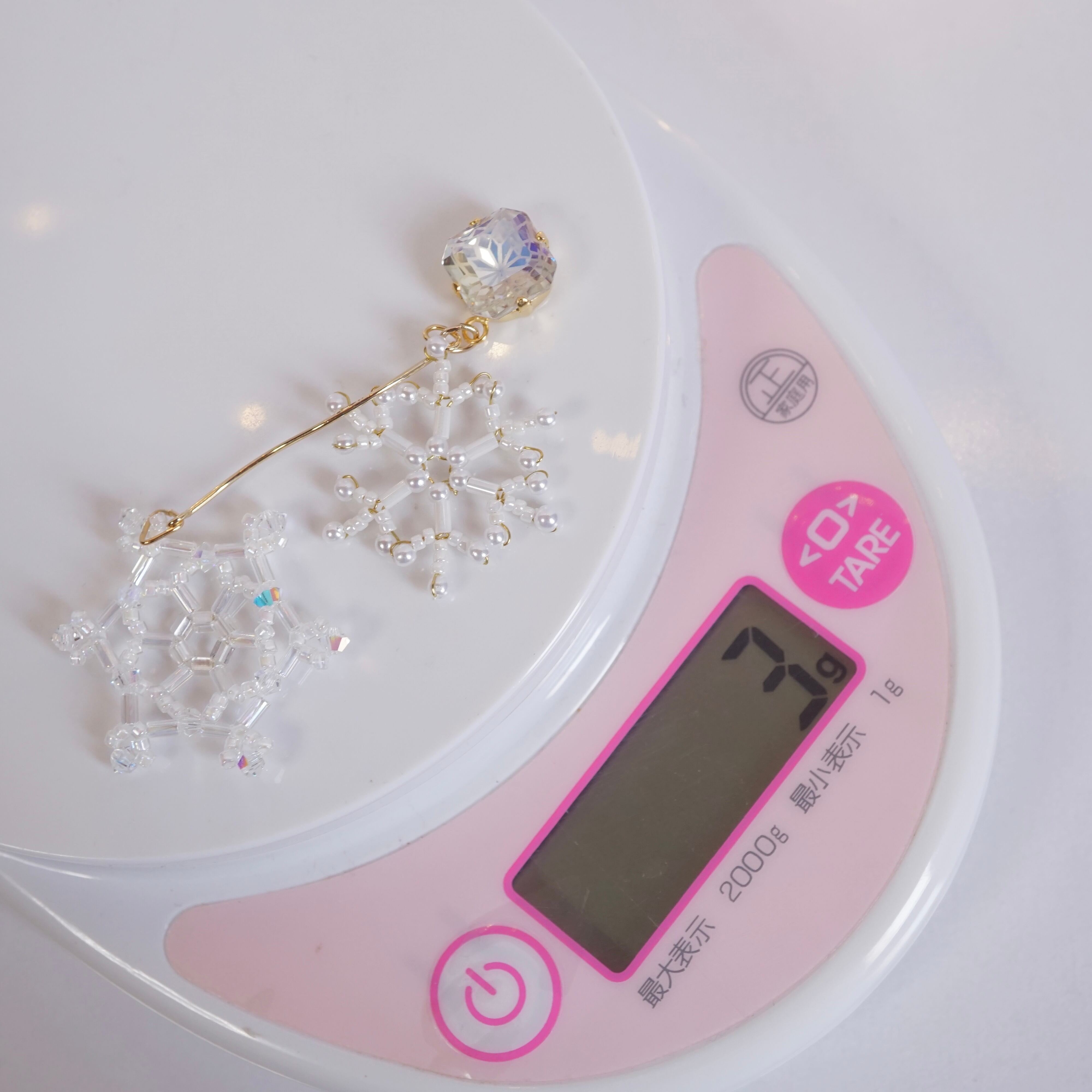 金具部分のクリスタルも雪の結晶模様のものを使いました!細かな模様とオーロラ加工の輝きが綺麗です。