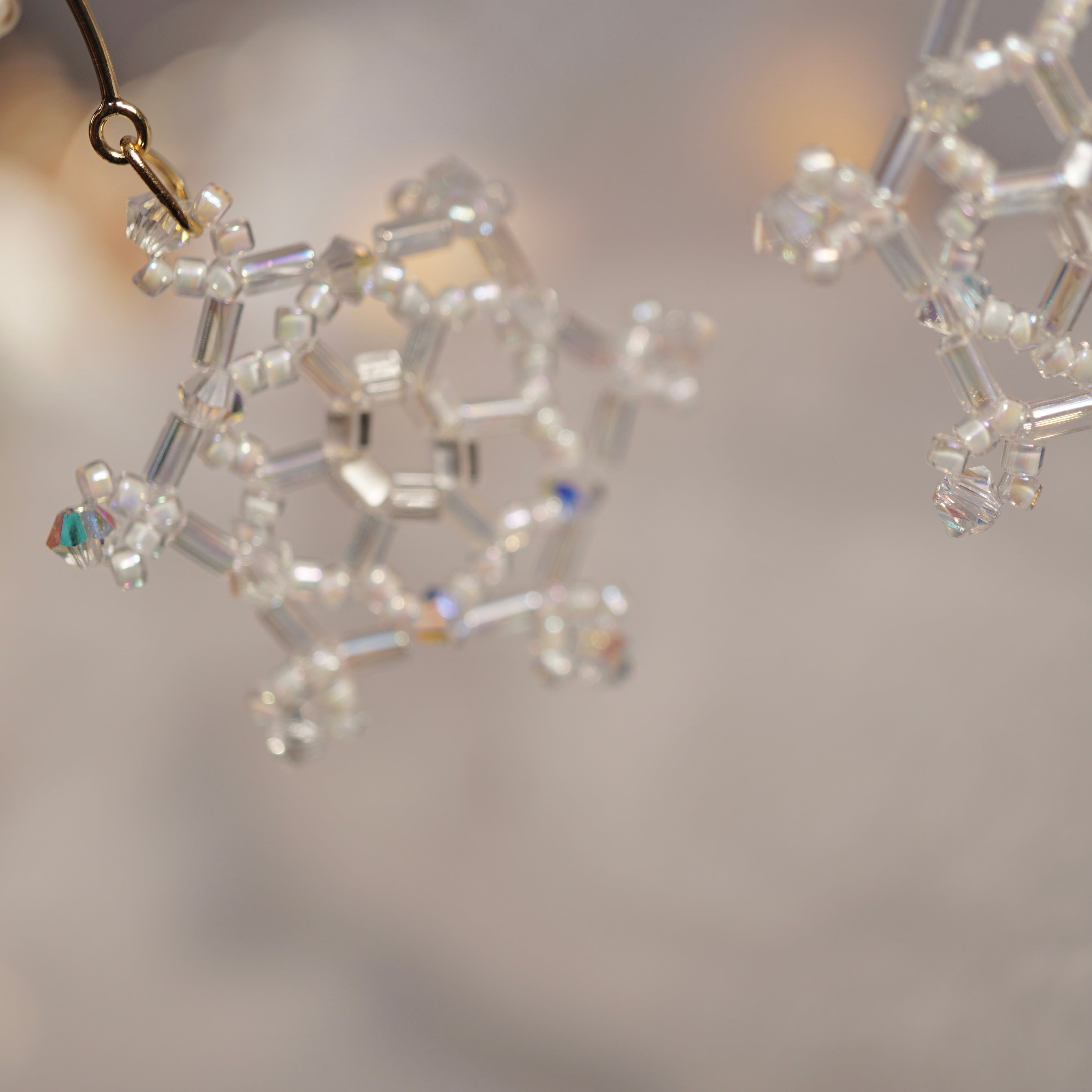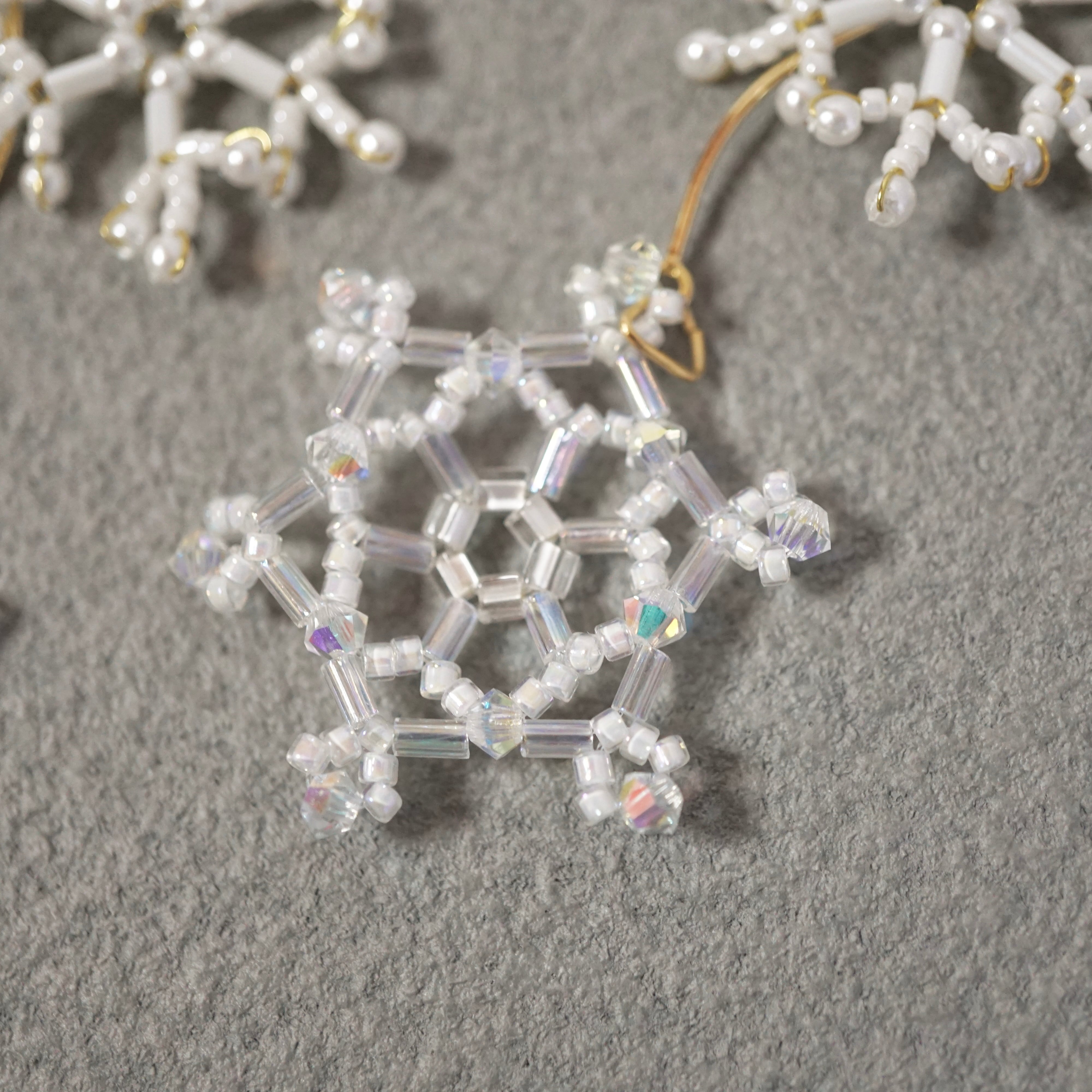 雪の結晶はオーロラカラーのビーズの輝きが綺麗なクリアのものと、パールの光沢が美しいホワイトの2種類を作りました。ひとつひとつ丁寧に手作業で編んでおります。