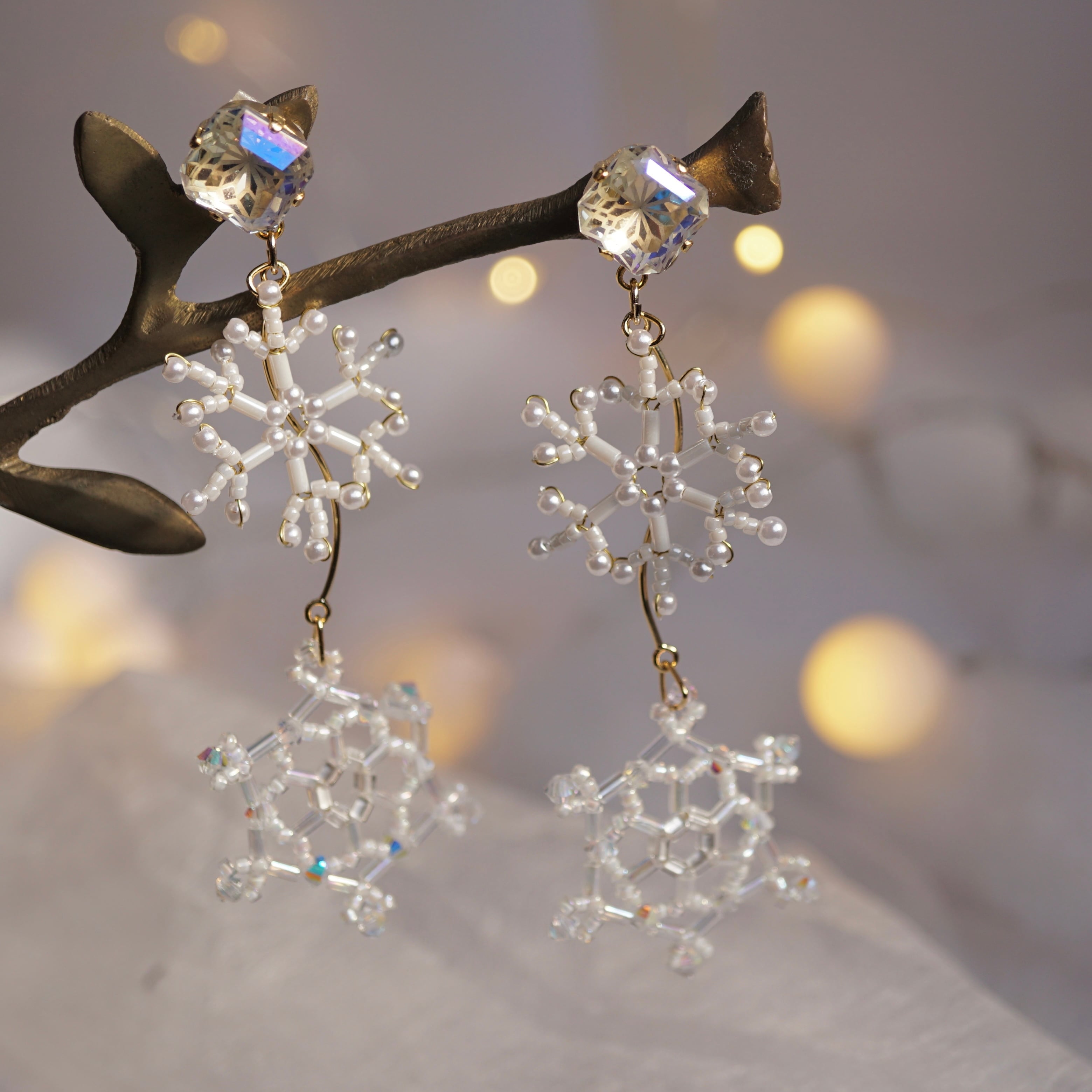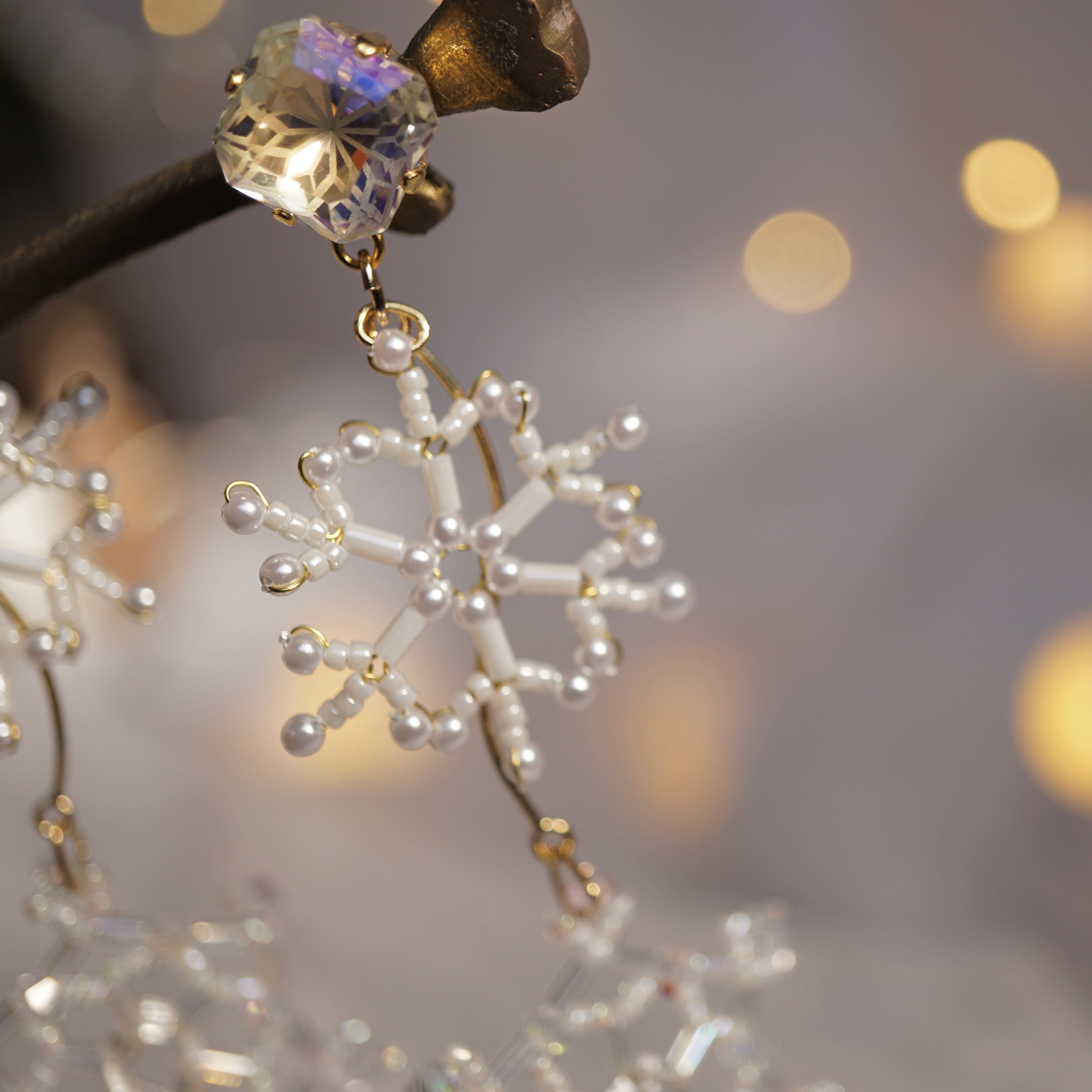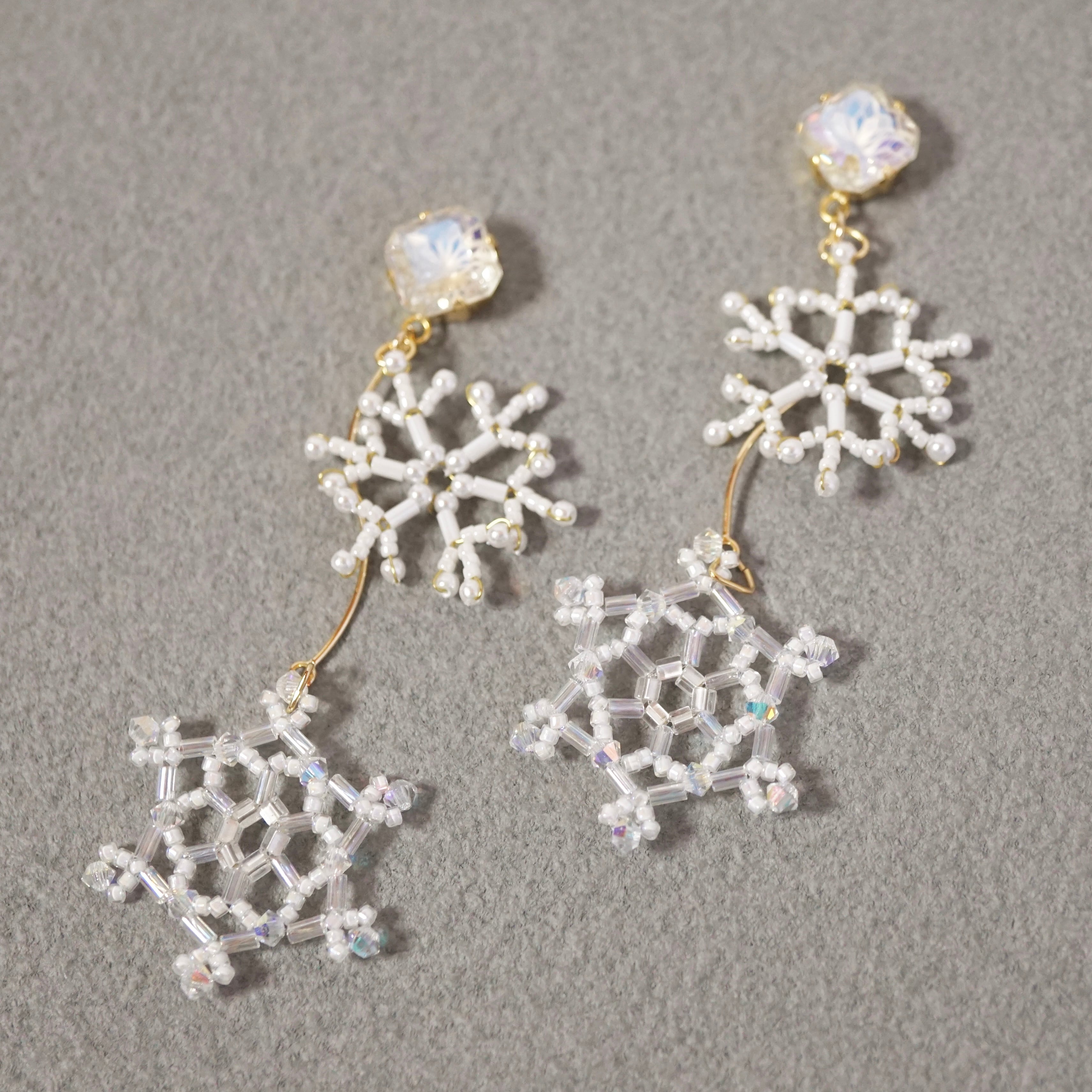 耳元で繊細な雪の結晶がキラキラ揺れる、冬にぴったりなピアス/イヤリングに仕上がりました!