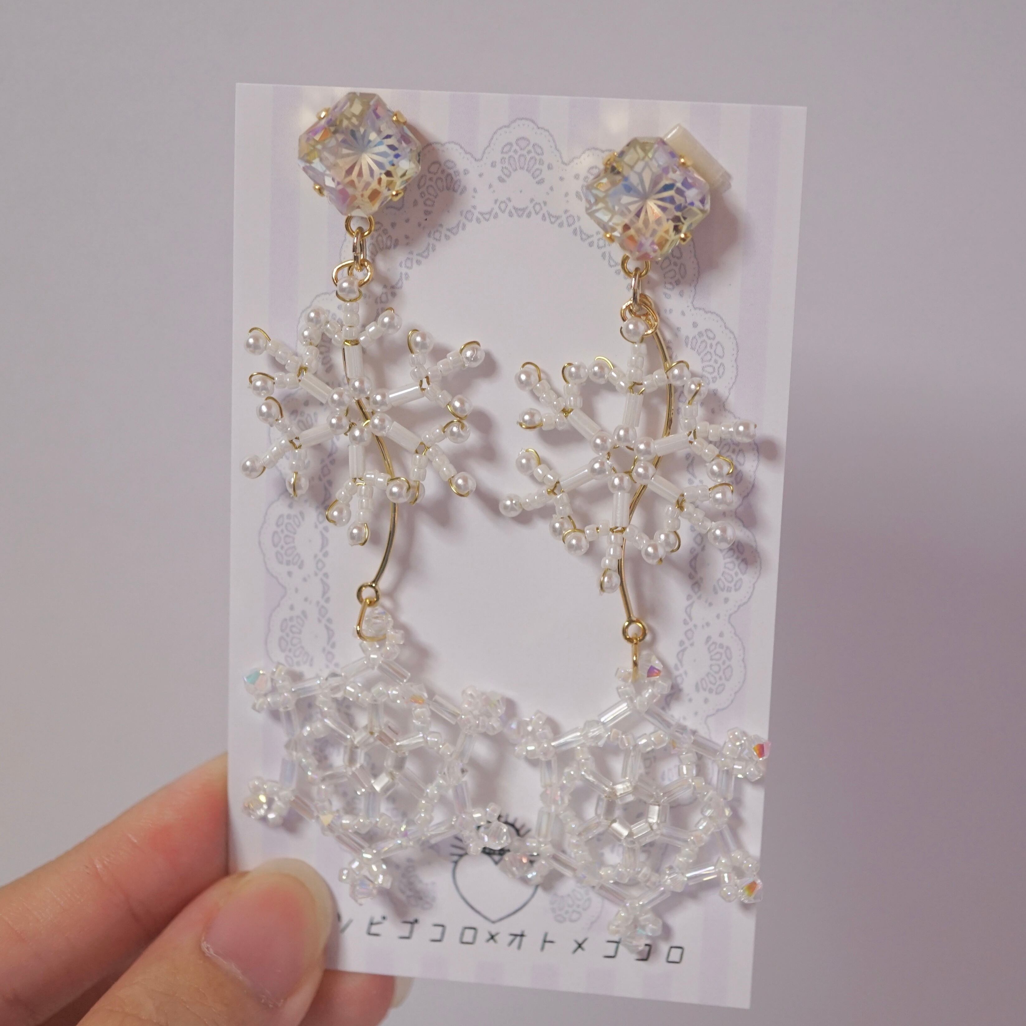ビーズで編んだ雪の結晶をあしらったピアス/イヤリングです。