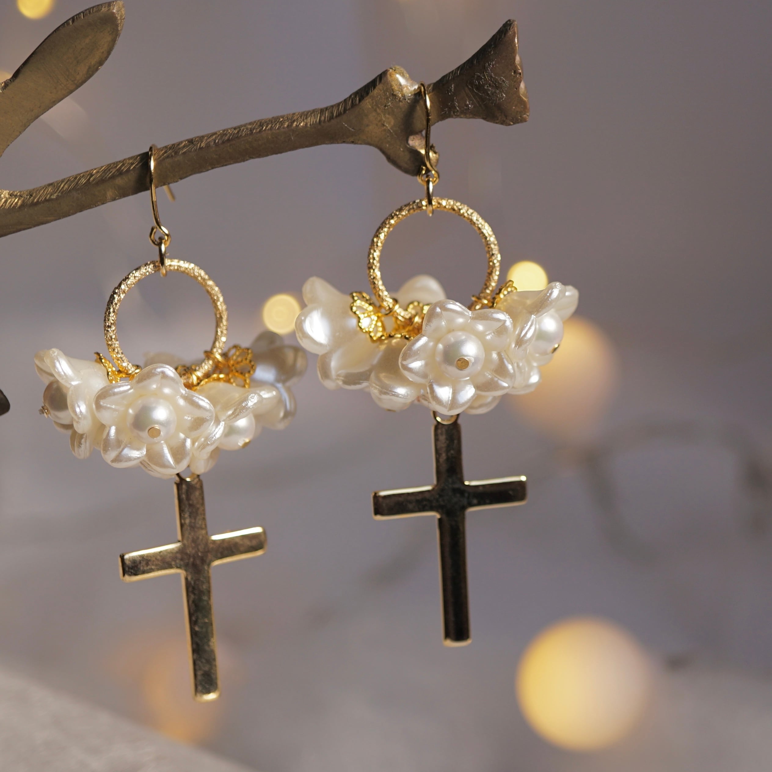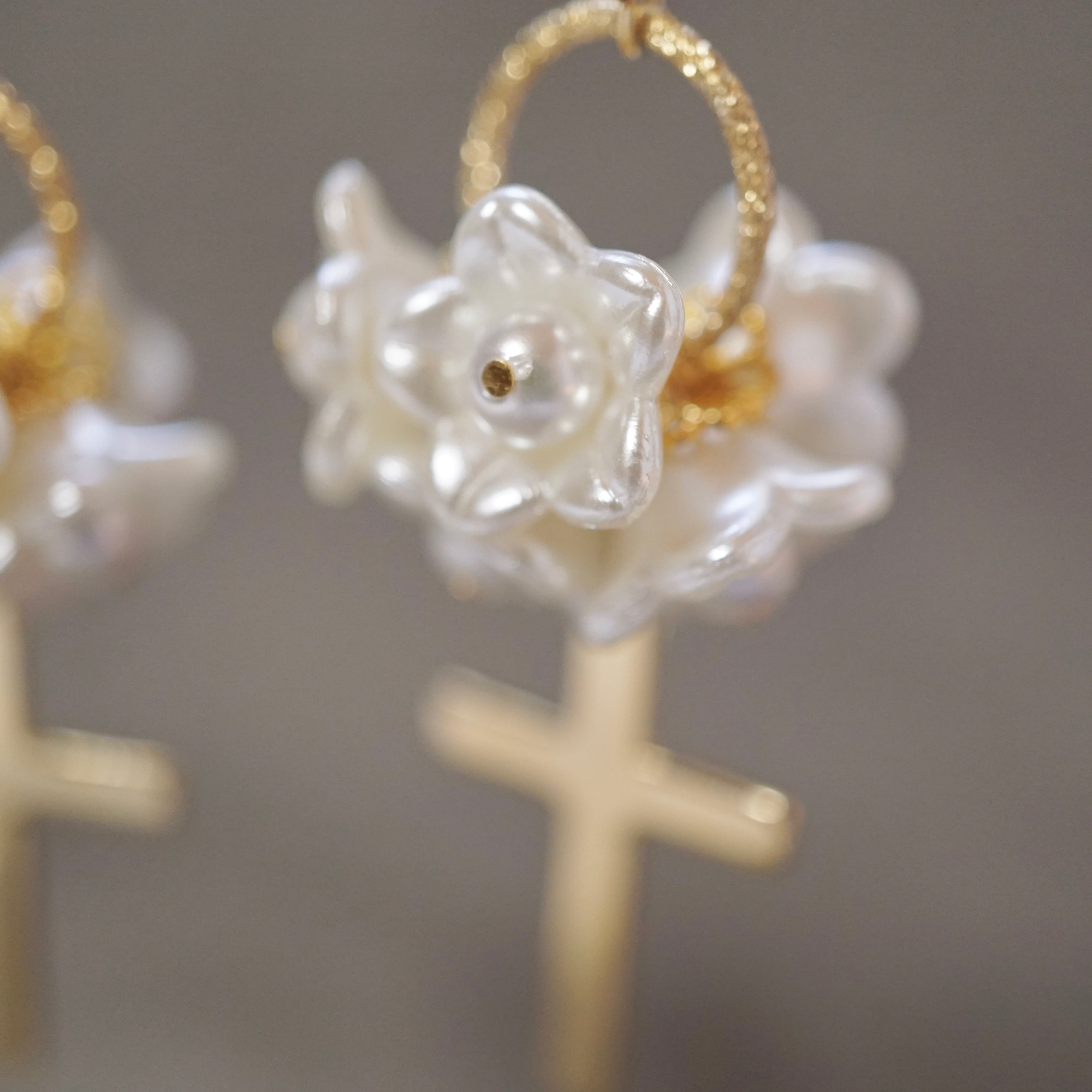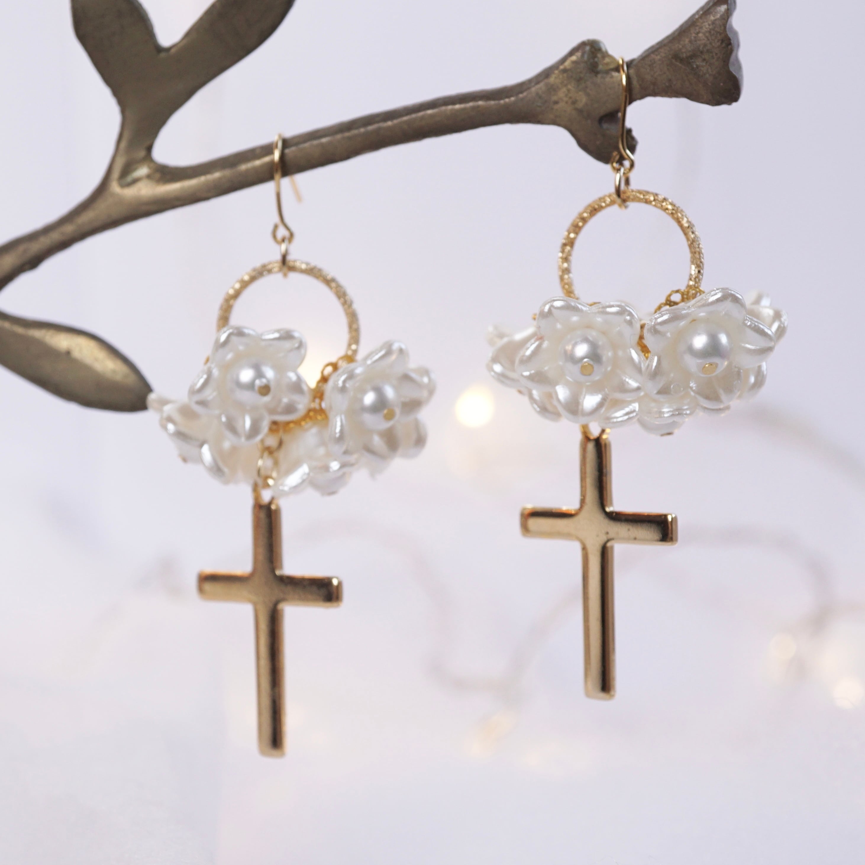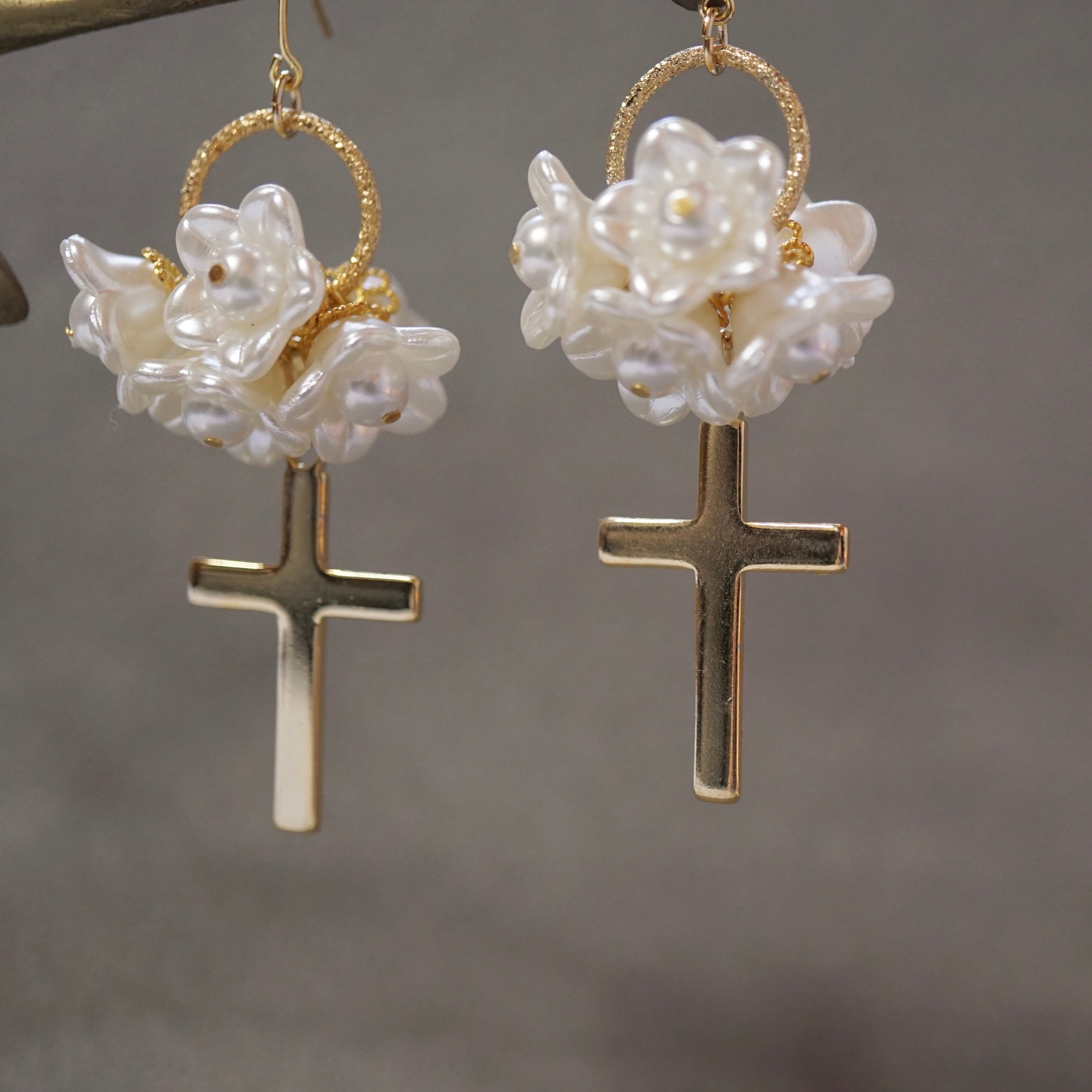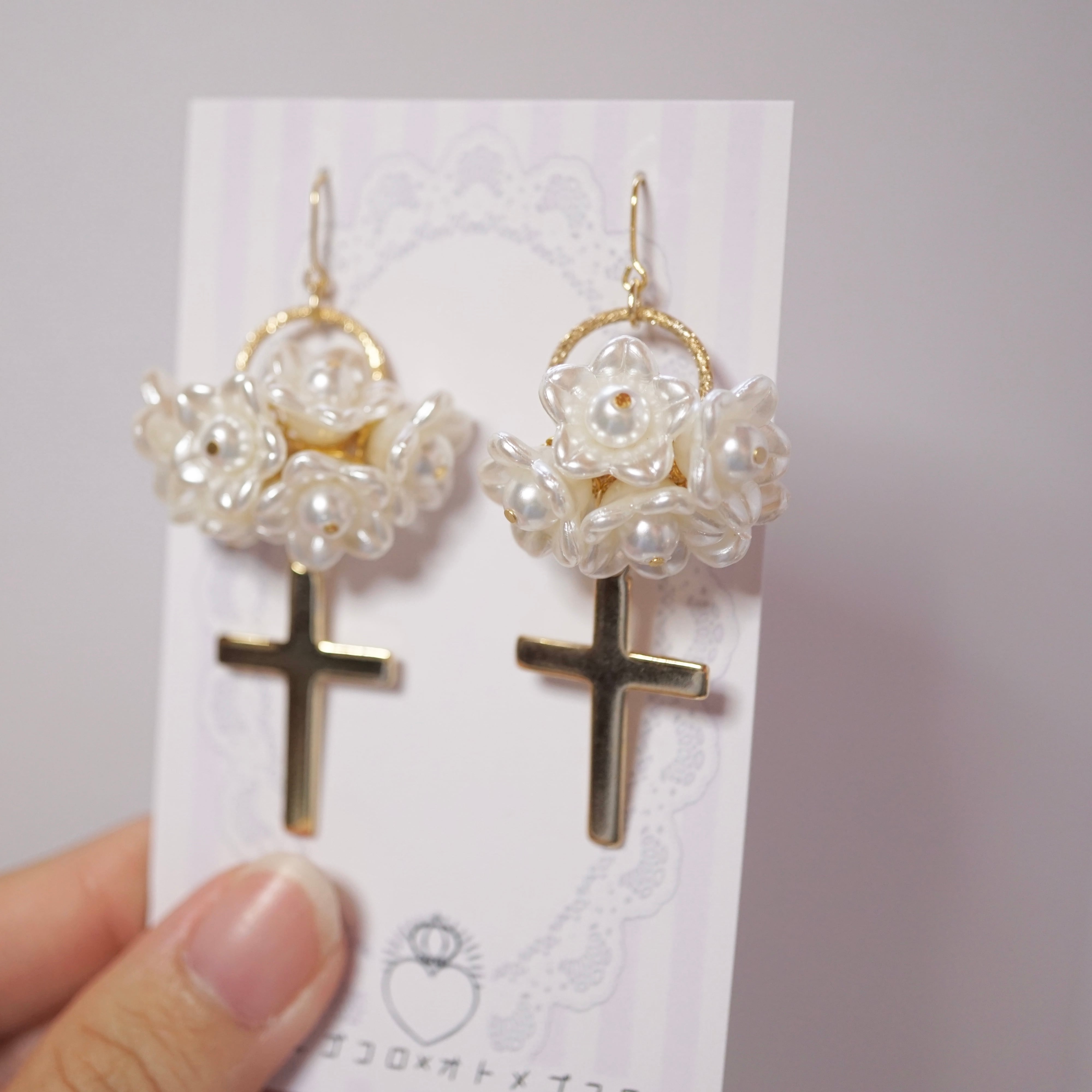 白百合の花束と十字架を合わせて、静かで美しい冬の教会をイメージしたピアス/イヤリングです。