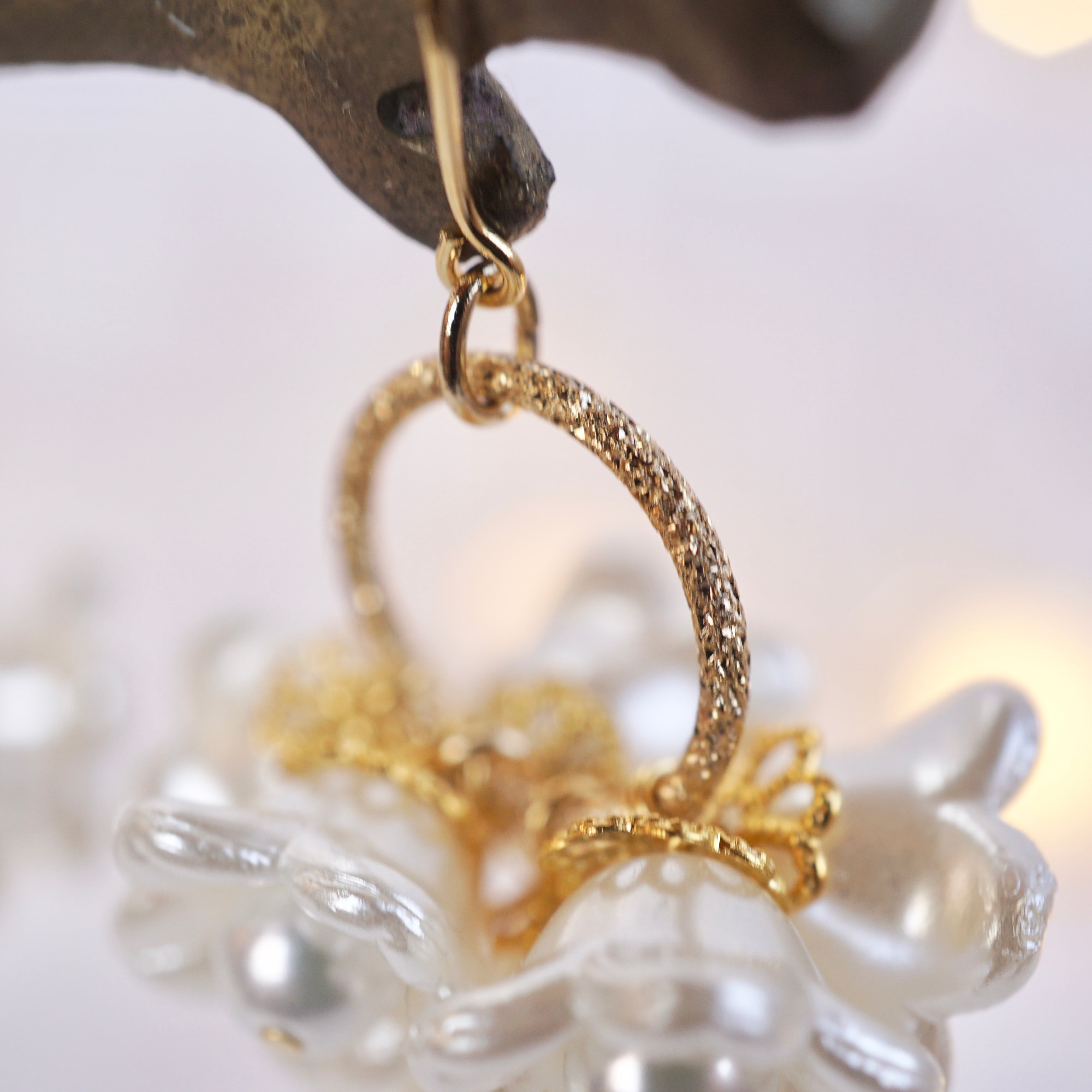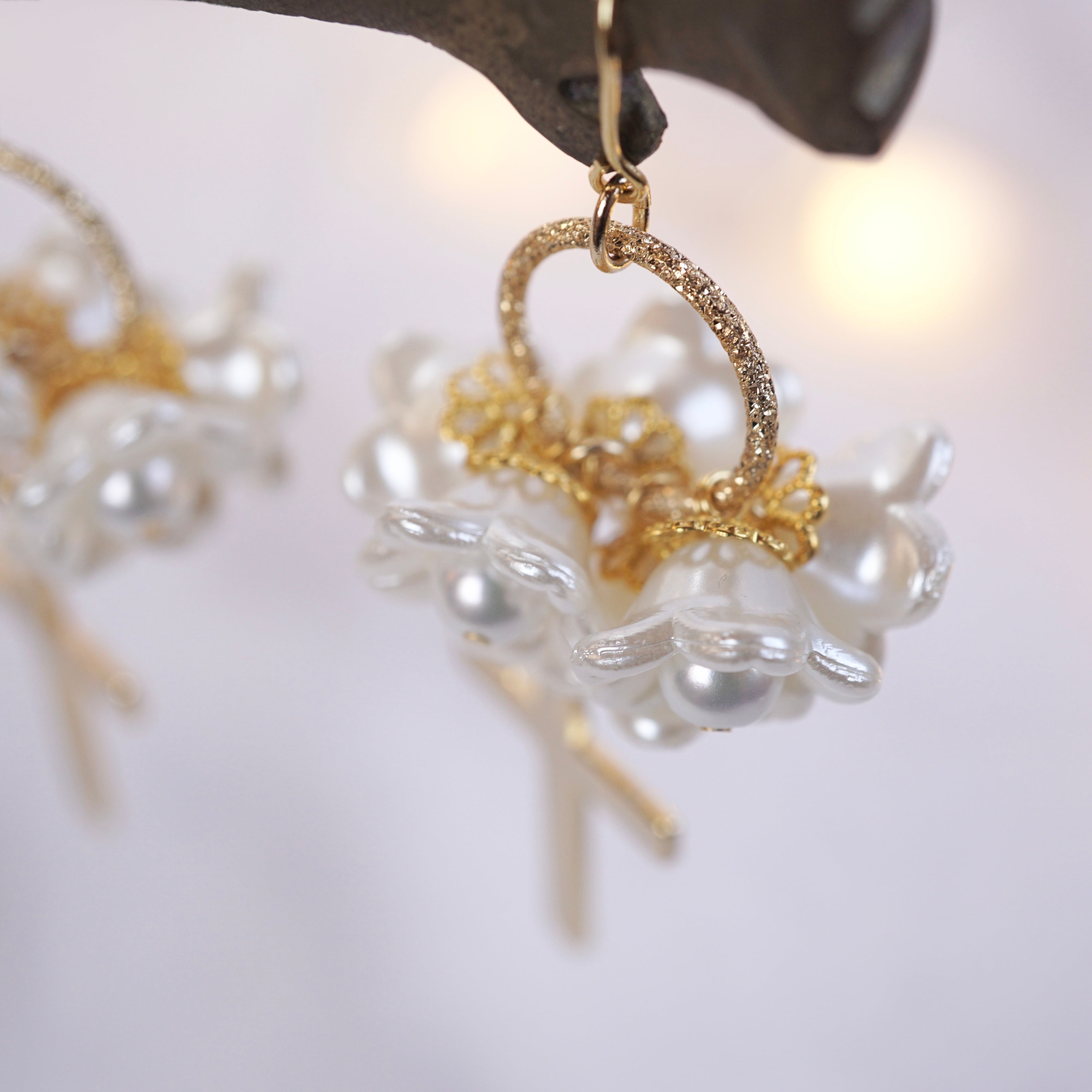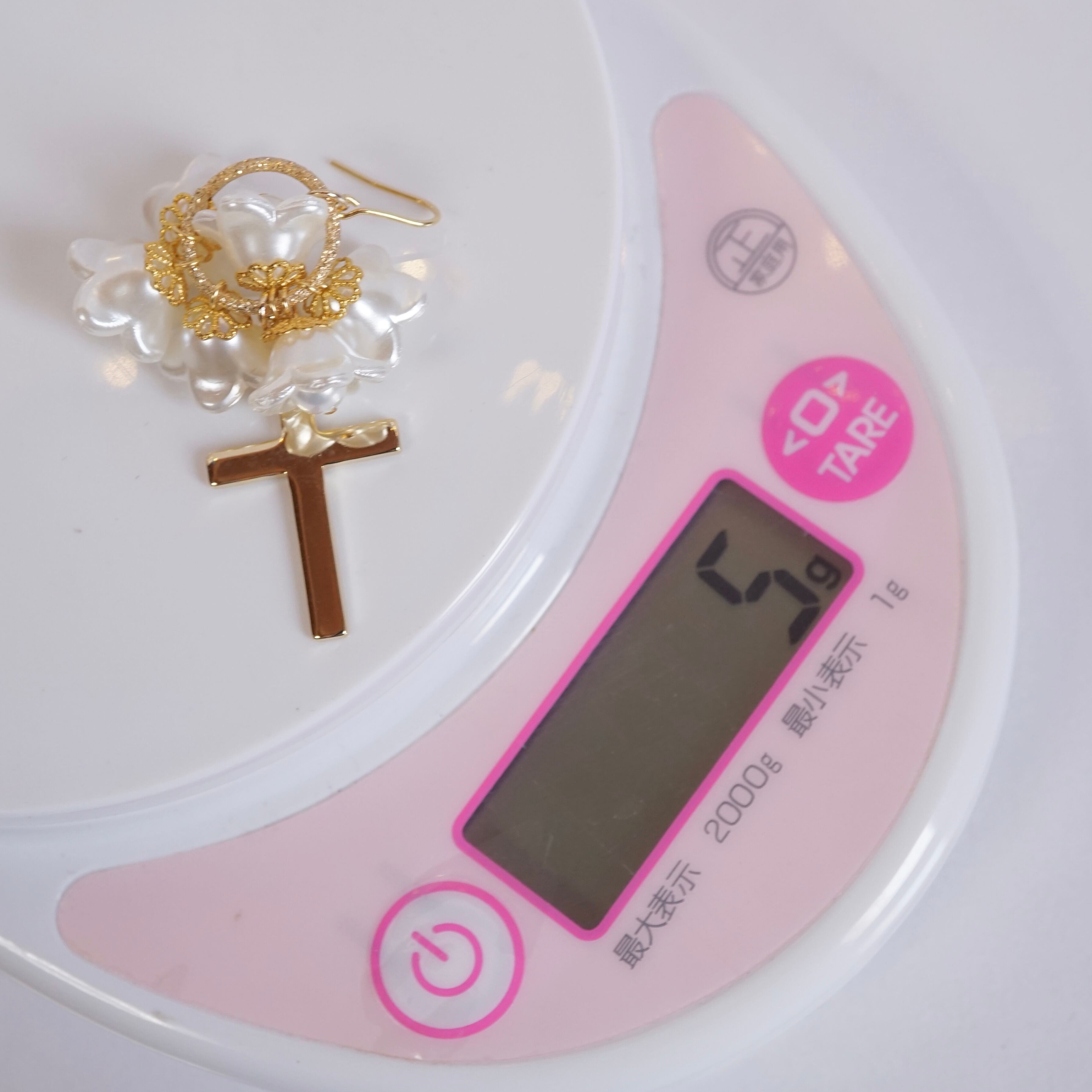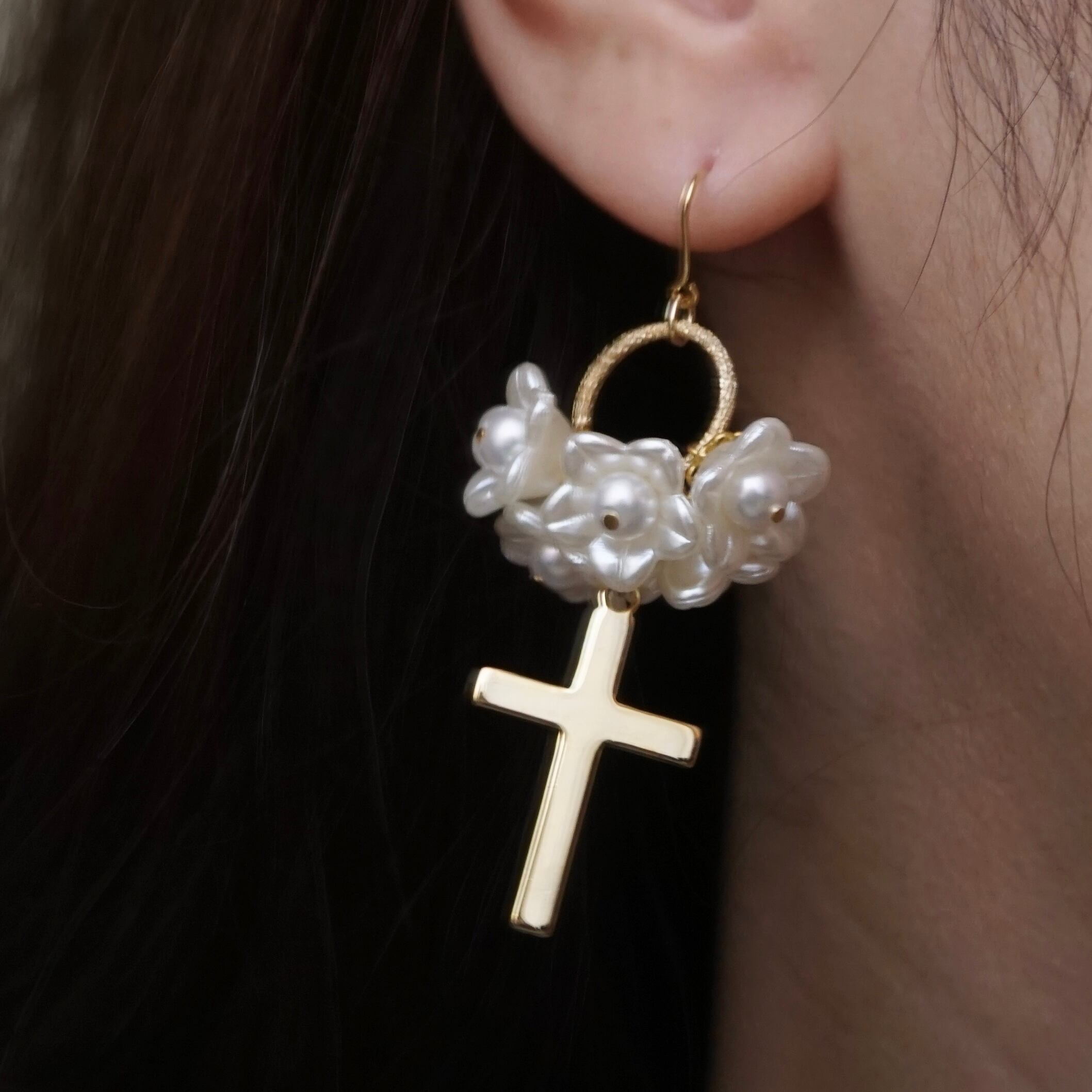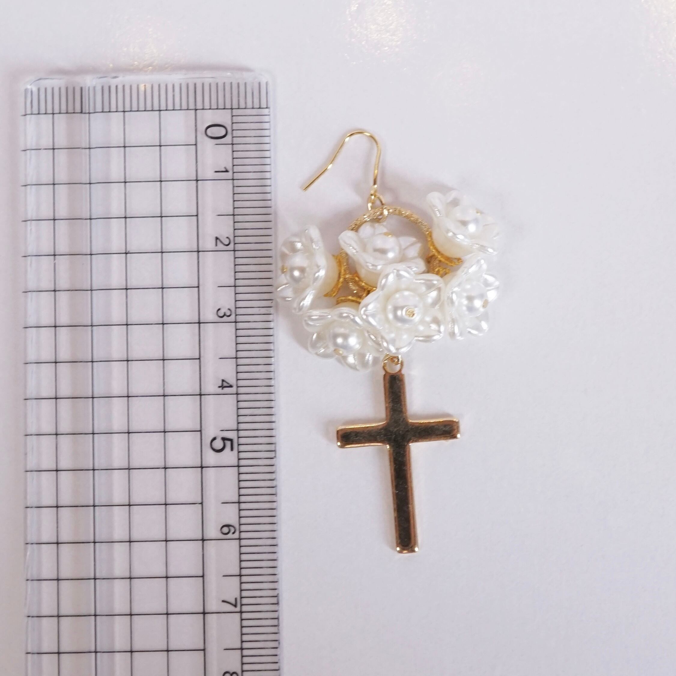 白百合の花束と十字架を合わせて、静かで美しい冬の教会をイメージしたピアス/イヤリングです。