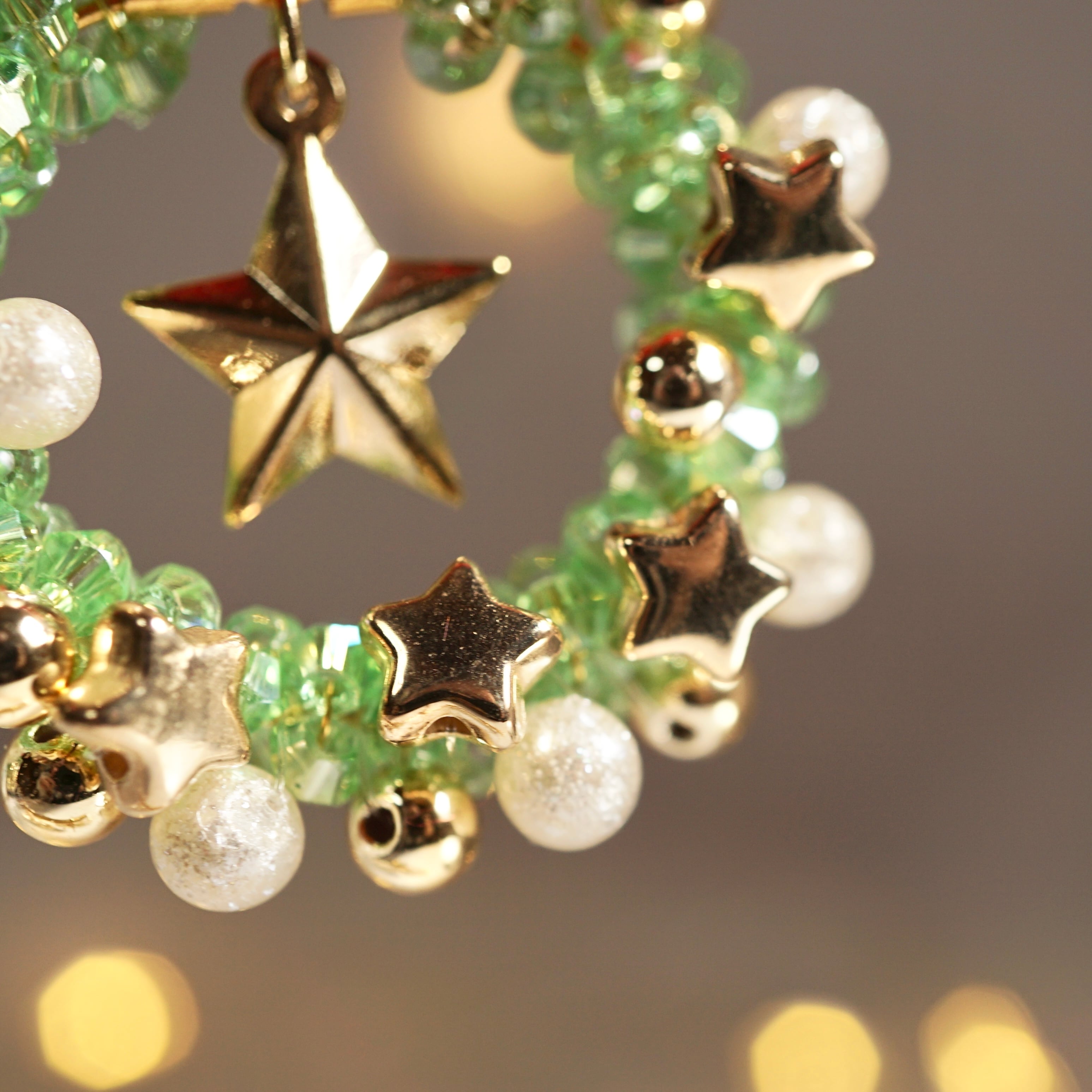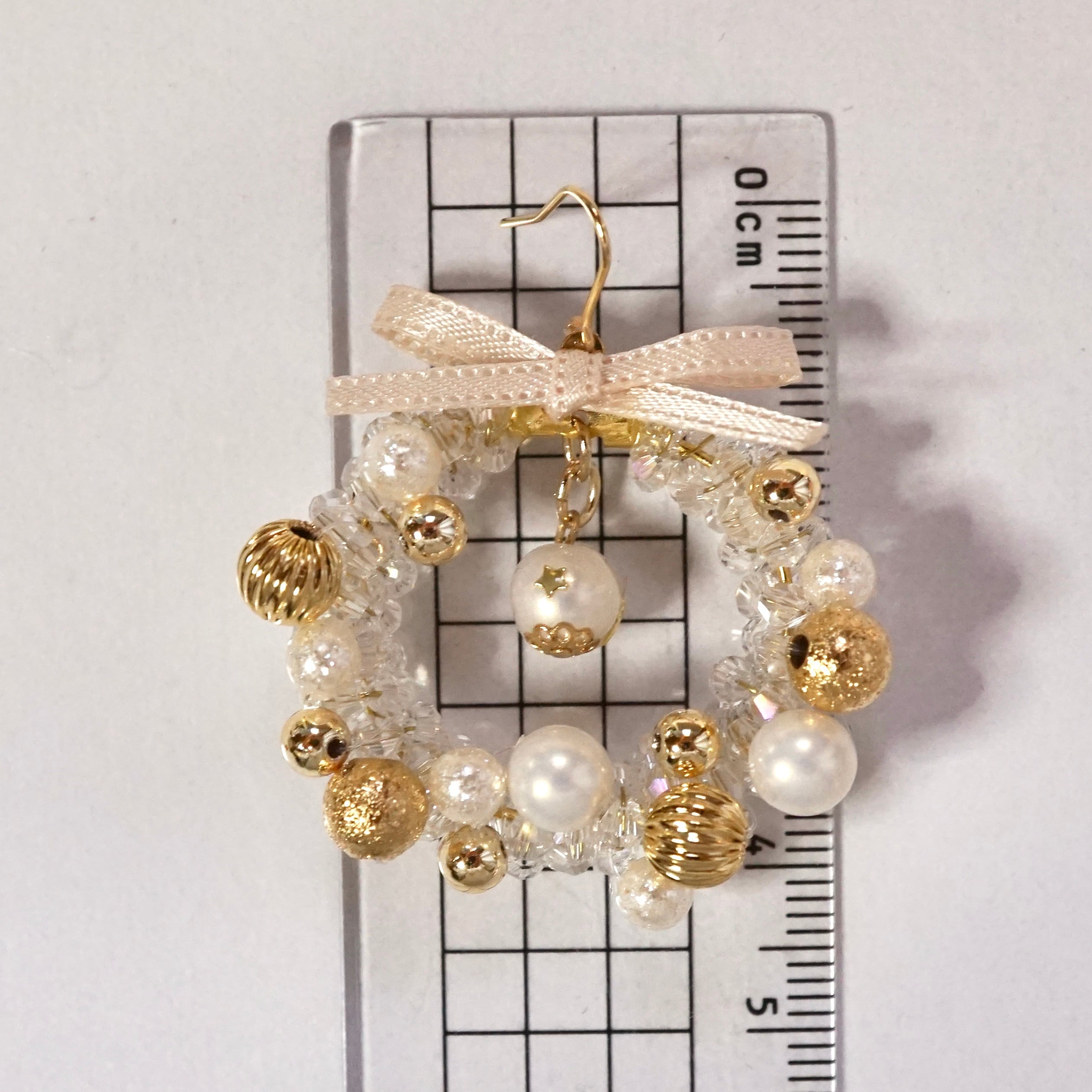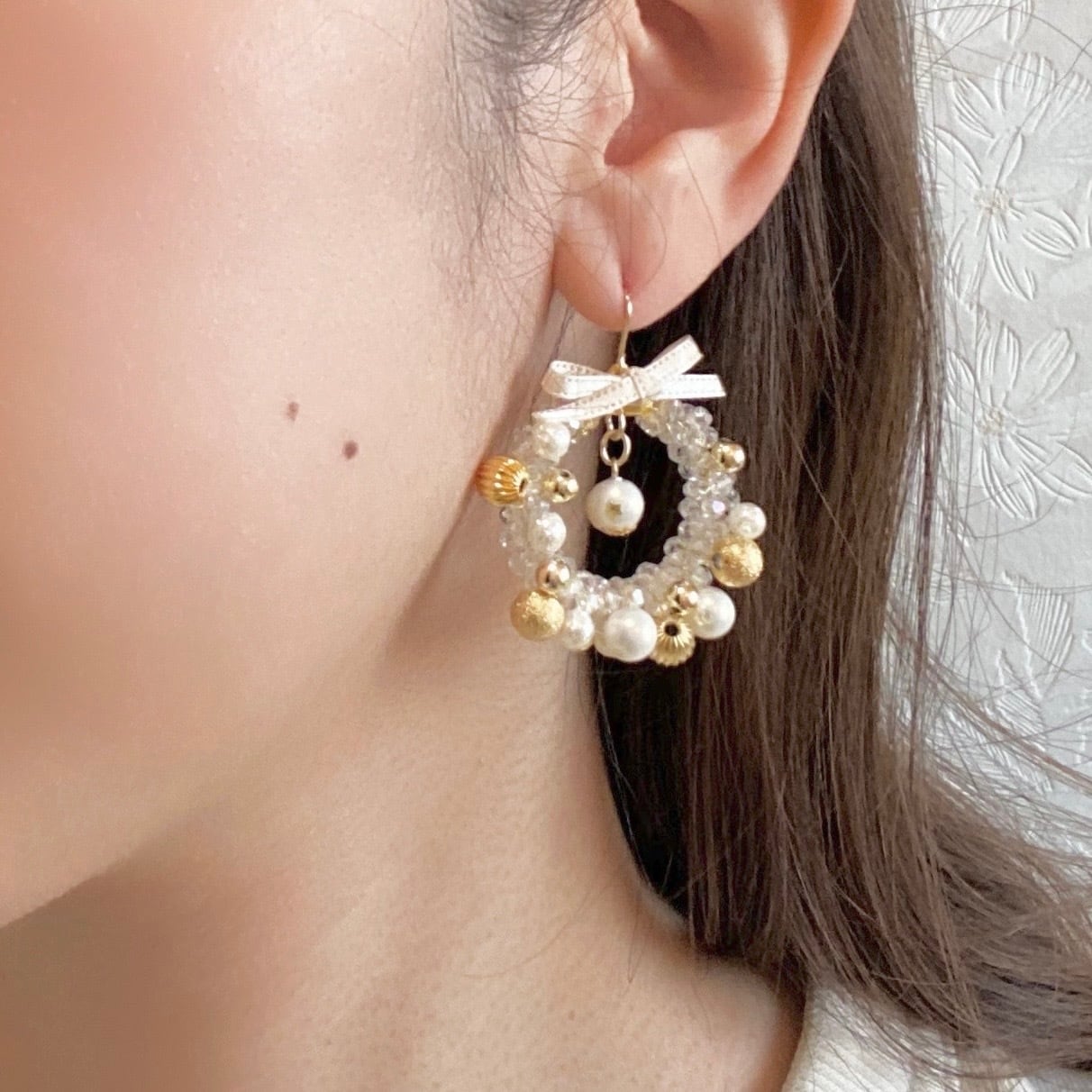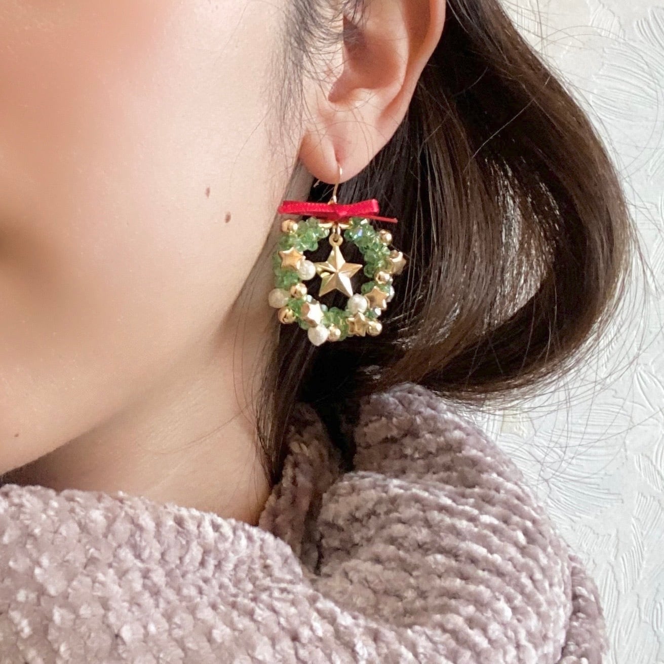 クリスマスのリースを耳元に再現したピアス/イヤリングです。クリスタルビーズで編んだリースにたくさん飾り付けをして仕上げました!
