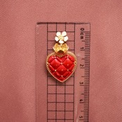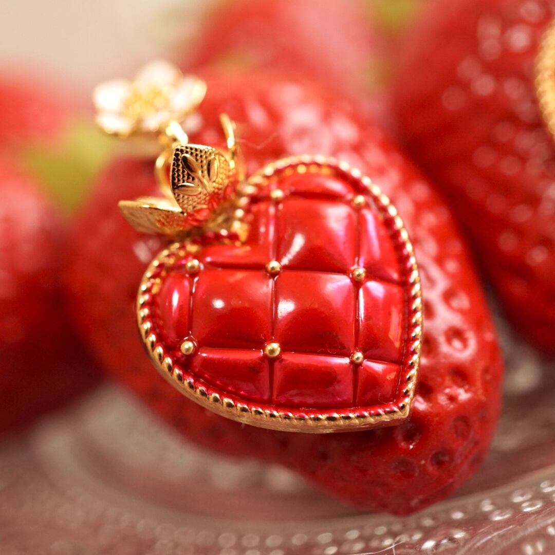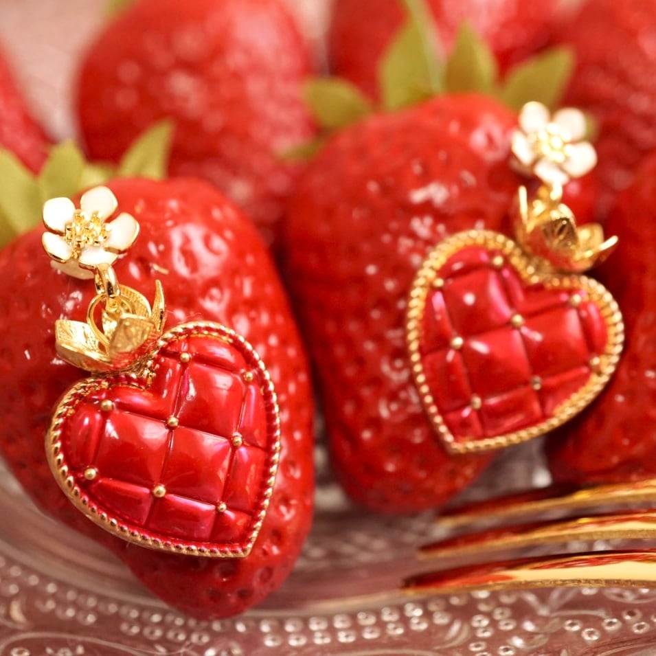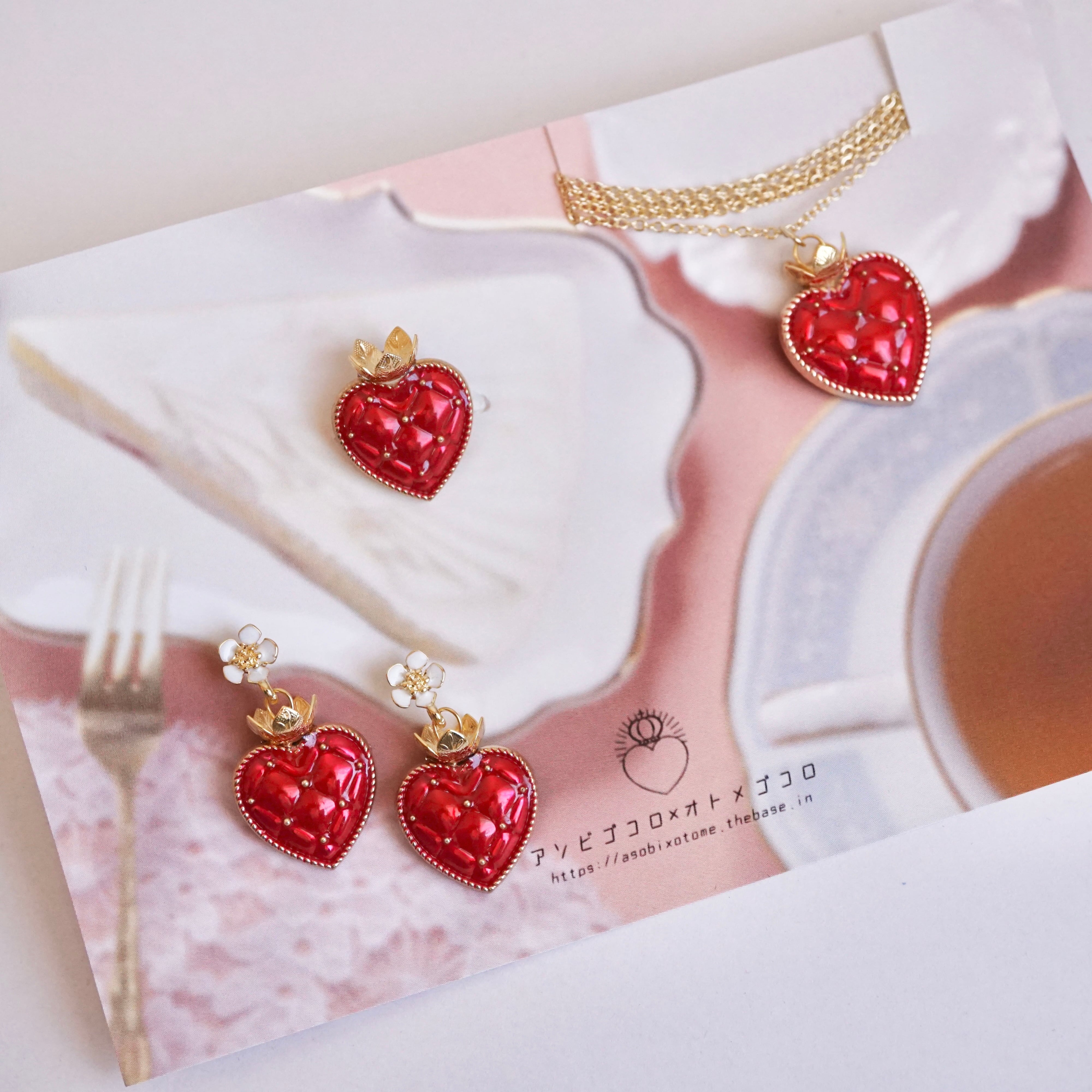 真っ赤なハートにいちごをイメージしたつぶつぶと葉っぱを合わせて仕上げました。金具部分には小さないちごのお花を添えています。