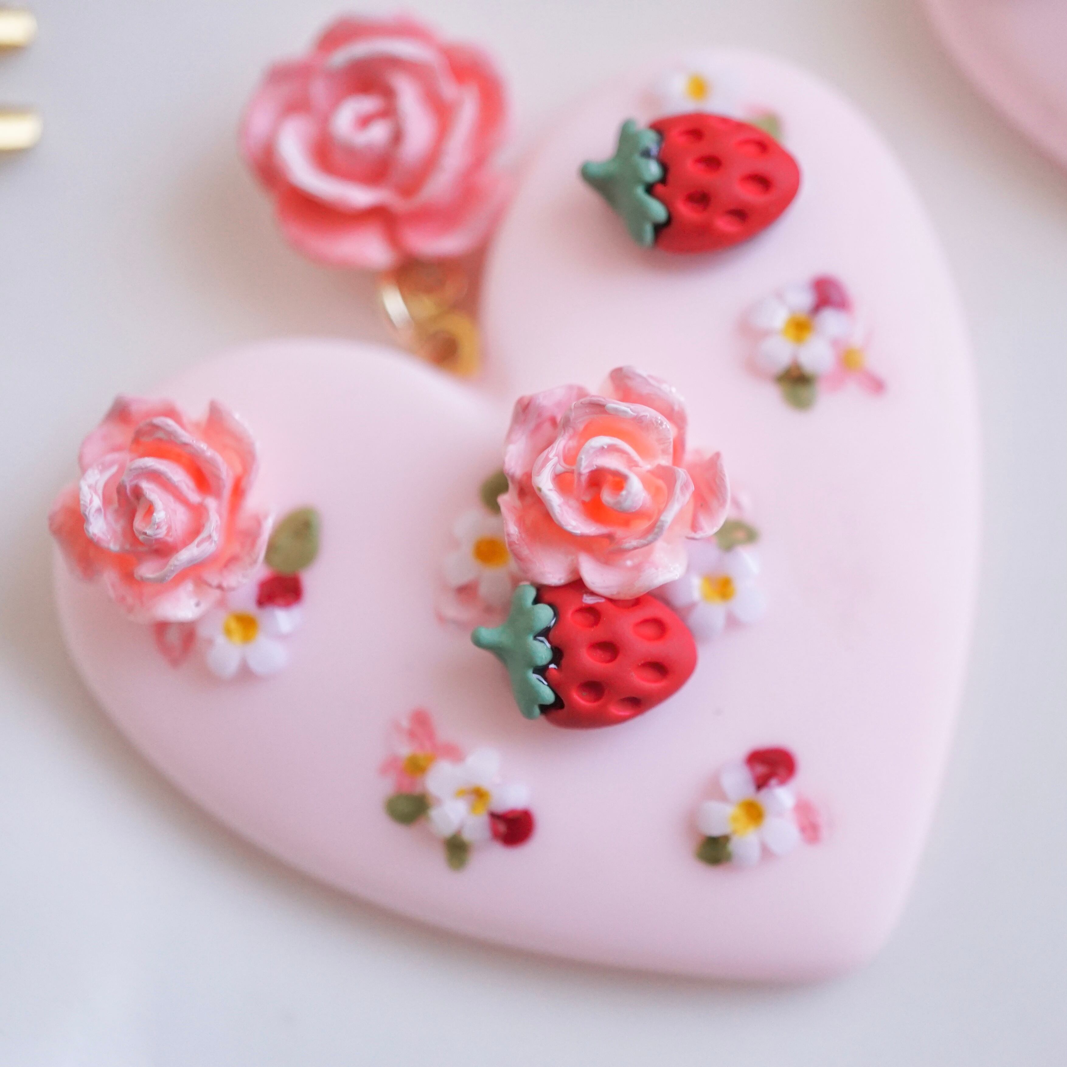 ハートの上にかわいい柄を描いたピアス/イヤリングです。いちごにローズに小さなお花、かわいいモチーフをたくさん集めて仕上げました。