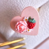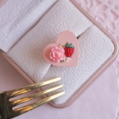 ハートの上にかわいい柄を描いたリングです。いちごにローズに小さなお花、かわいいモチーフをたくさん集めて仕上げました。