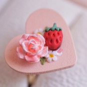 いちごはころんとした形がかわいいものを選びました。ローズはお砂糖で作ったような色に塗装し、砂糖菓子のような色合いに仕上げました。