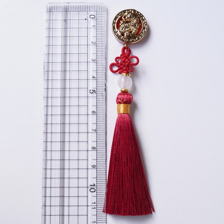 金具・結びの色に合わせて紅とゴールドのタッセルを使用しました。