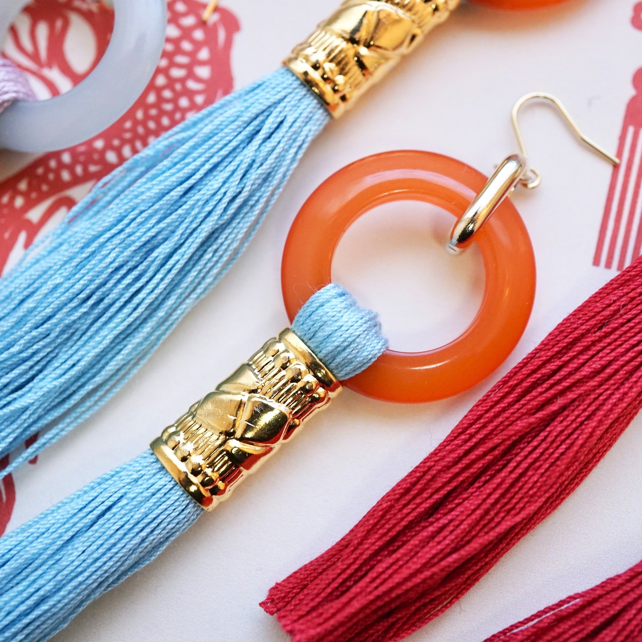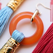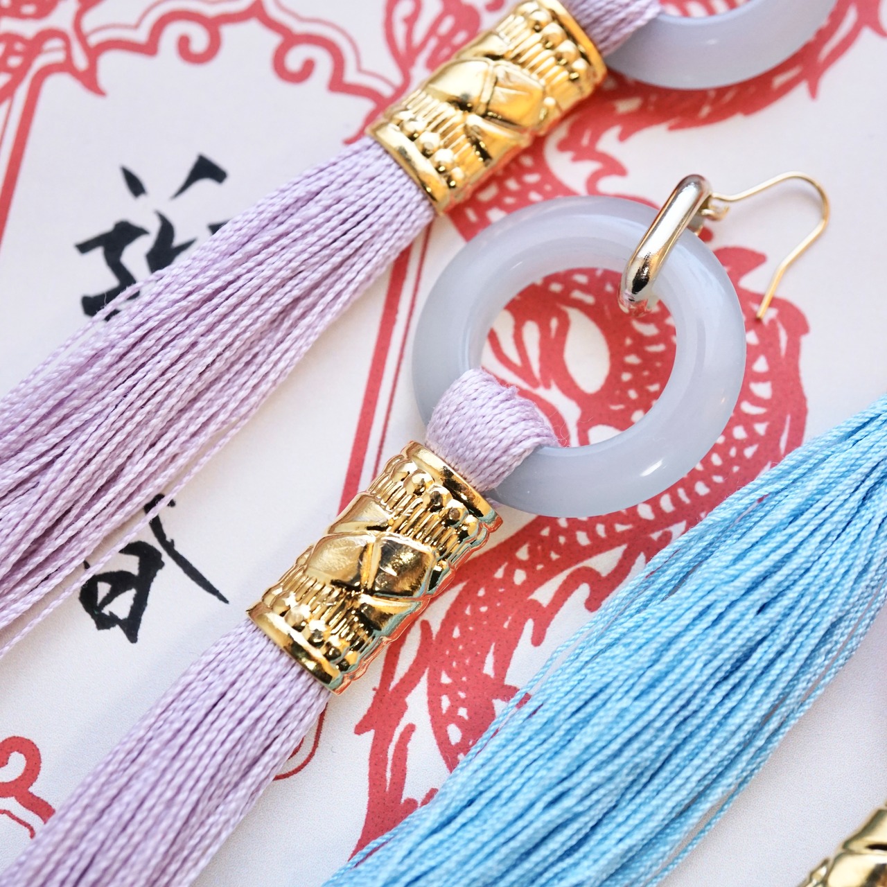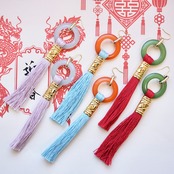チャイナとかわいいを掛け合わせたピアス/イヤリングです。こちらは輪と色の組み合わせをテーマに制作しました。