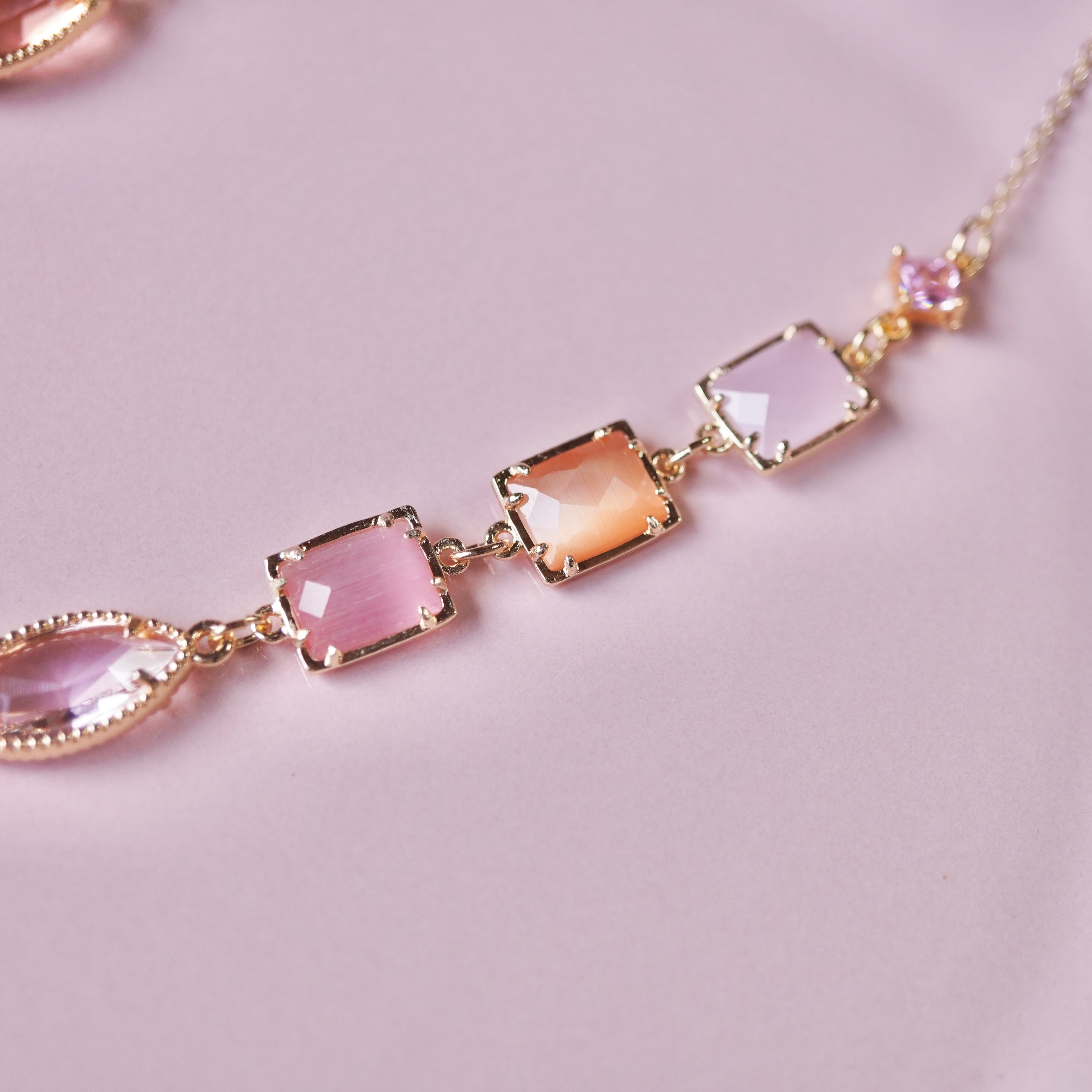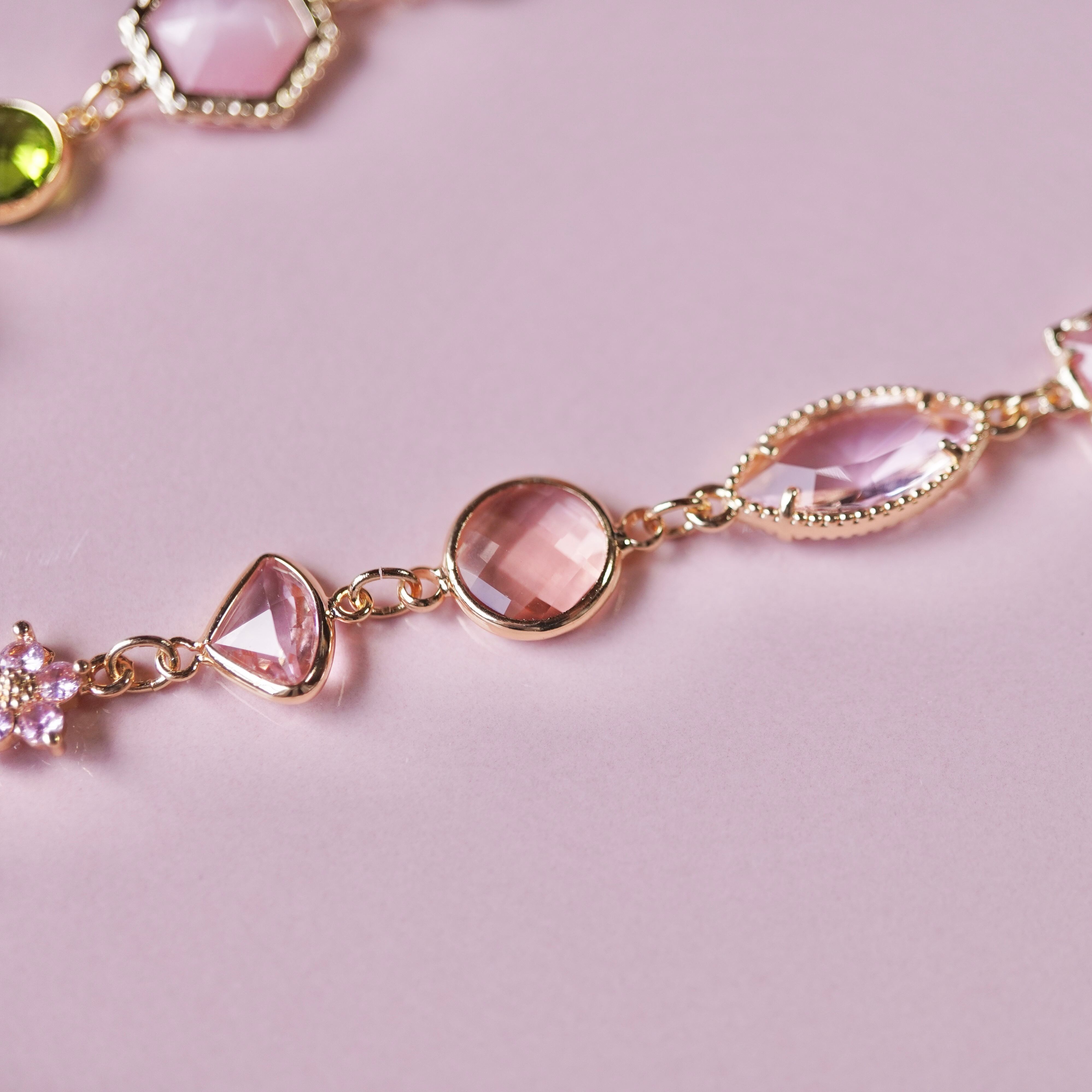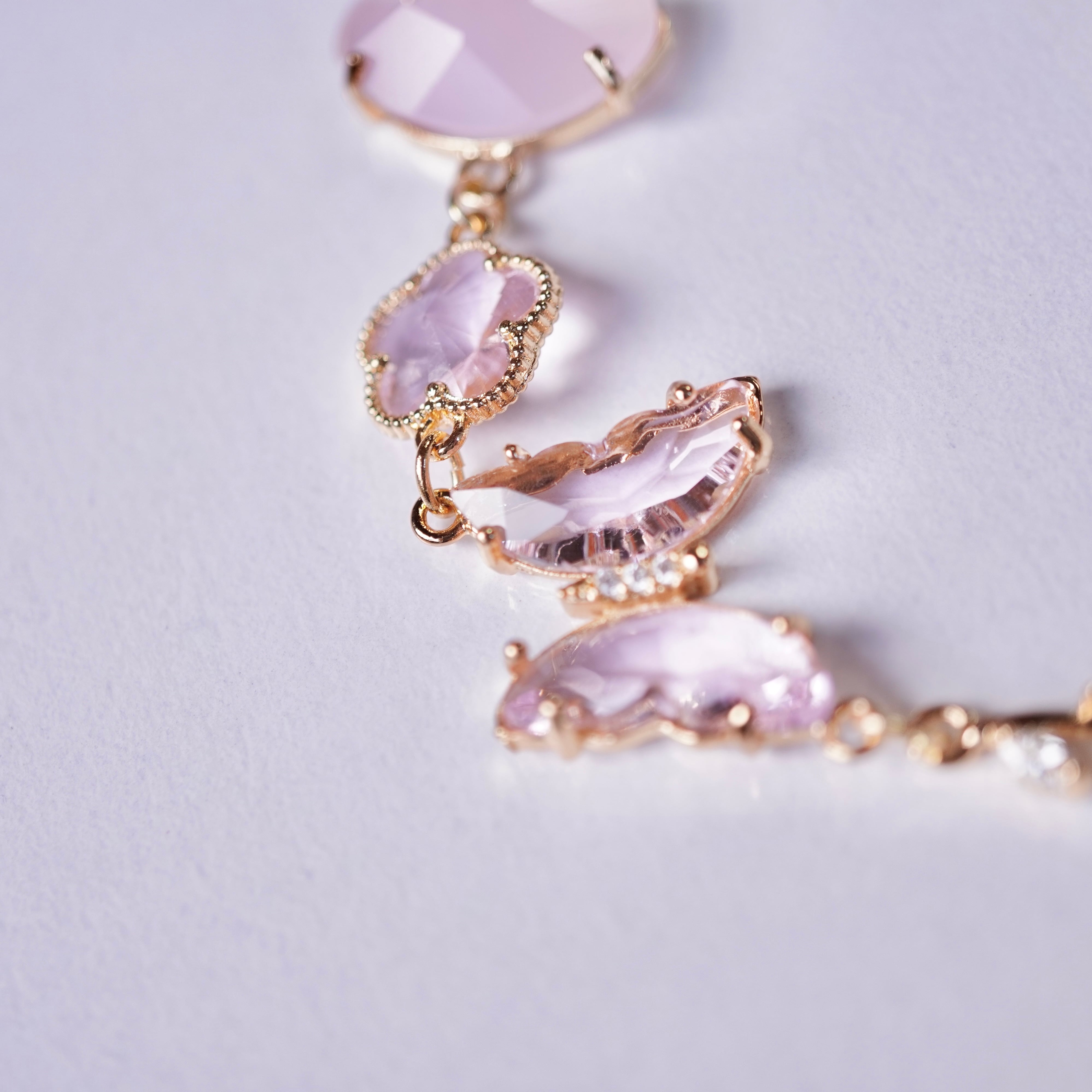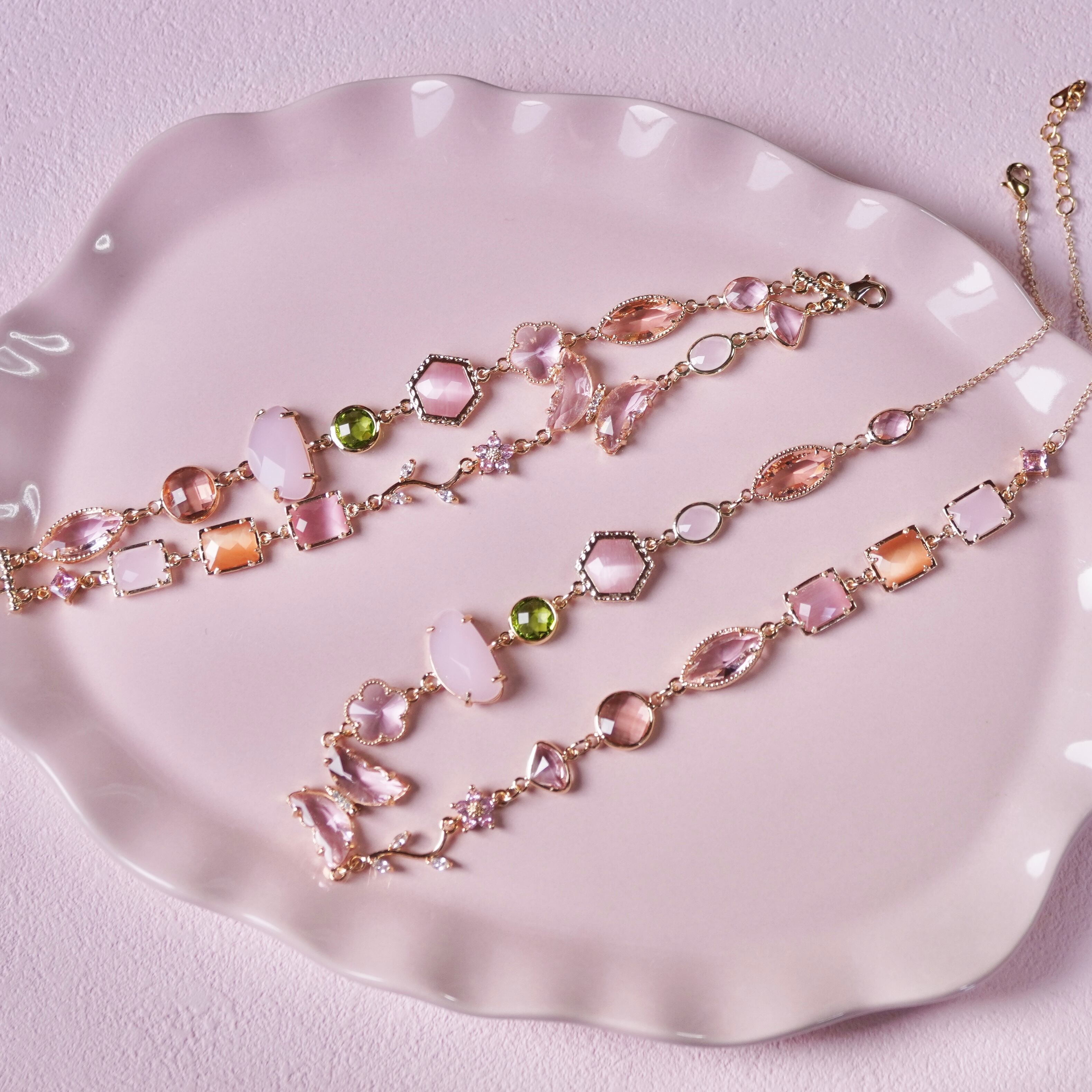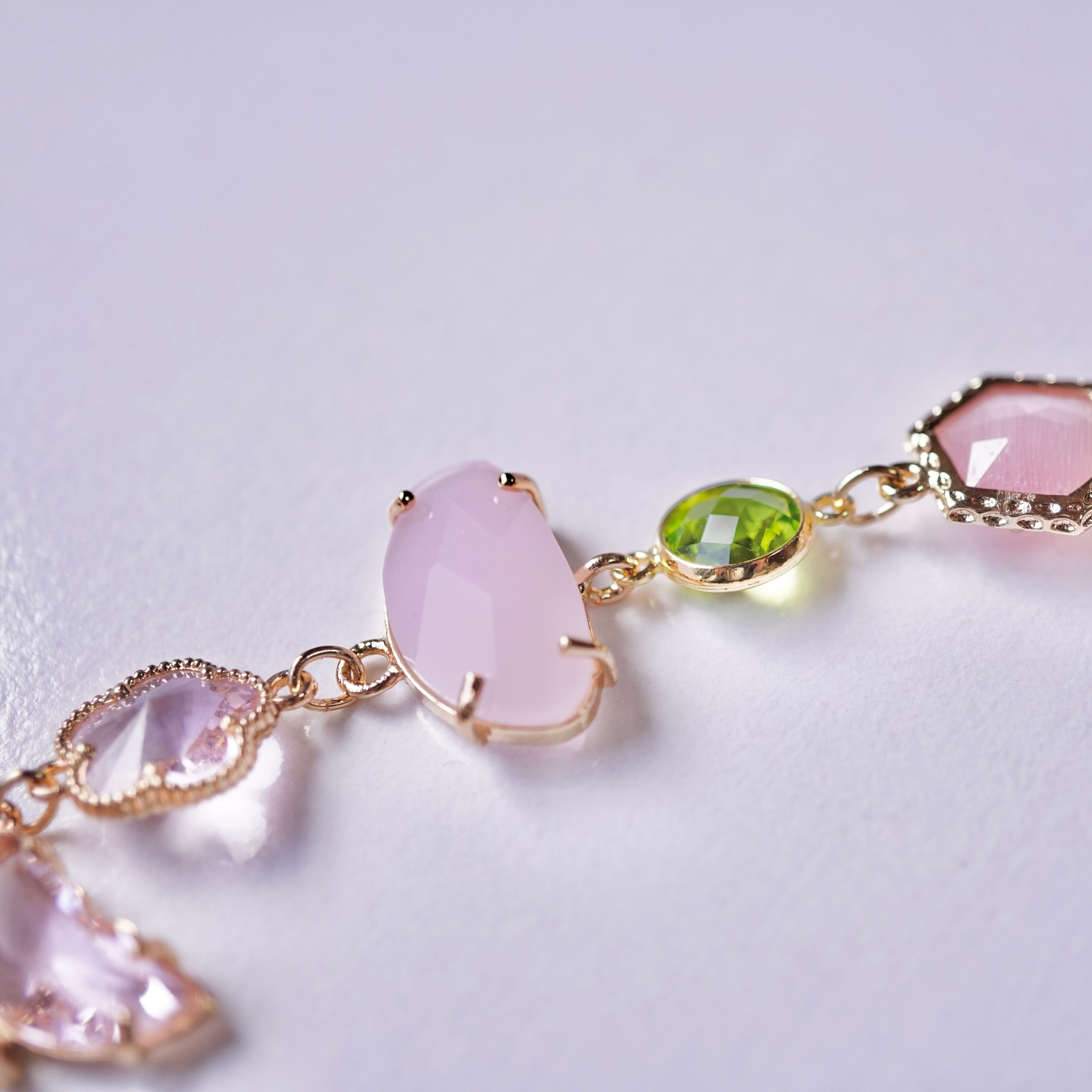 桜をイメージした様々なカラーのビジューを贅沢にあしらったネックレスです。花や蝶のモチーフで春にぴったりのネックレスに仕立てました。