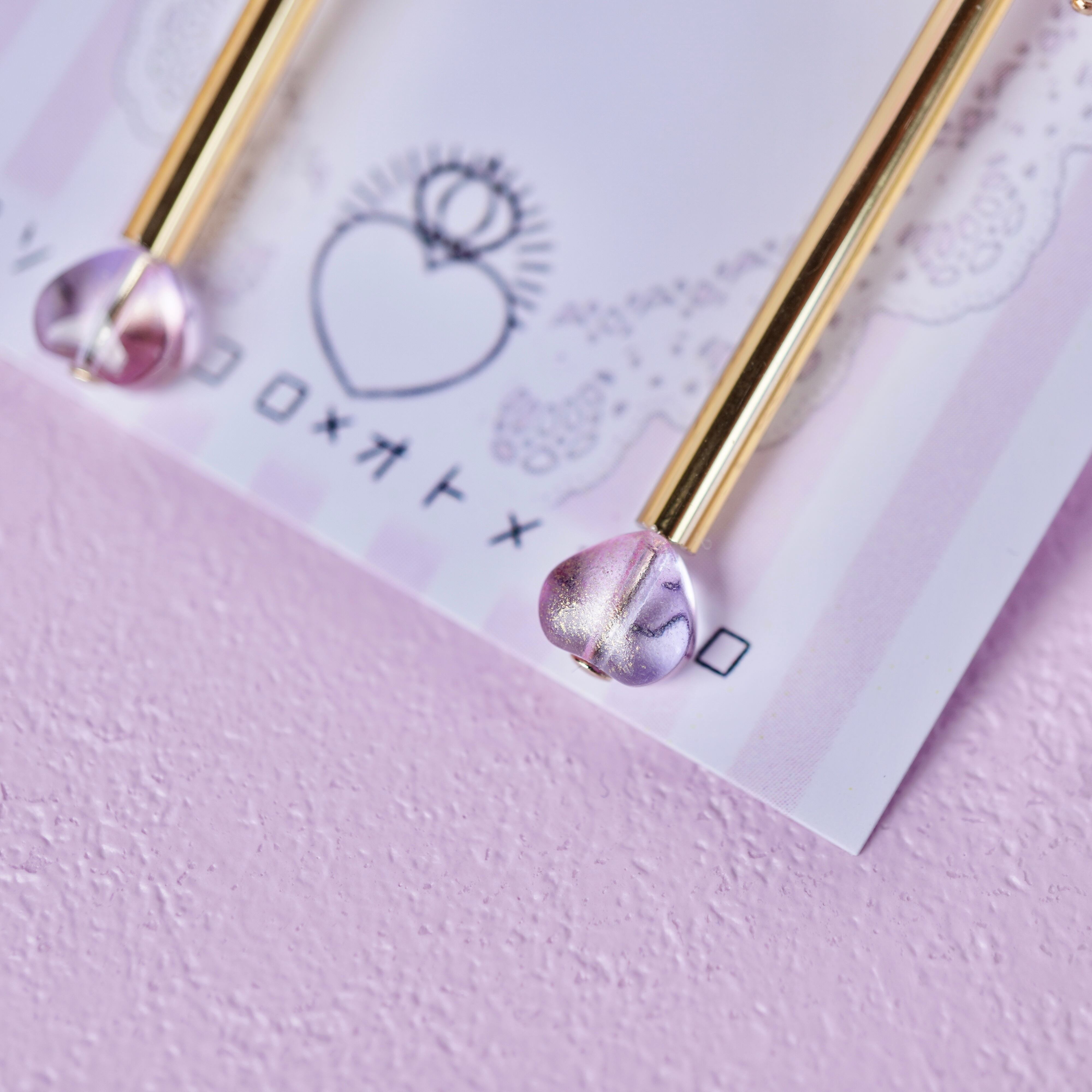 魔法のステッキをテーマに制作したピアス/イヤリングです。黒のリボンを合わせてシックに仕上げました。杖の下にもハートをひとつぶあしらい、ハートをづくしになっています!