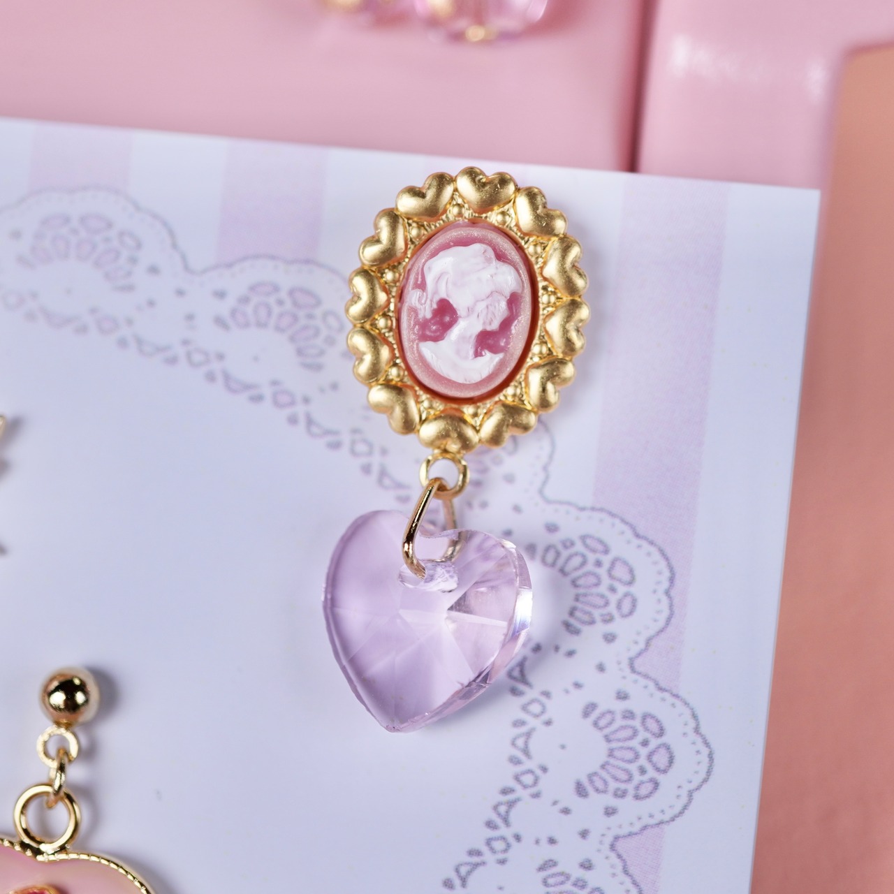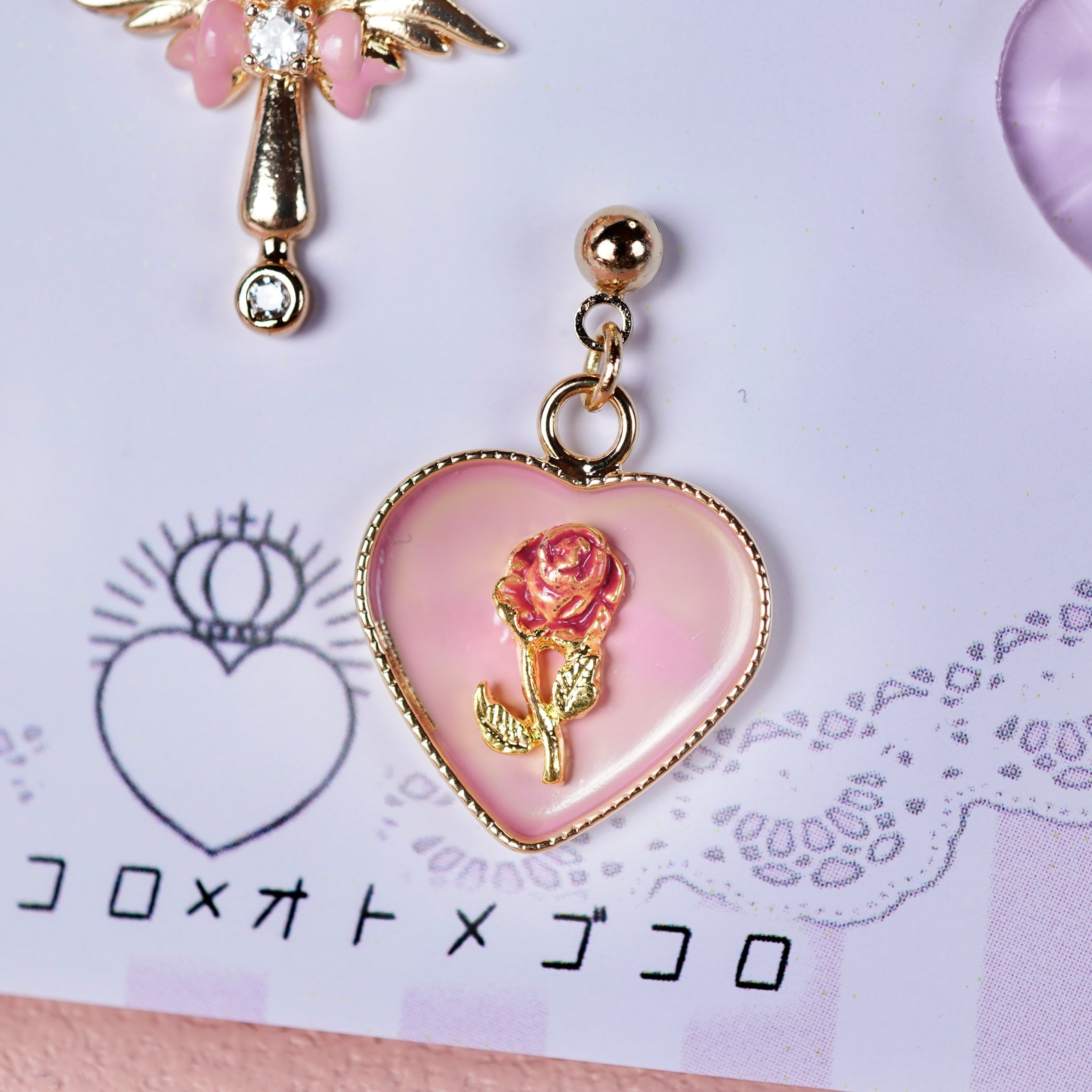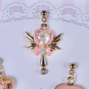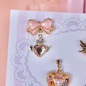 全体をピンクでかわいくに仕上げました。魔法少女に欠かせない魔法のステッキ、変身コンパクトなどときめくアイテムの小さなピアス/イヤリングを詰め込みました。