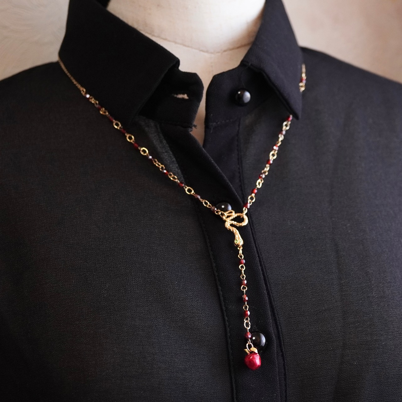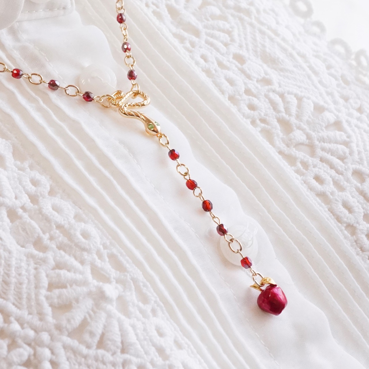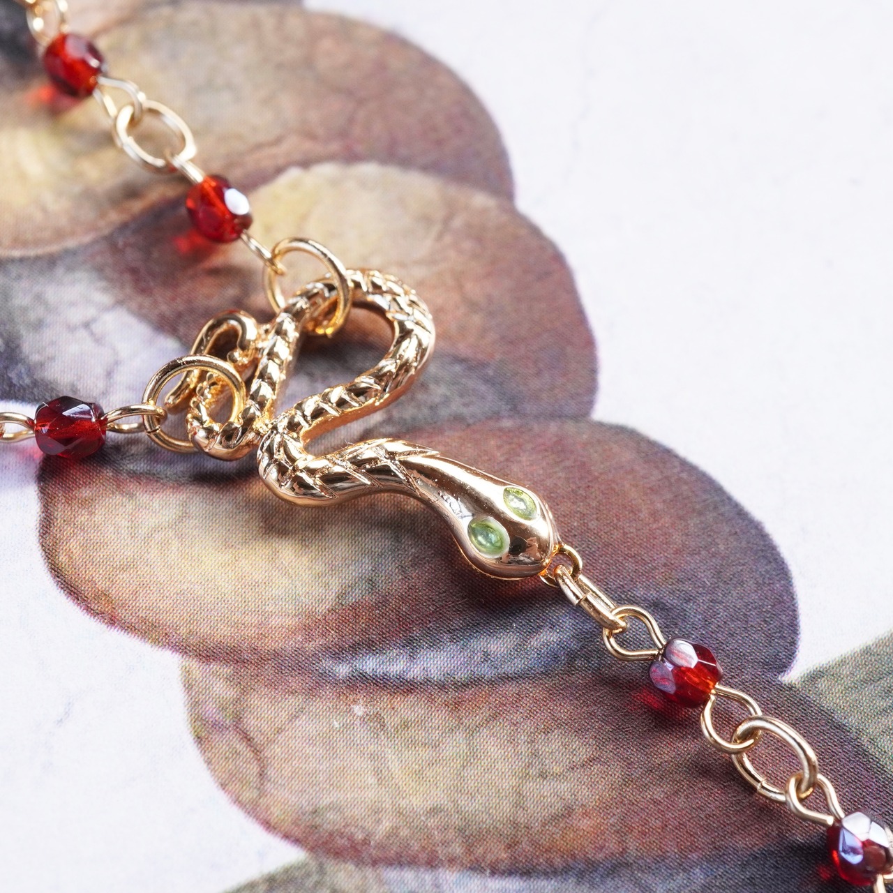 ロザリオ型のネックレスは輝きが美しいガラスビーズを使用しました。真ん中で緑の瞳の蛇が輝き、林檎が揺れます。