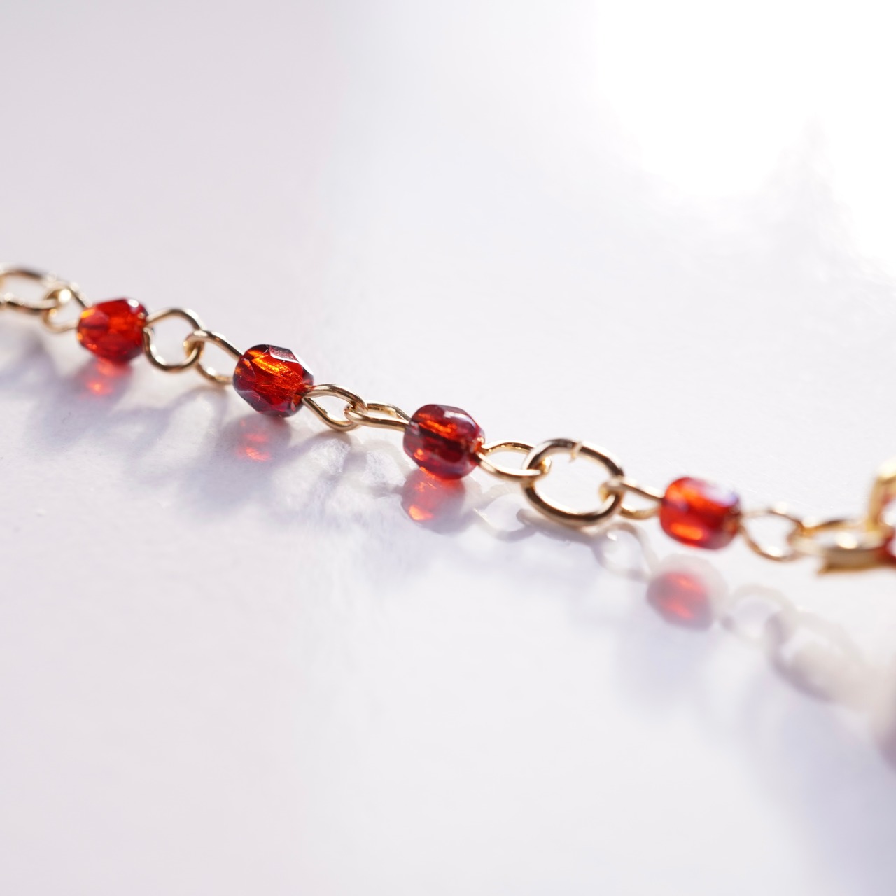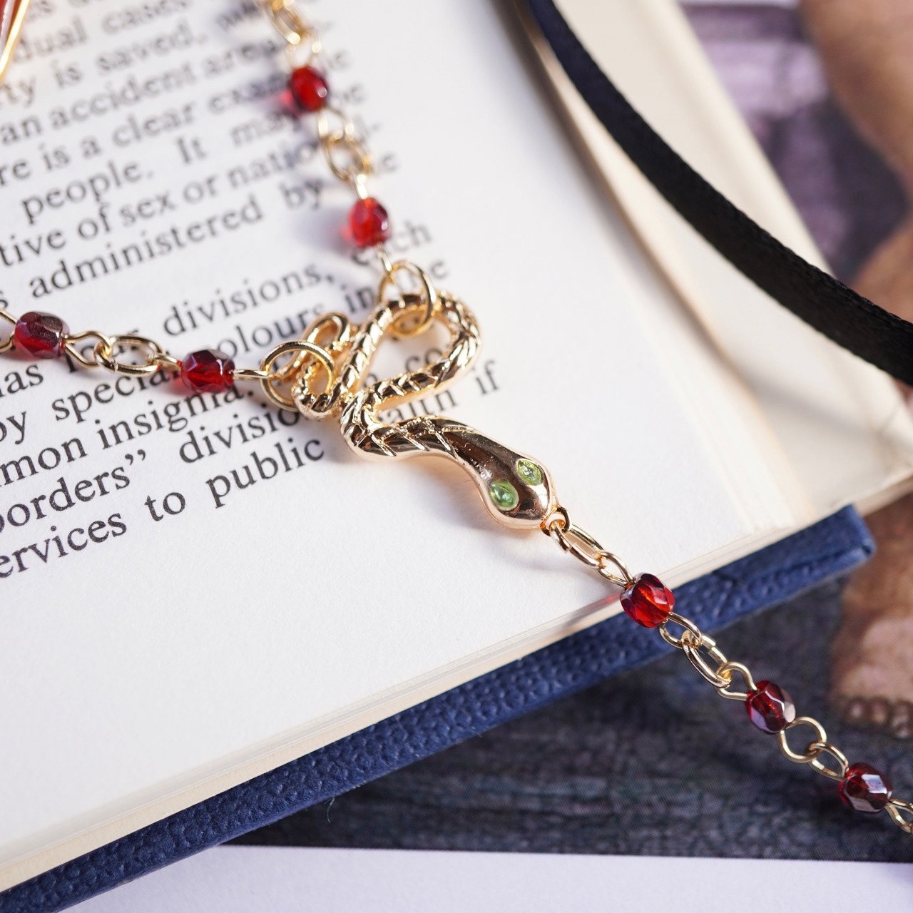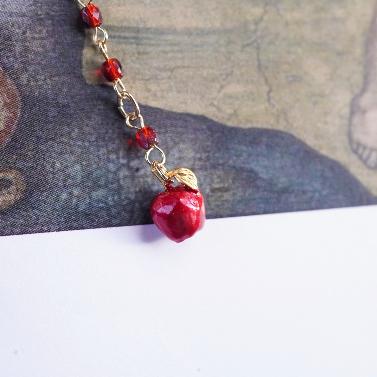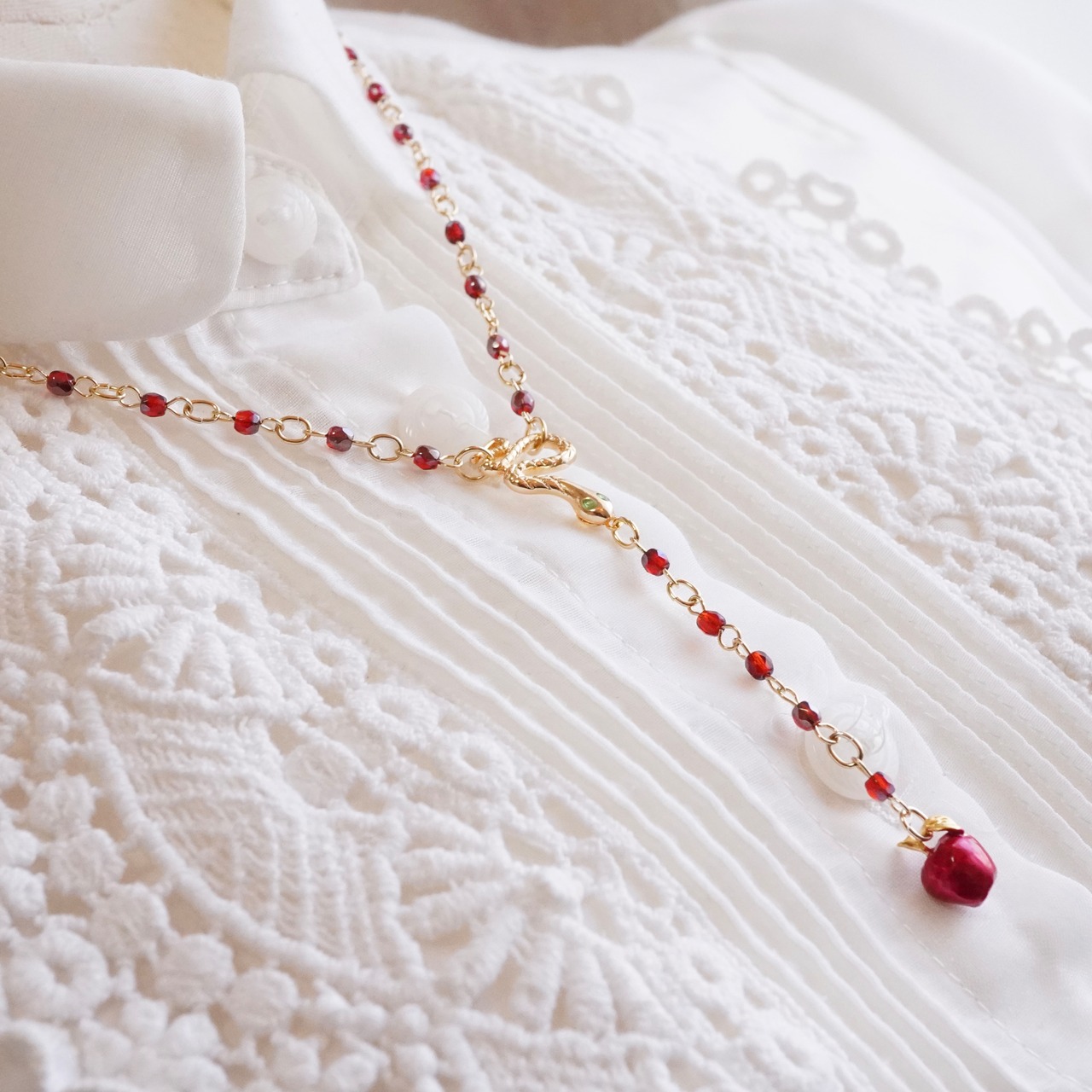 ロザリオ型のネックレスは輝きが美しいガラスビーズを使用しました。真ん中で緑の瞳の蛇が輝き、林檎が揺れます。