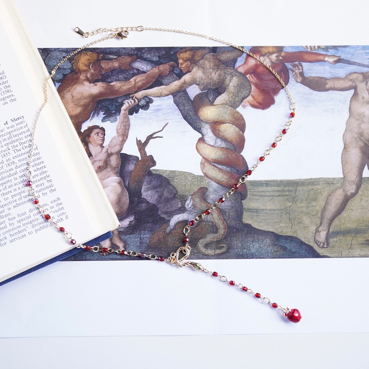 さあこの果実を食べてごらんと、アダムとイヴを唆す蛇が林檎を手渡す場面をネックレスに落とし込みました。