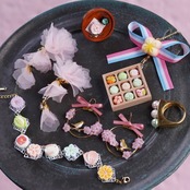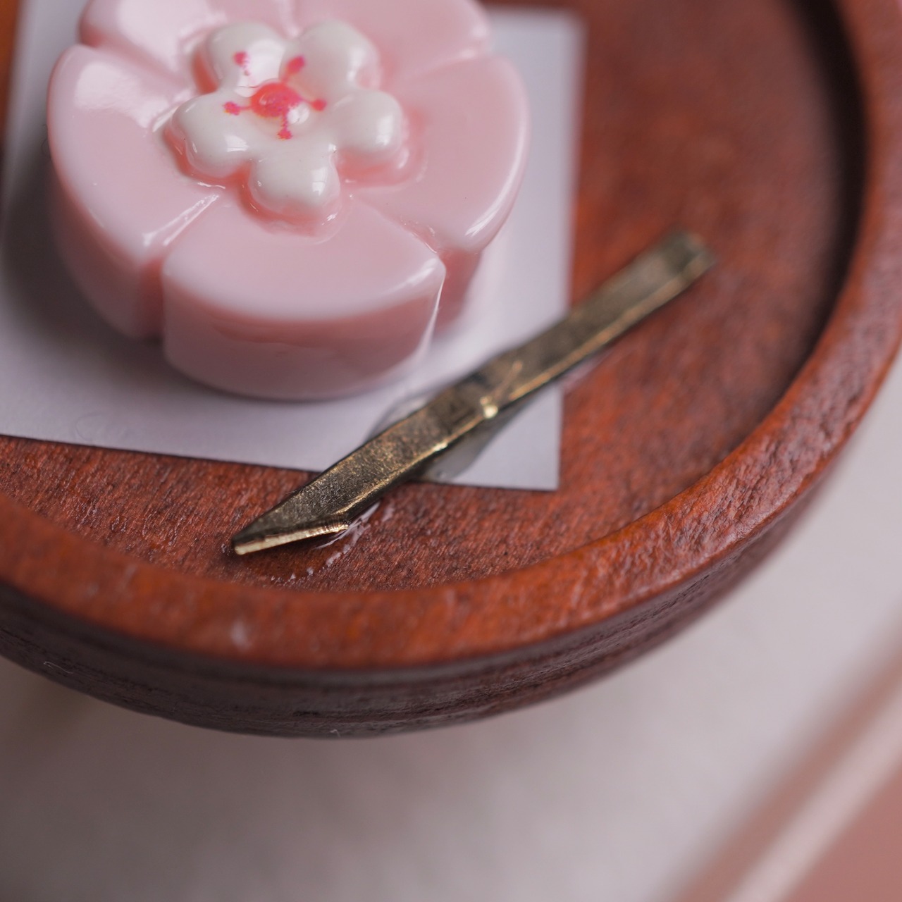 指の上に和菓子とお抹茶のお盆を再現しました。